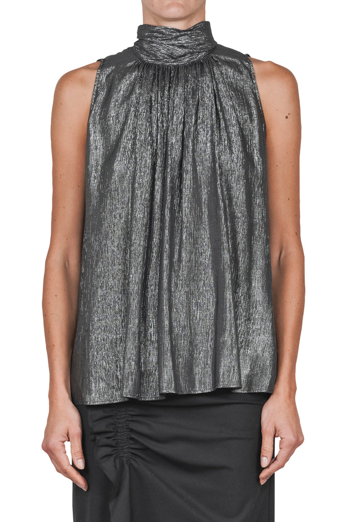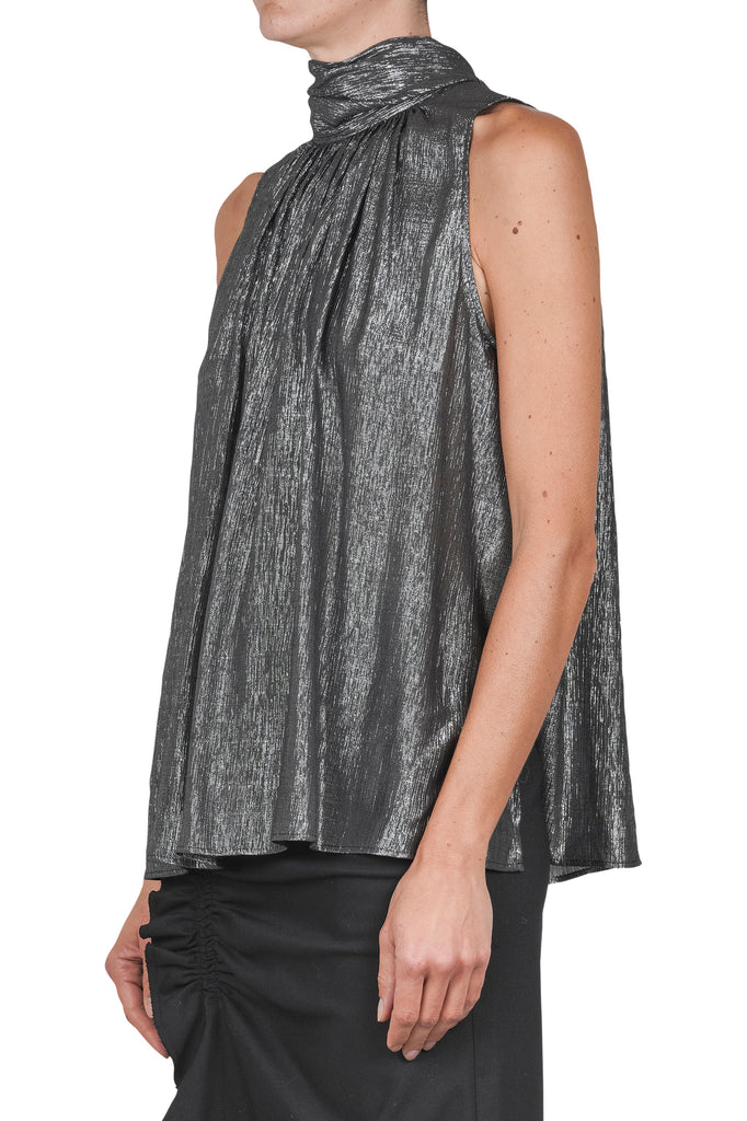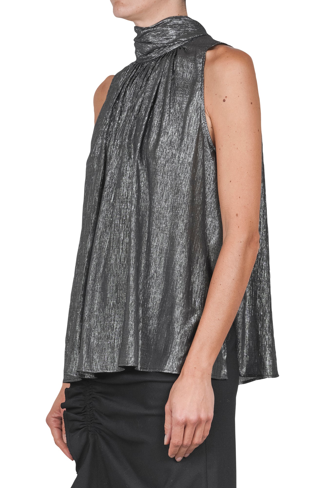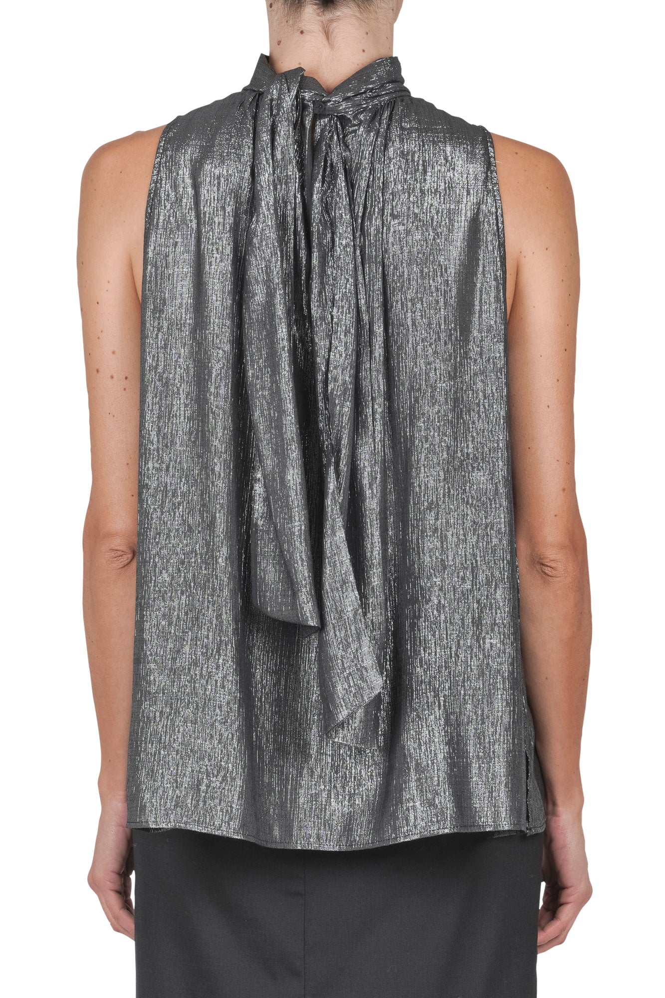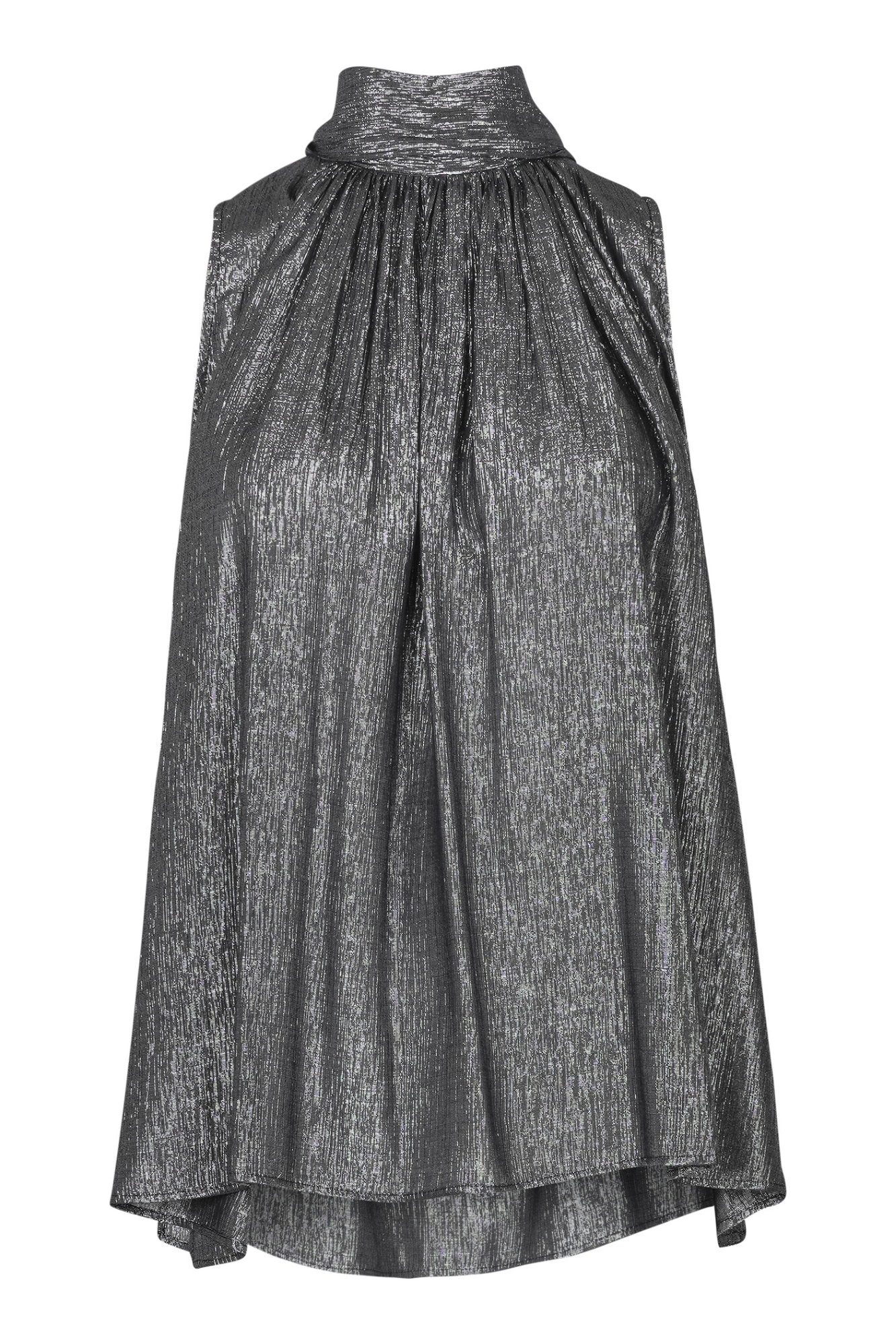 Top Josefa in tessuto metallizzato. Collo alto con nastri da annodare. Chiusura sul retro con piccolo bottone. Apertura a goccia sul retro. Smanicato. Ampi spacchi laterali. Tessuto fluido. Composizione tessuto: 84% viscosa, 16% poliammide. Vestibilità: regolare. Made in Italy, La modella indossa la taglia 40 ed è alta 175 cm. Amiamo questo top per il tocco scintillante e cool.