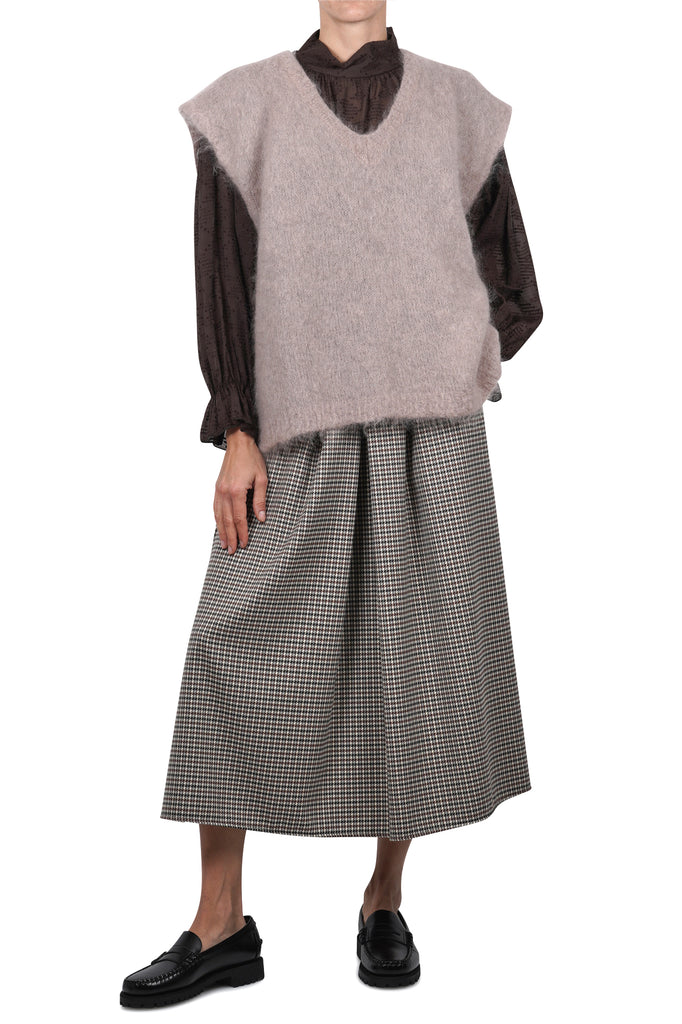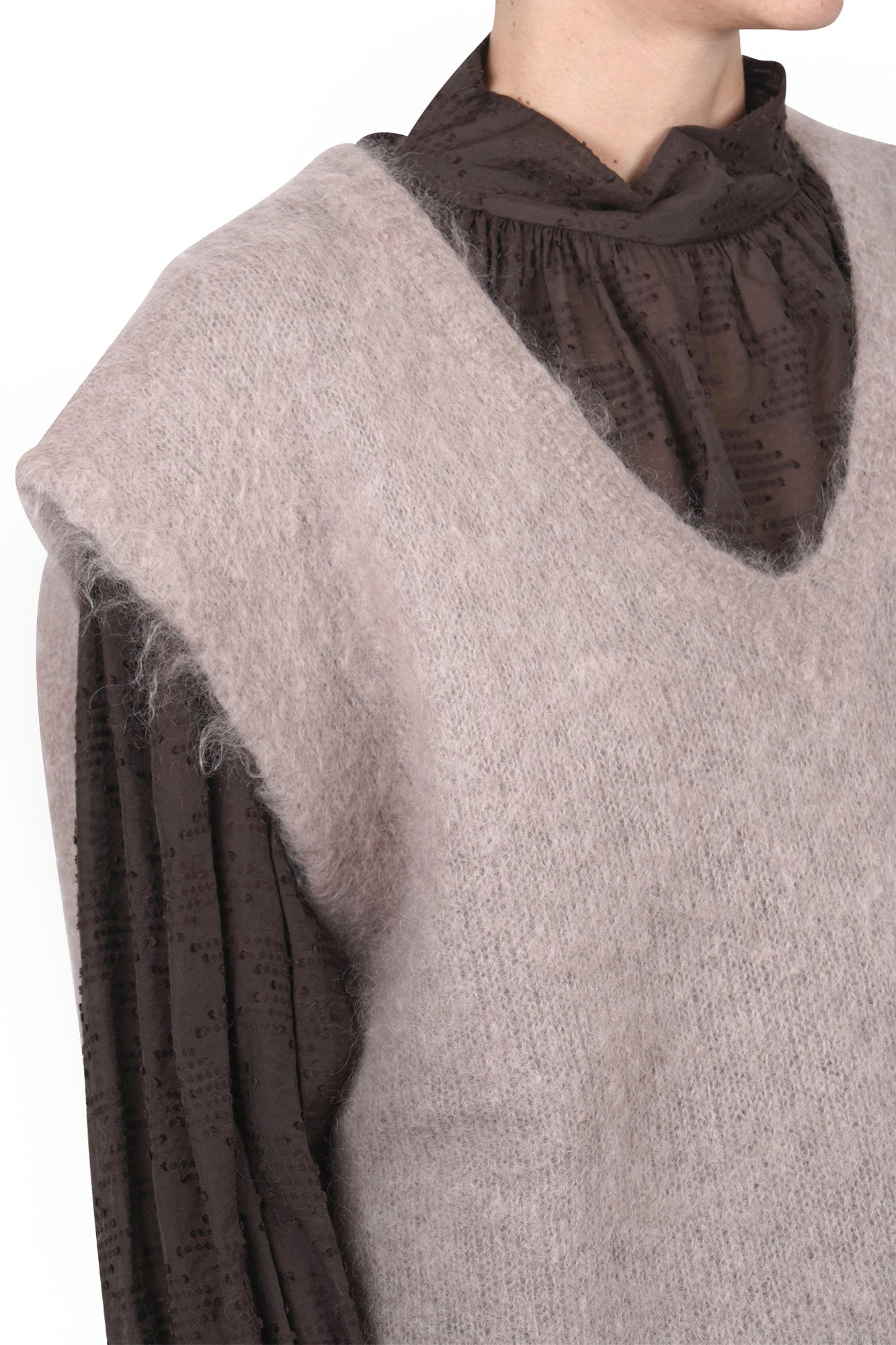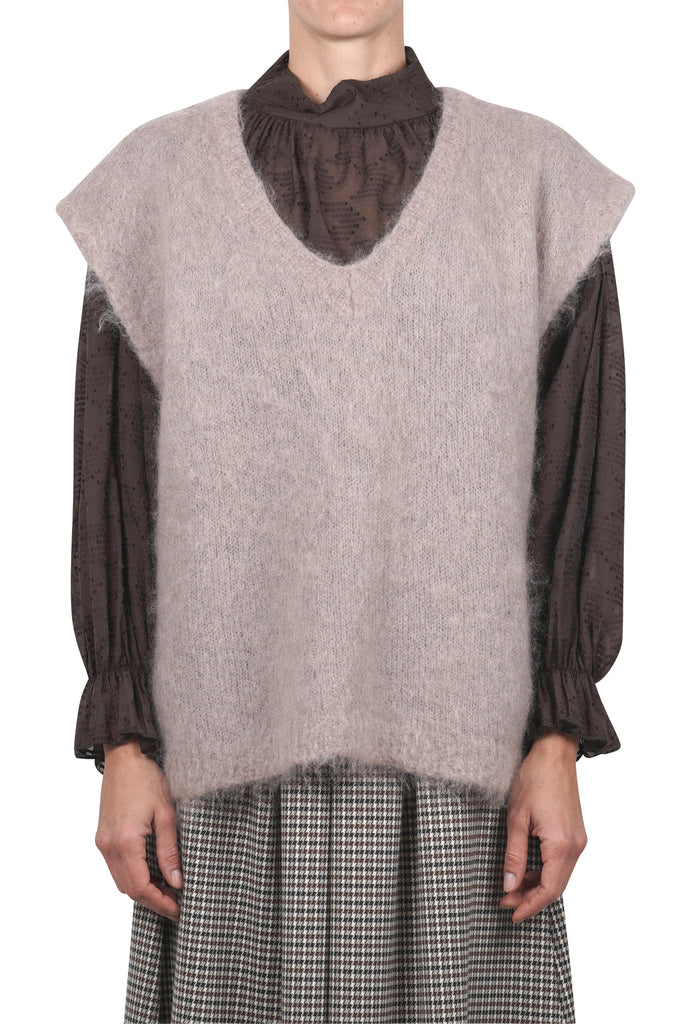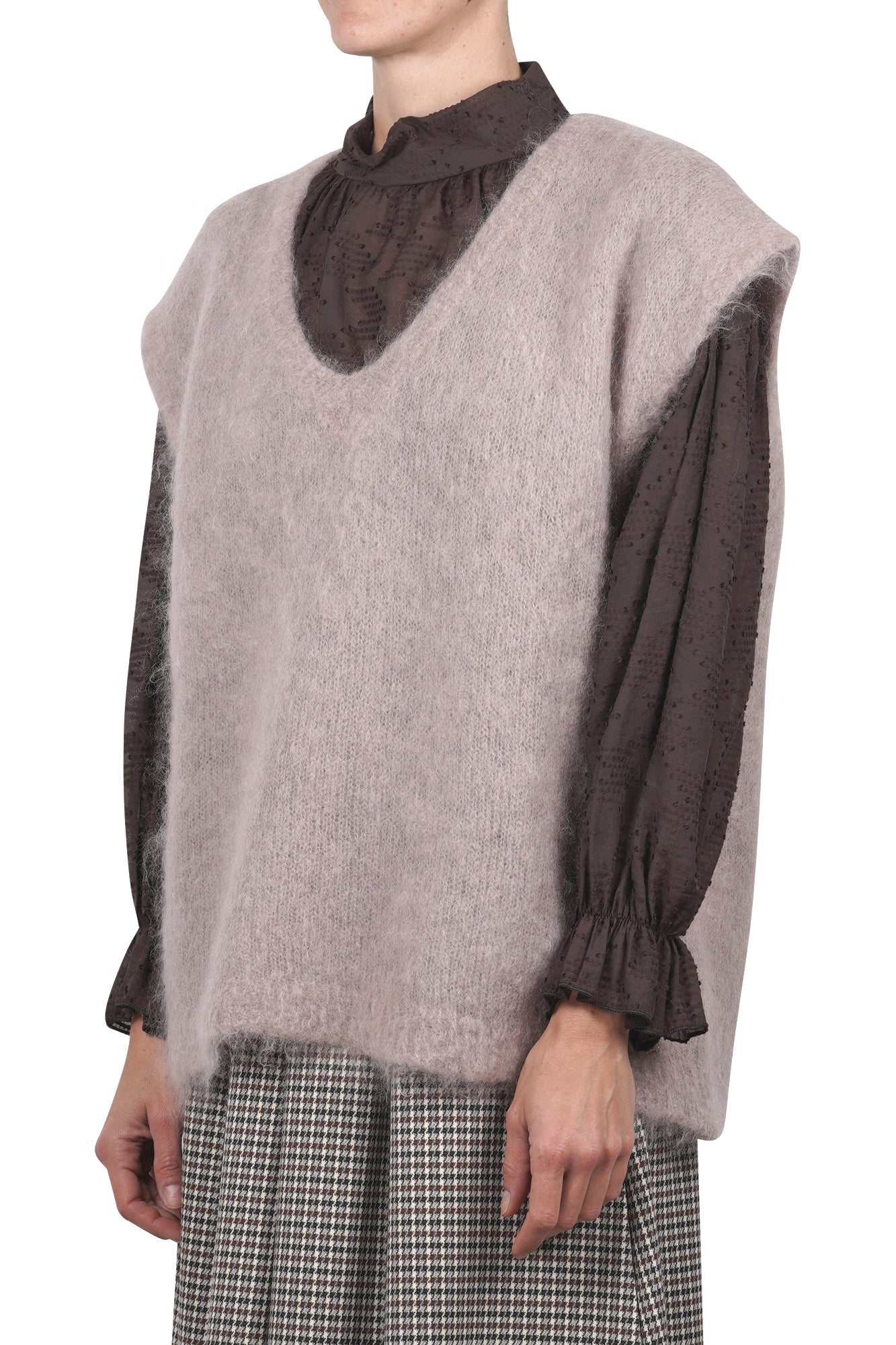 Gilet in mohair. Scollo a V. Smanicato. Taglio dritto. Charms con logo applicato lateralmente al fondo. Composizione tessuto: 80% mohair, 18% poliammide, 2% elastane. Vestibilità: ampia. Made in Italy. La modell indossa la taglia S ed è alta 175 cm. Amiamo questo gilet per il volume over e il richiamo classico con un tocco contemporaneo.