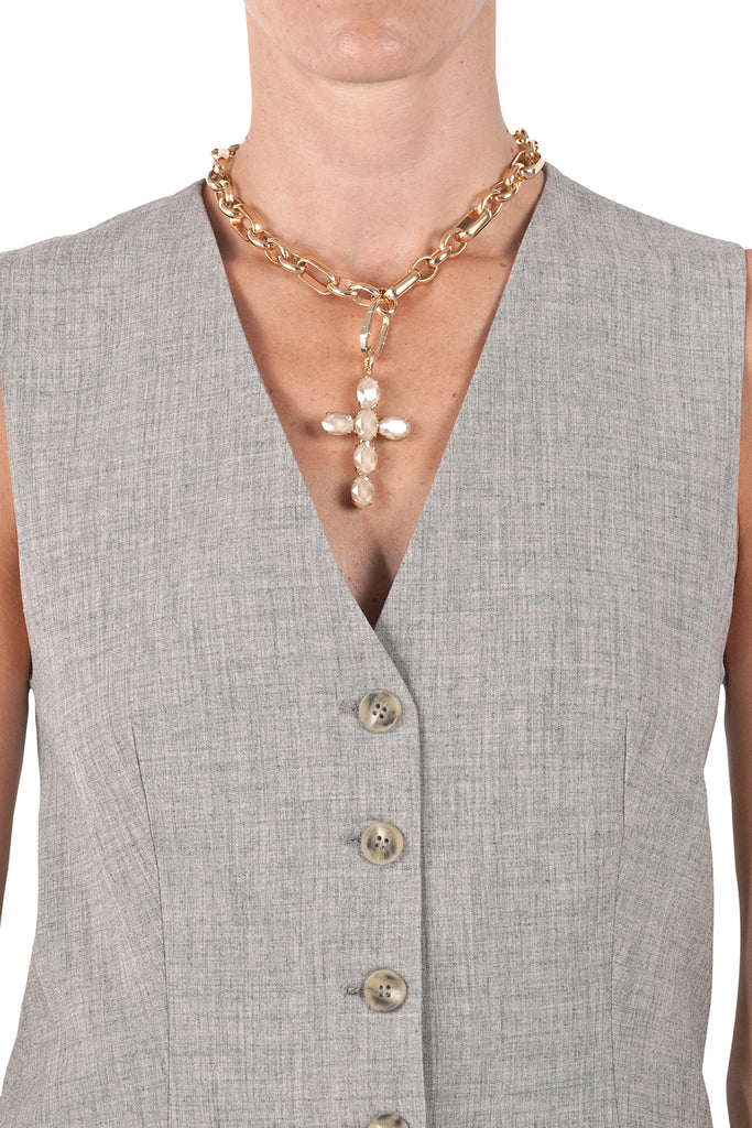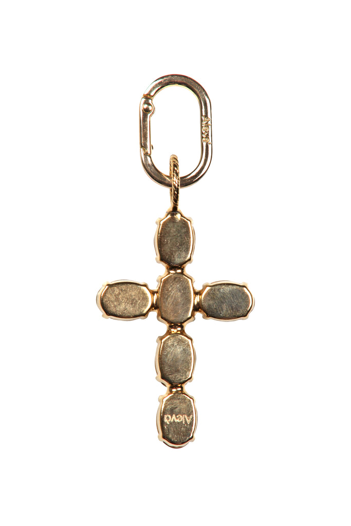 Ciondolo croce. Chiusura a moschettone. Logo inciso sulla chiusura. Cristalli incastonati. Base dorata. Realizzati a mano. Composizione: metallo e cristalli. Made in Italy.