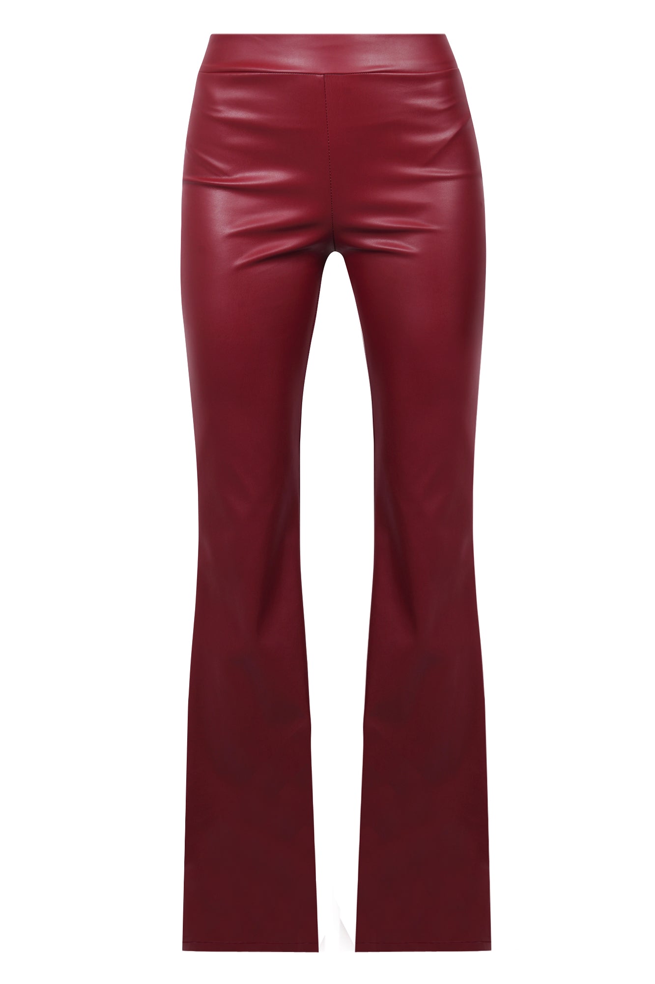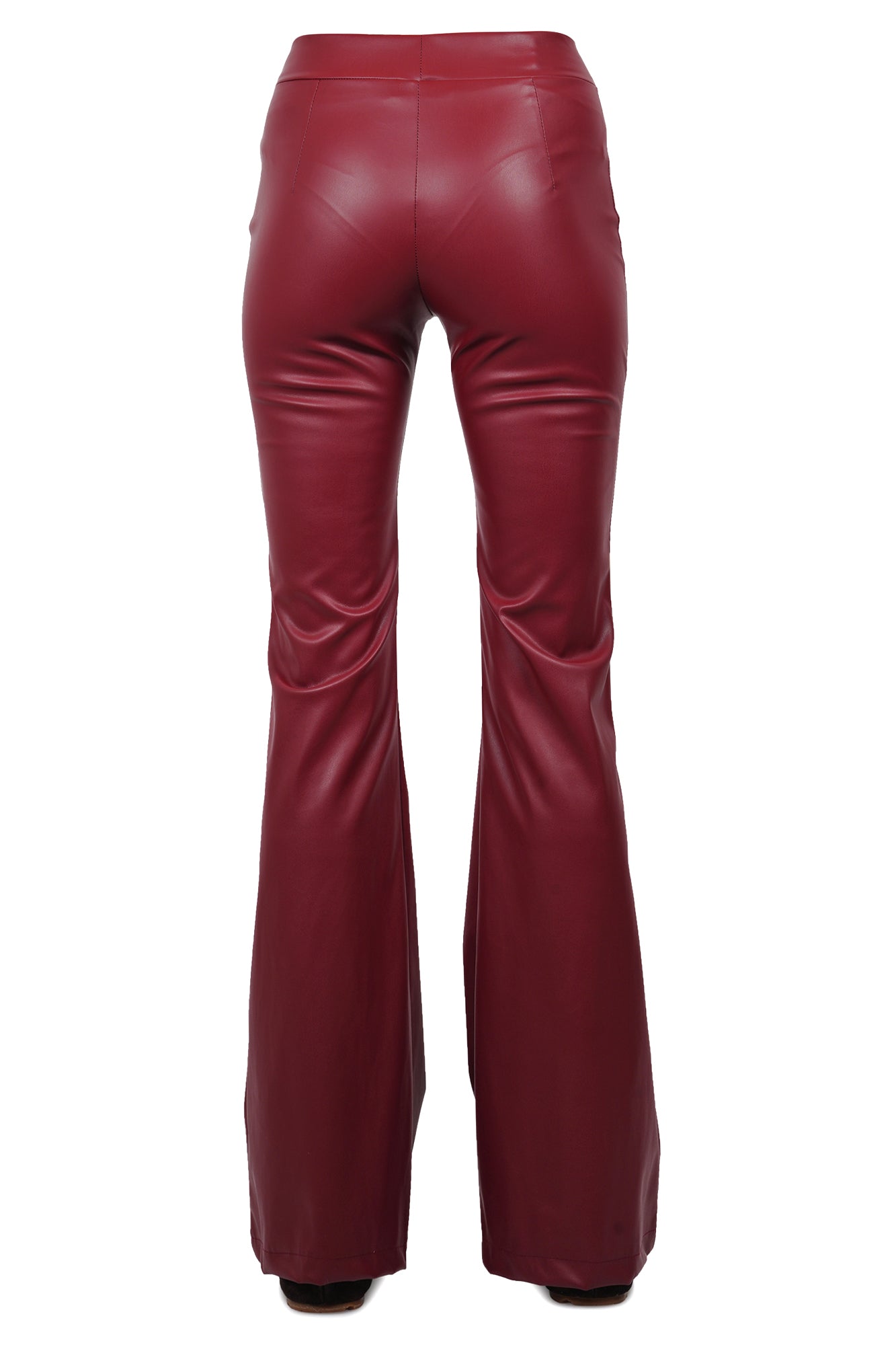 Pantaloni a zampa in ecopelle. Vita alta con elastico in vita. Gamba lunga e svasata (a zampa). Dettaglio di pinces sul retro. Larghezza fondo: 29 cm. Composizione tessuto: 50% poliuretanica; 50% poliestere. Vestibilità: regolare. Made in Italy. La modella indossa una taglia S ed è alta 175 cm. Perfetti per un look audace e di tendenza, ideali da abbinare a stivaletti con tacco.