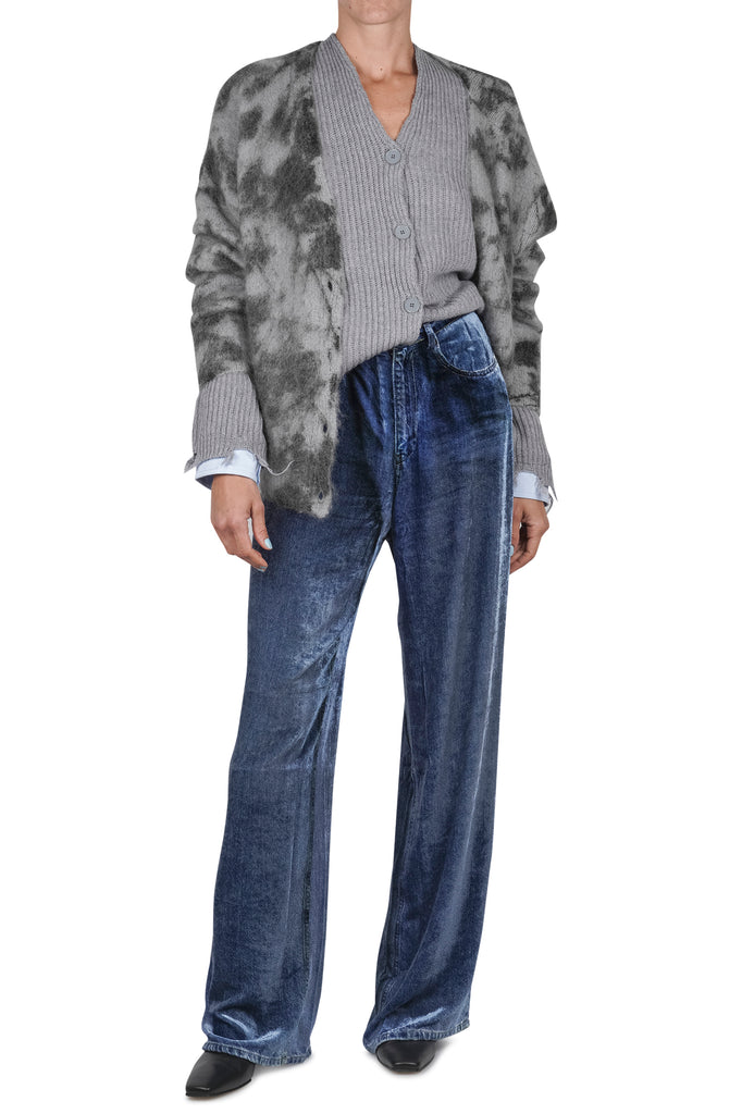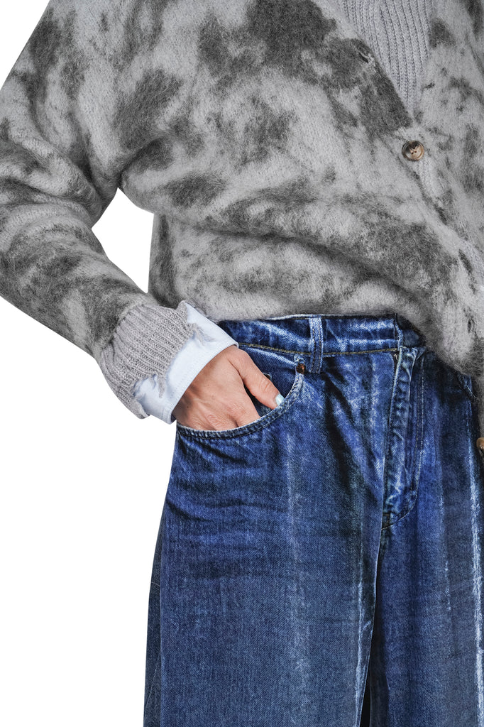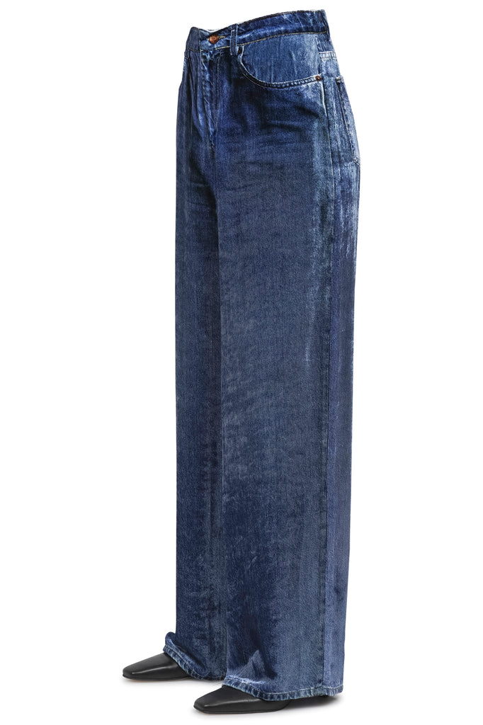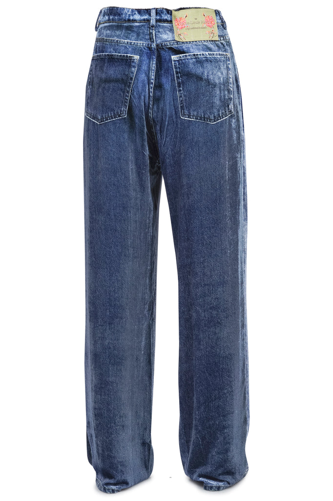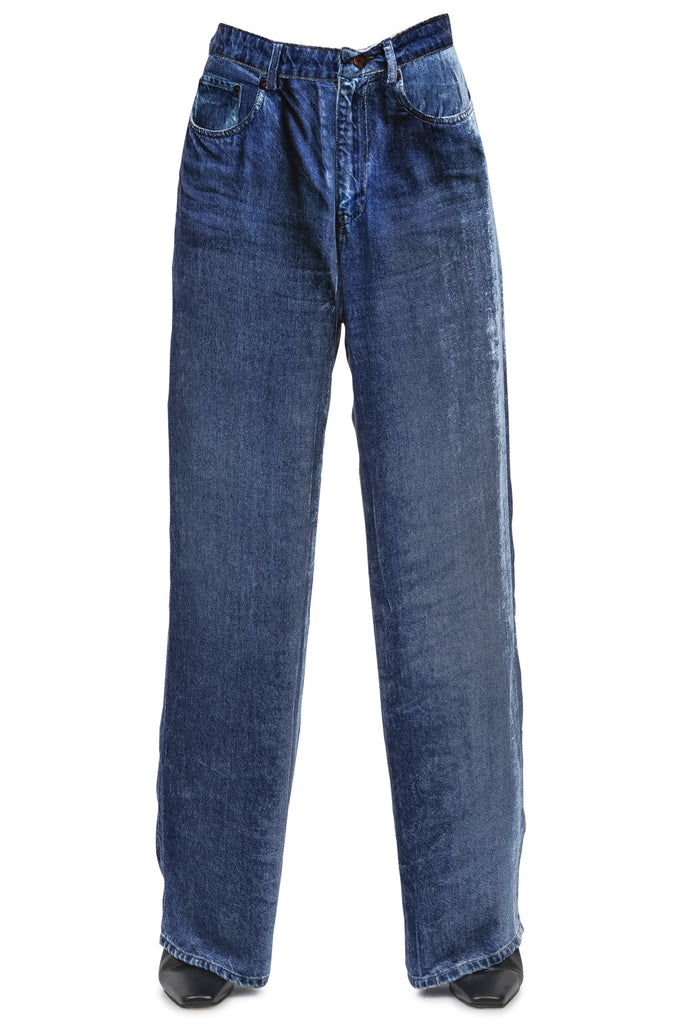 Pantalone effetto denim in vellutino. Cinque tasche. Chiusura con gancetto e zip nascosti. Cinturino con passanti. Vita alta. Gamba dritta. Stampa effetto denim. Larghezza fondo: 28cm. Composizione tessuto: 82% viscosa, 18% seta. Vestibilità: regolare. Made in Italy. La modella indossa una taglia S ed è alta 175cm. Amiamo questo pantalone per il suo tessuto e la sua stampa particolare.