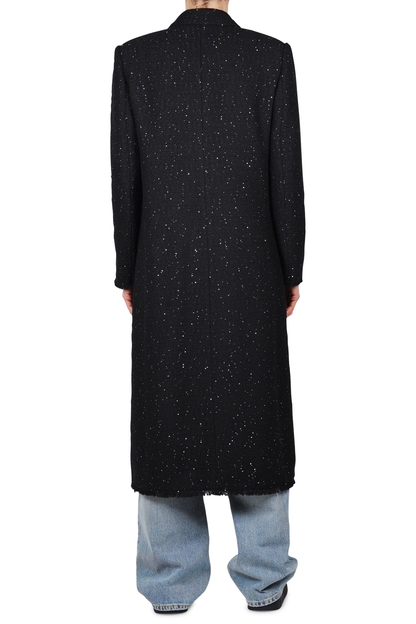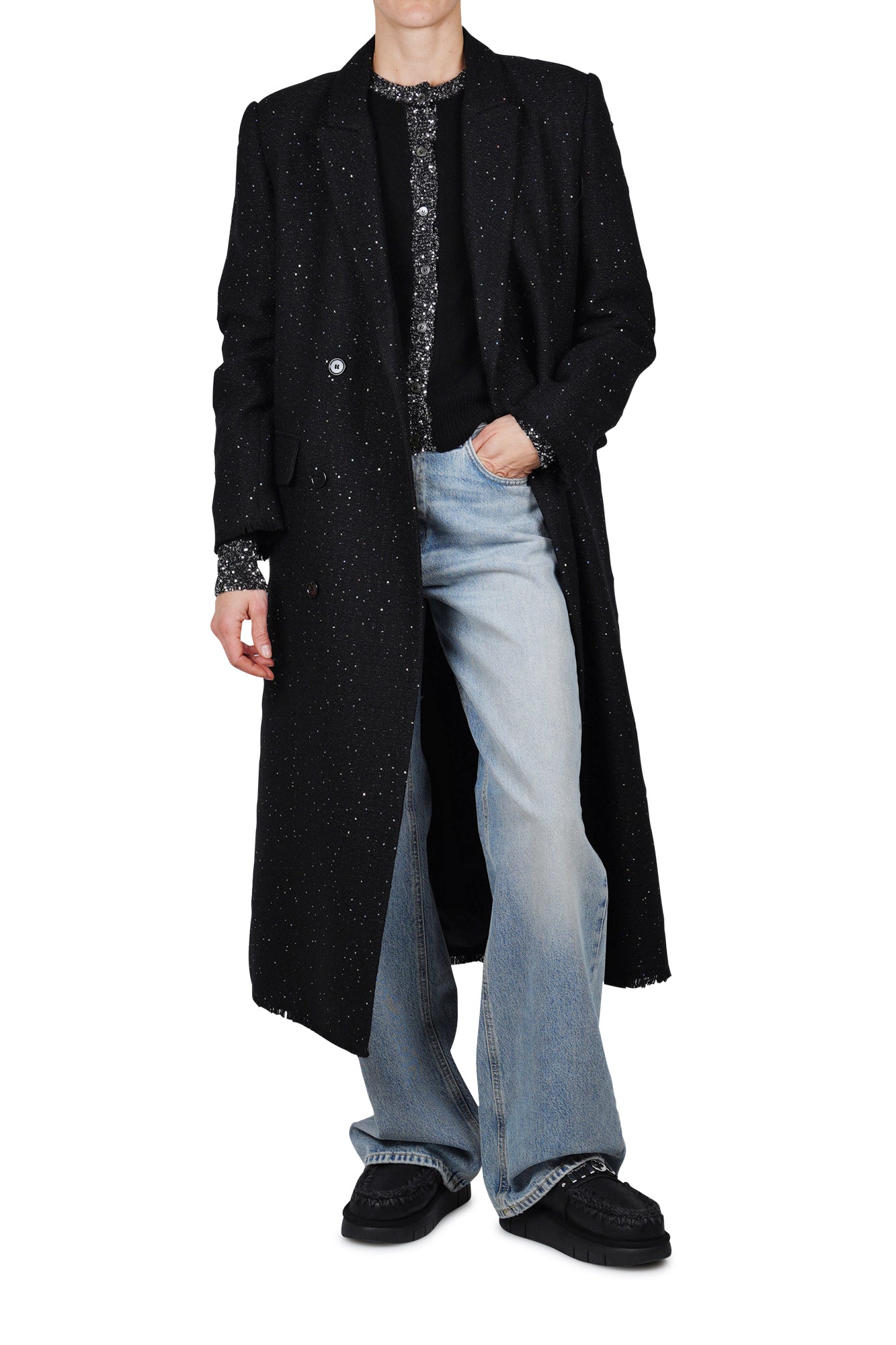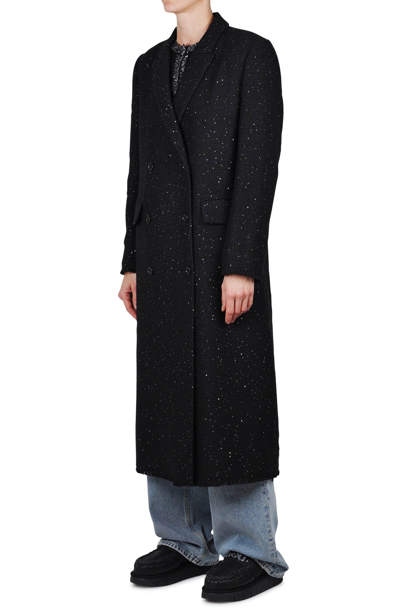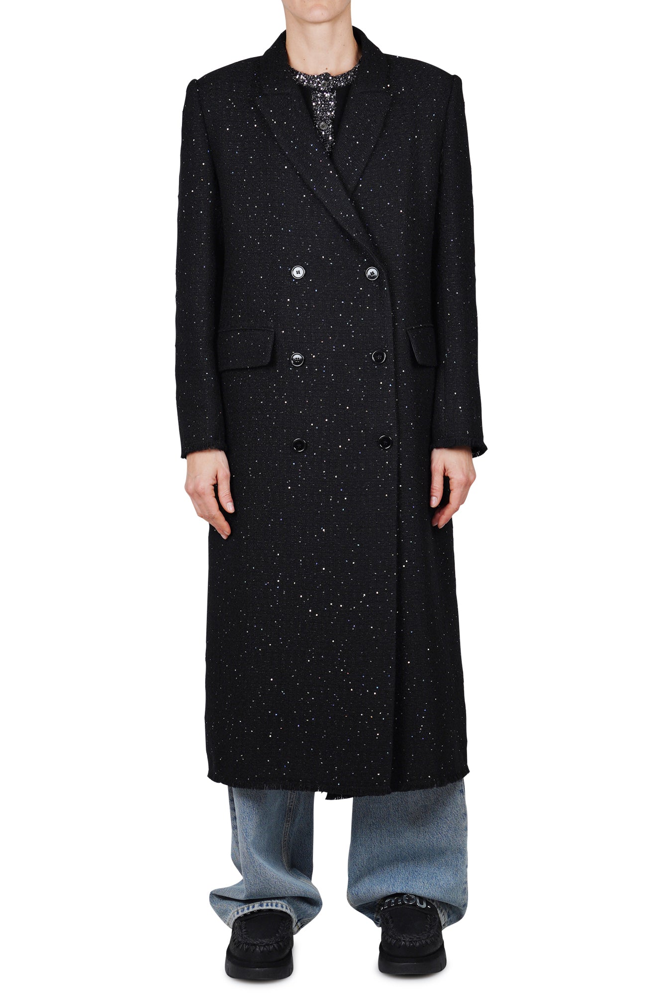 Cappotto doppiopetto con paillettes. Collo classico revers. Spalle scivolate e maniche lunghe. Polsini e fondo con effetto used/sfrangiato. Tasche con patta. Chiusura doppiopetto con bottoni. Foderato. Composizione tessuto: 40% acrilico, 30% lana, 28% poliestere, 2% altre fibre. Vestibilità: regolare. Made in Italy. La modella indossa una taglia 42 ed è alta 175 cm. Un cappotto particolare ed avvincente per i vostri look serali
