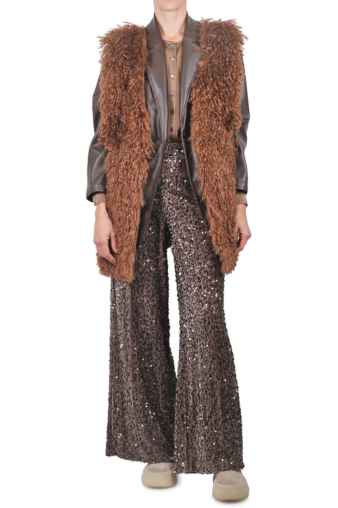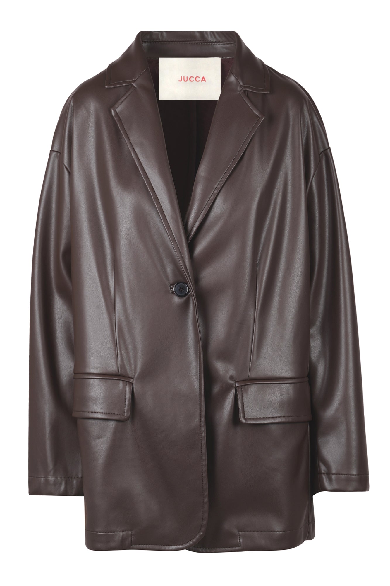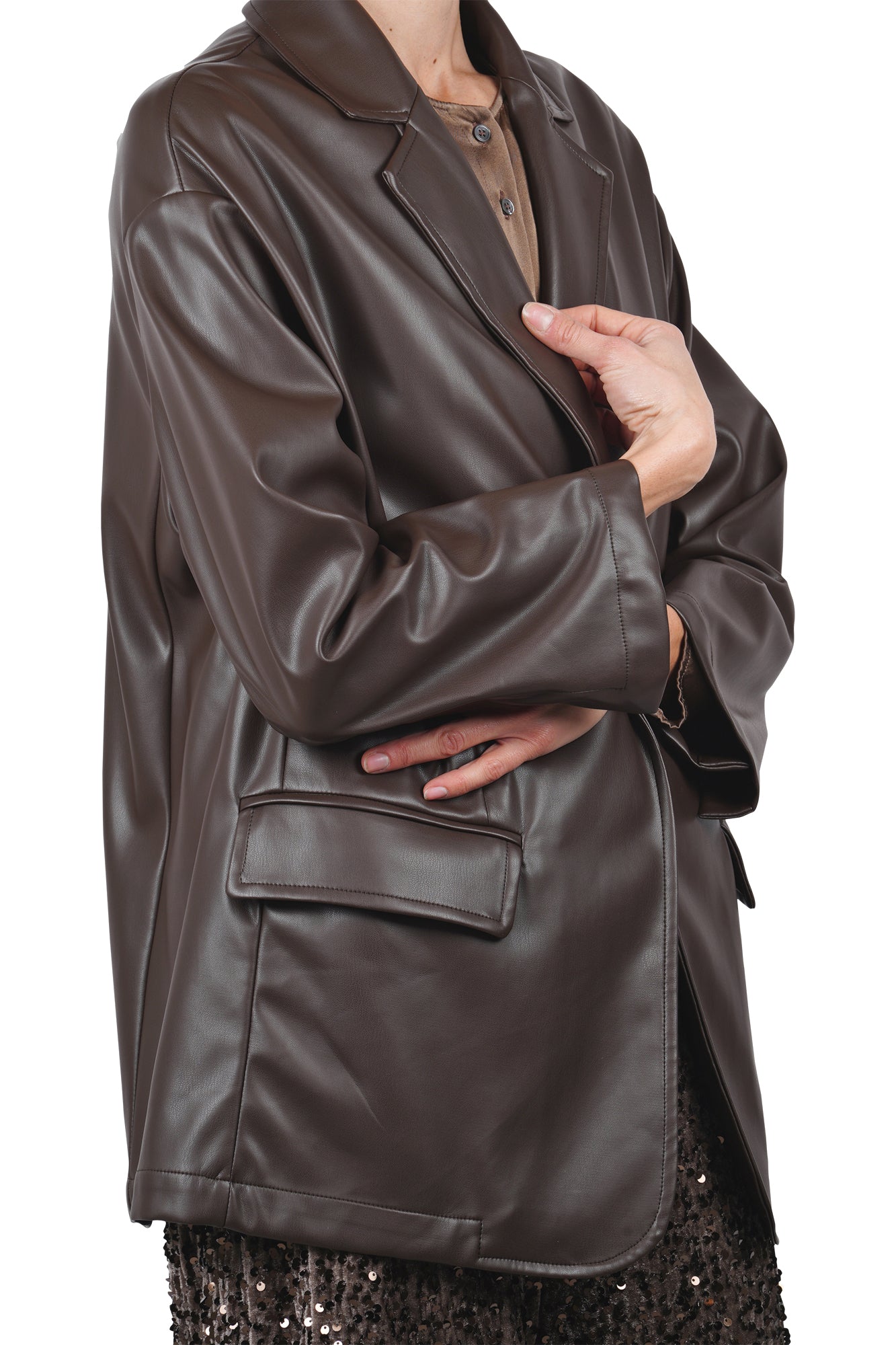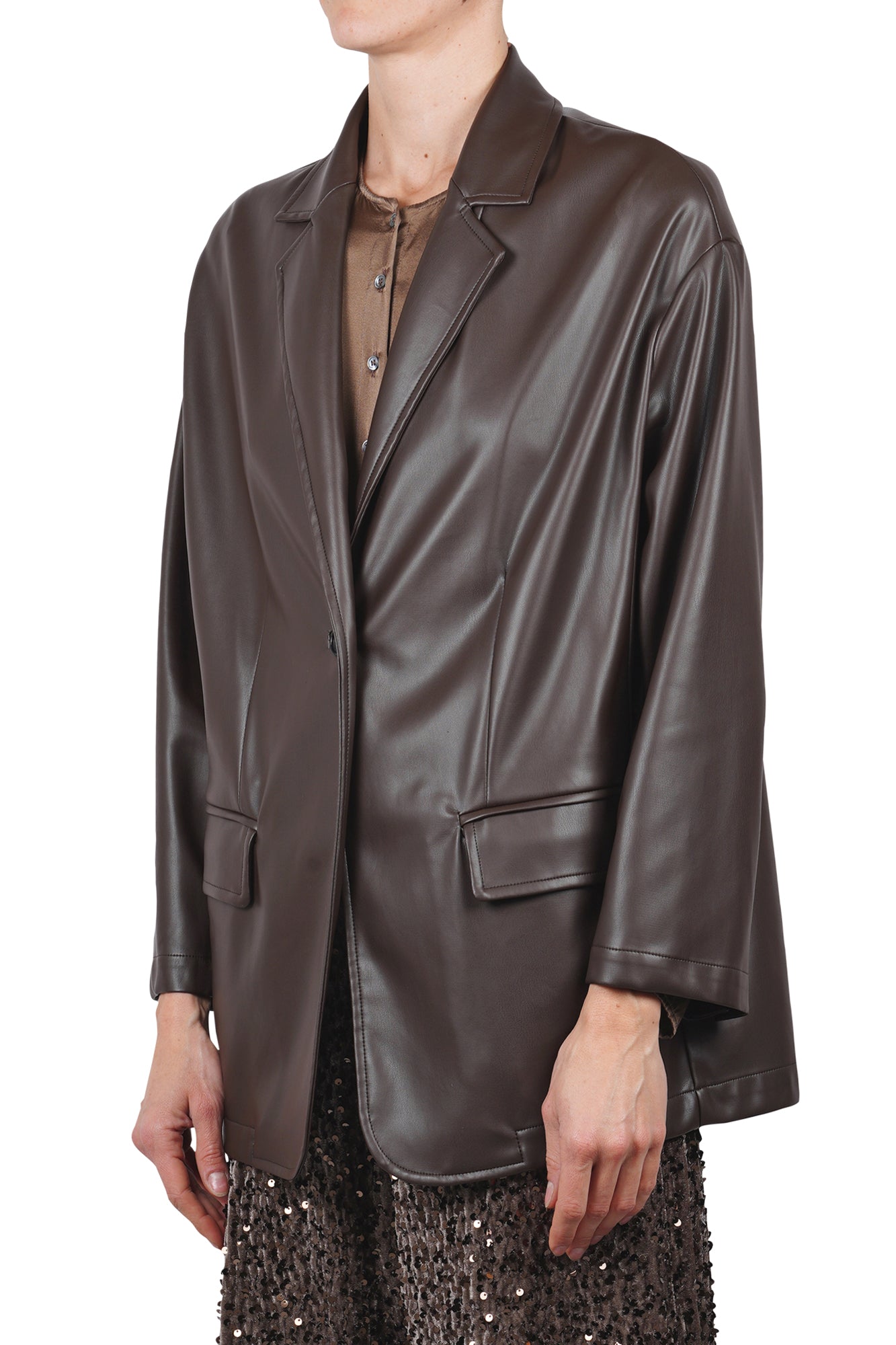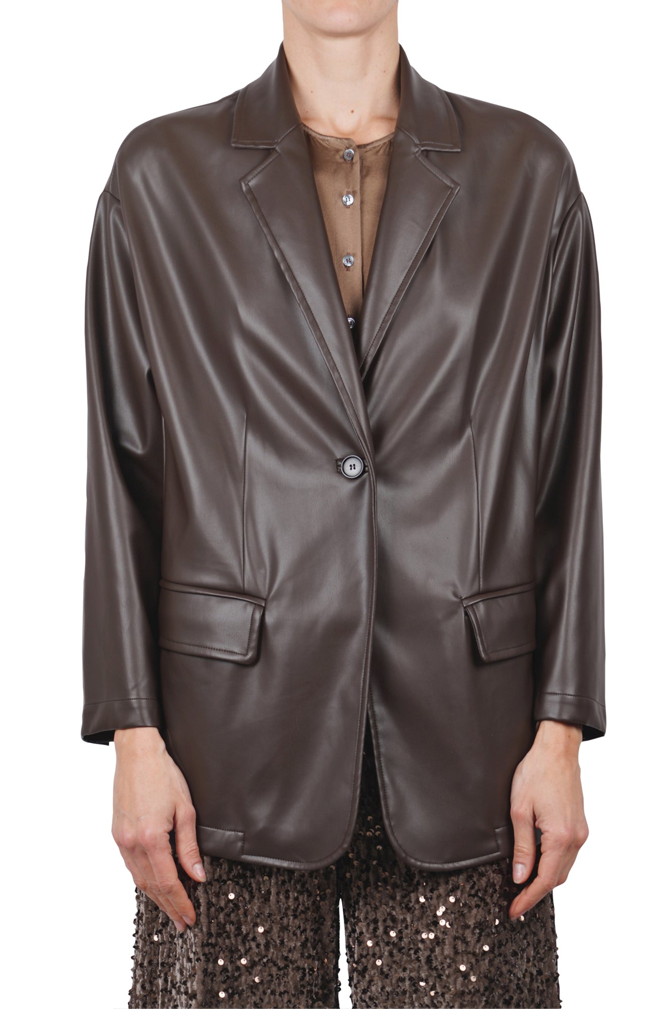 Giacca over in ecopelle. Collo con revers. Spalle scivolate. Maniche lunghe. Chiusura monopetto con un bottone. Due tasche applicate con patta sul davanti. Composizione Esterno: 100% Poliuretanica. Vestibilità: ampia. Made in Italy. La modella indossa una taglia 38 ed è alta 175 cm. Il capo perfetto per dare un tocco grintoso e contemporaneo ai tuoi outfit.