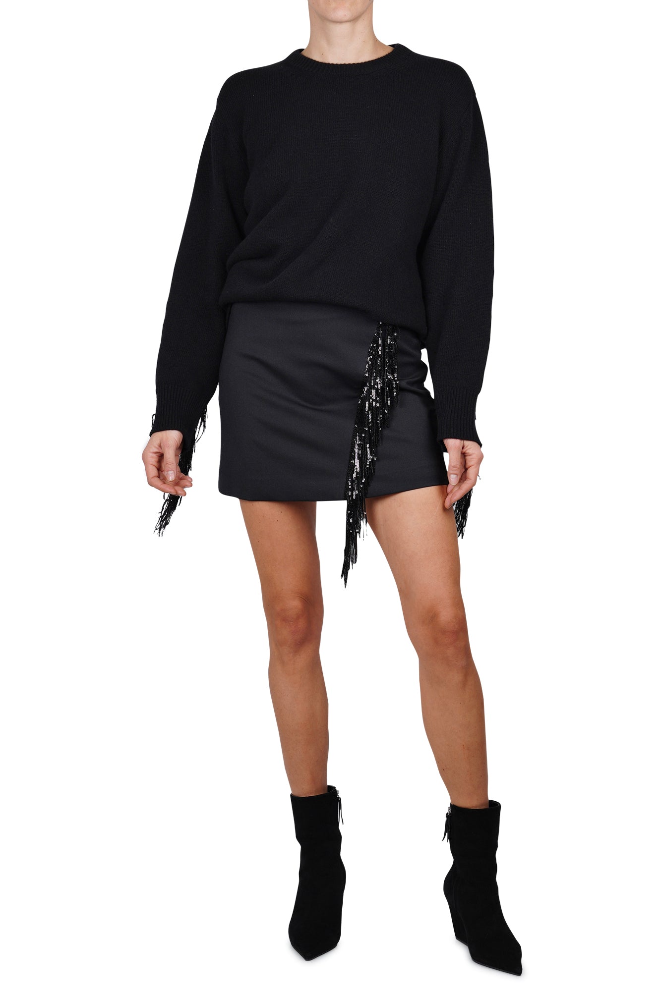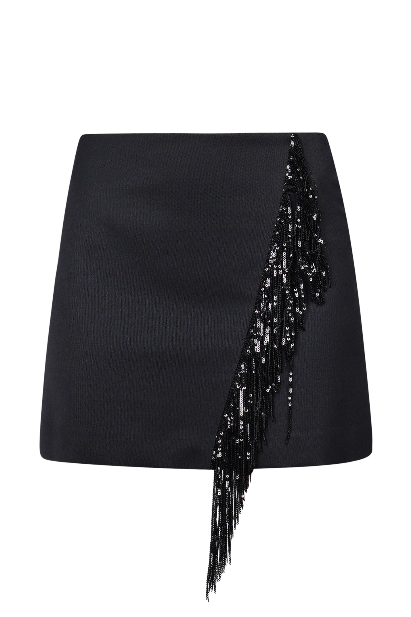 Gonna con frangia di paillettes. Chiusura con zip sul retro. Dettaglio frangia di paillettes sul davanti. Foderata. Composizione tessuto: 53% poliestere, 43% lana vergine, 4% elastan. Vestibilità: regolare. Made in Italy. La modella indossa una taglia 38 ed è alta 175 cm. Una gonna semplice ma elegante perfetta per i vostri look serali.