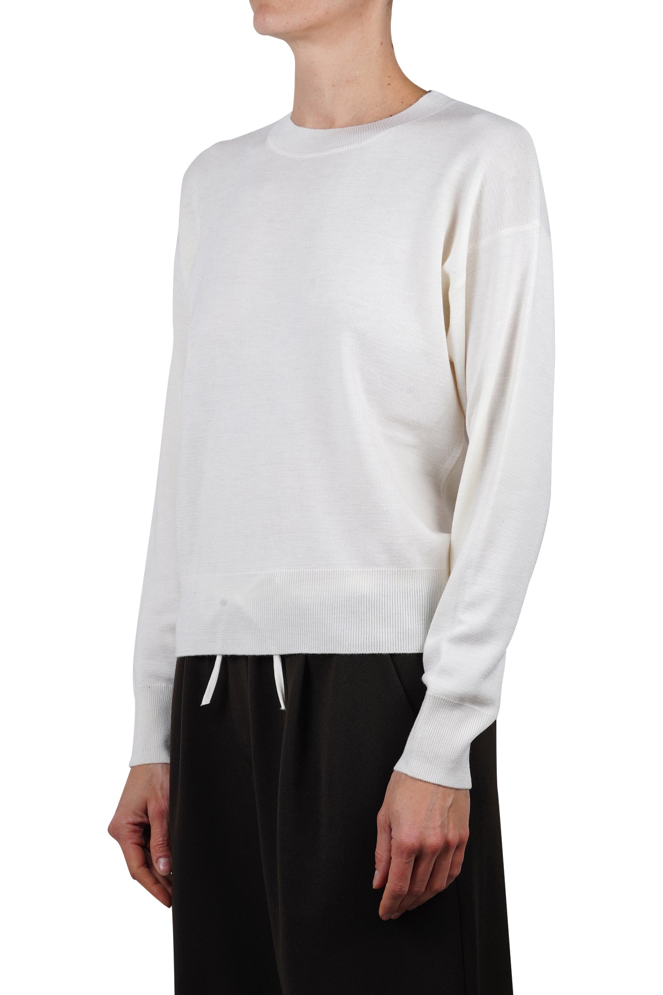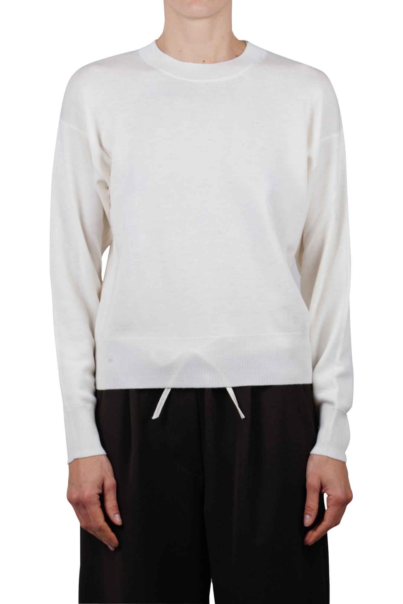 Maglia in lana vergine. Girocollo. Spalle scivolate e maniche lunghe. Collo, polsini e fondo a costine. Composizione tessuto: 100% lana vergine. Vestibilità: regolare. Made in Italy. La modella indossa una taglia M ed è alta 175 cm.