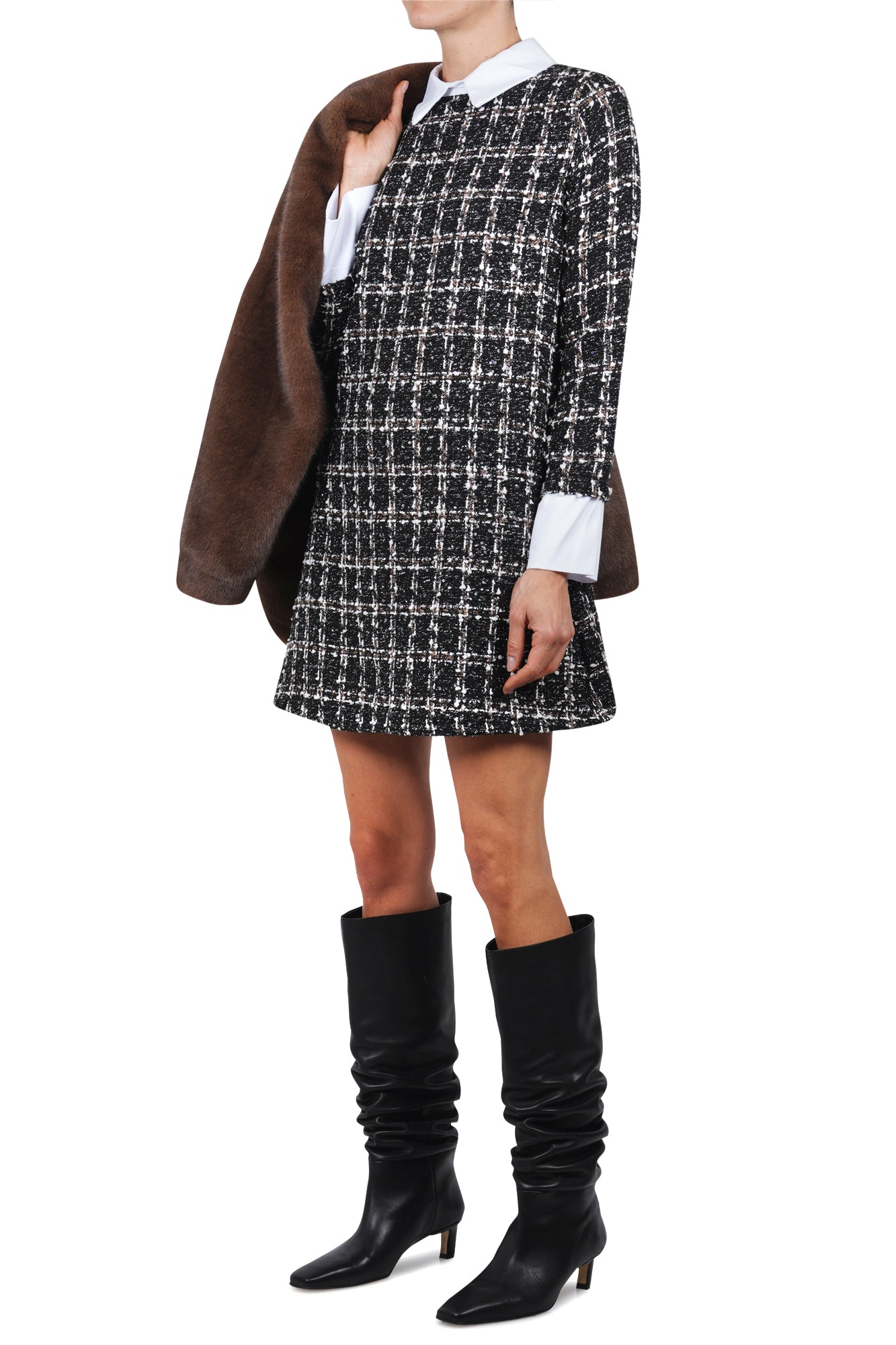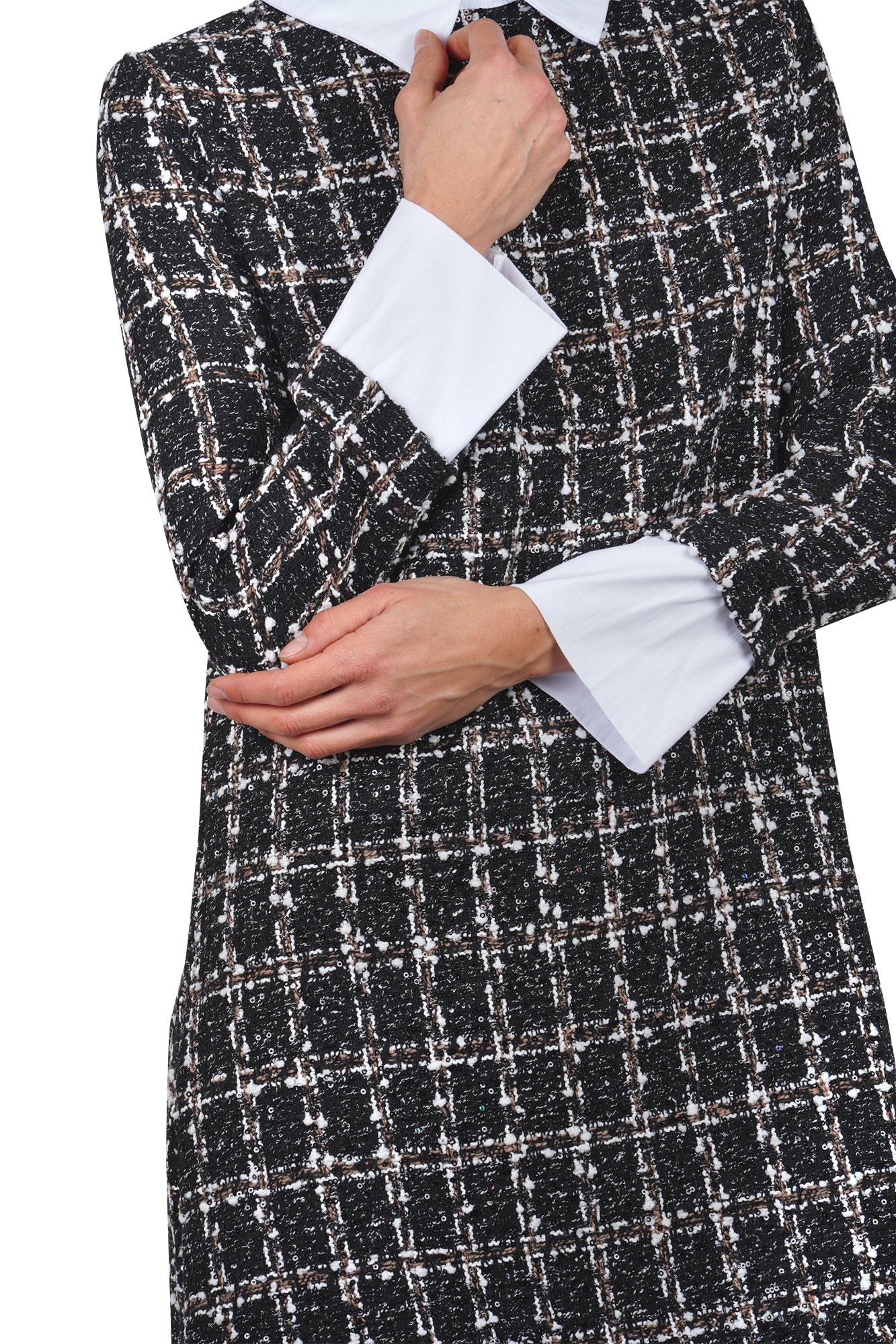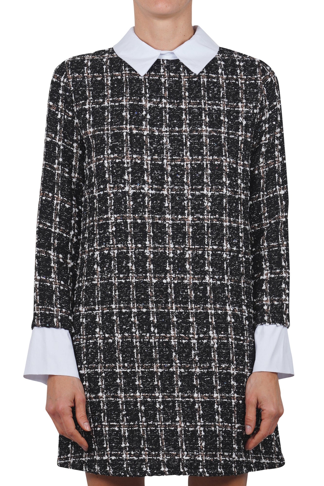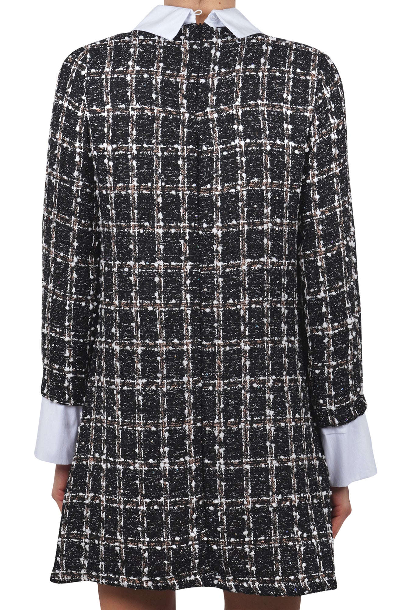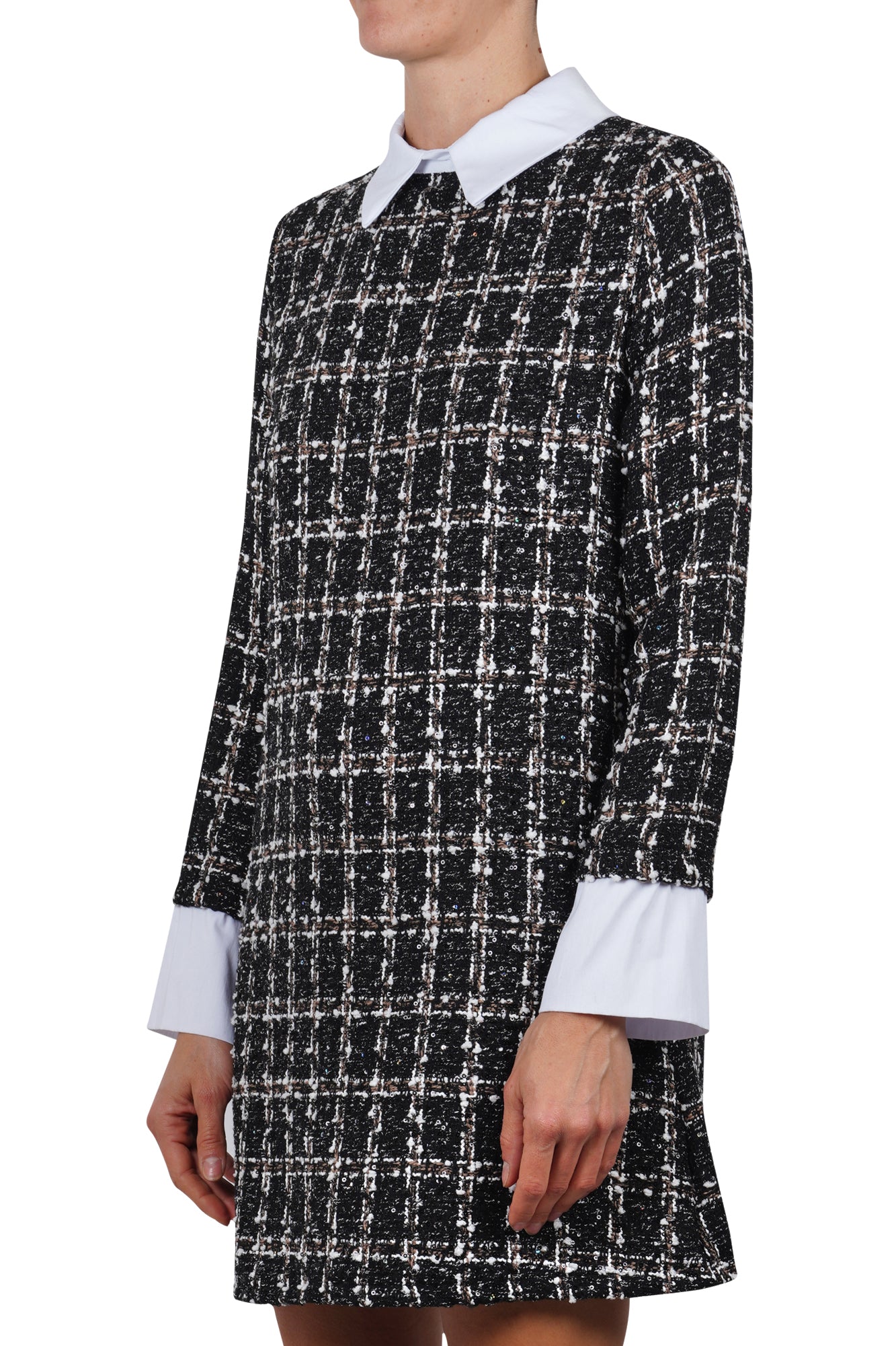 - Eleganza e stile: Realizzato in tessuto bouclé con motivo check, l'abito La Femme Blanche offre un design elegante e raffinato.