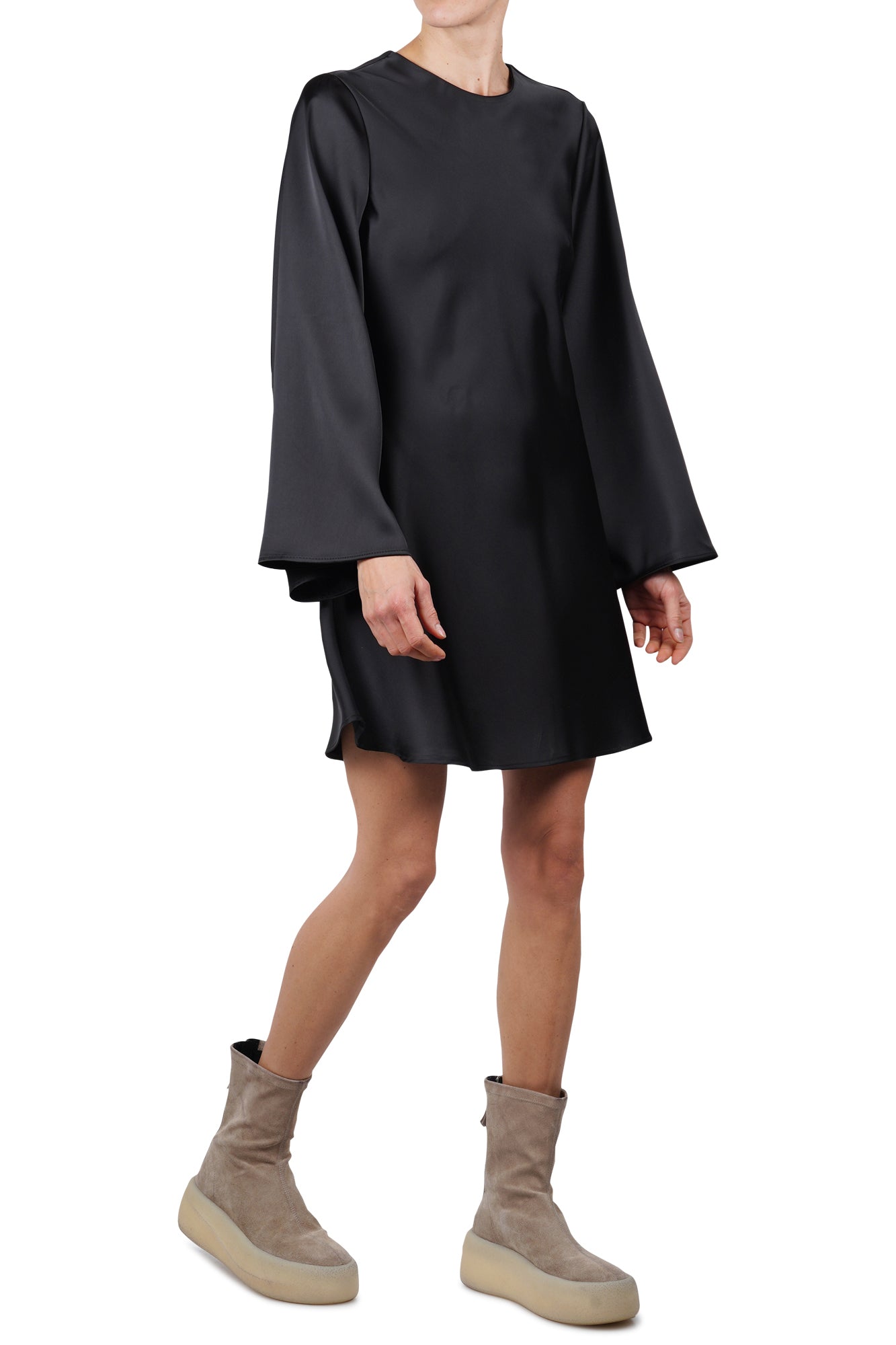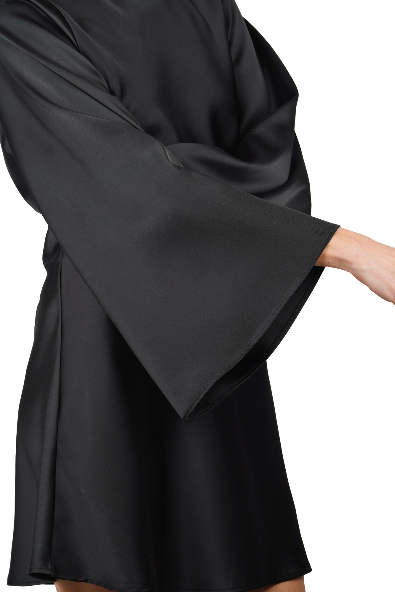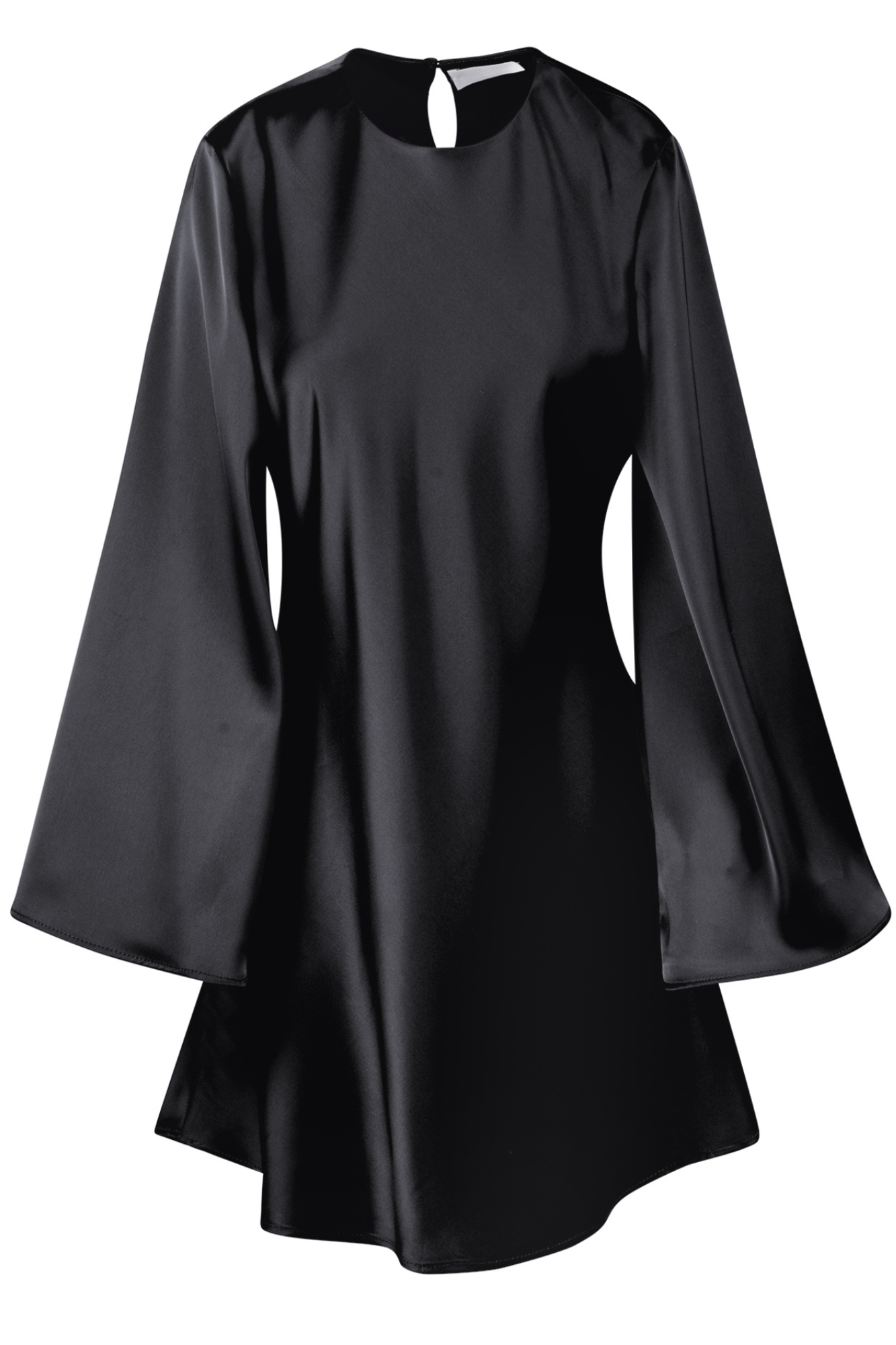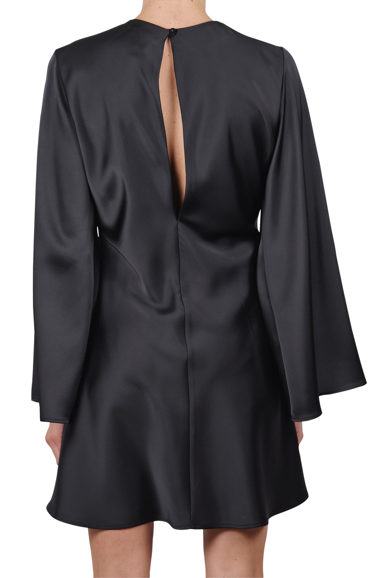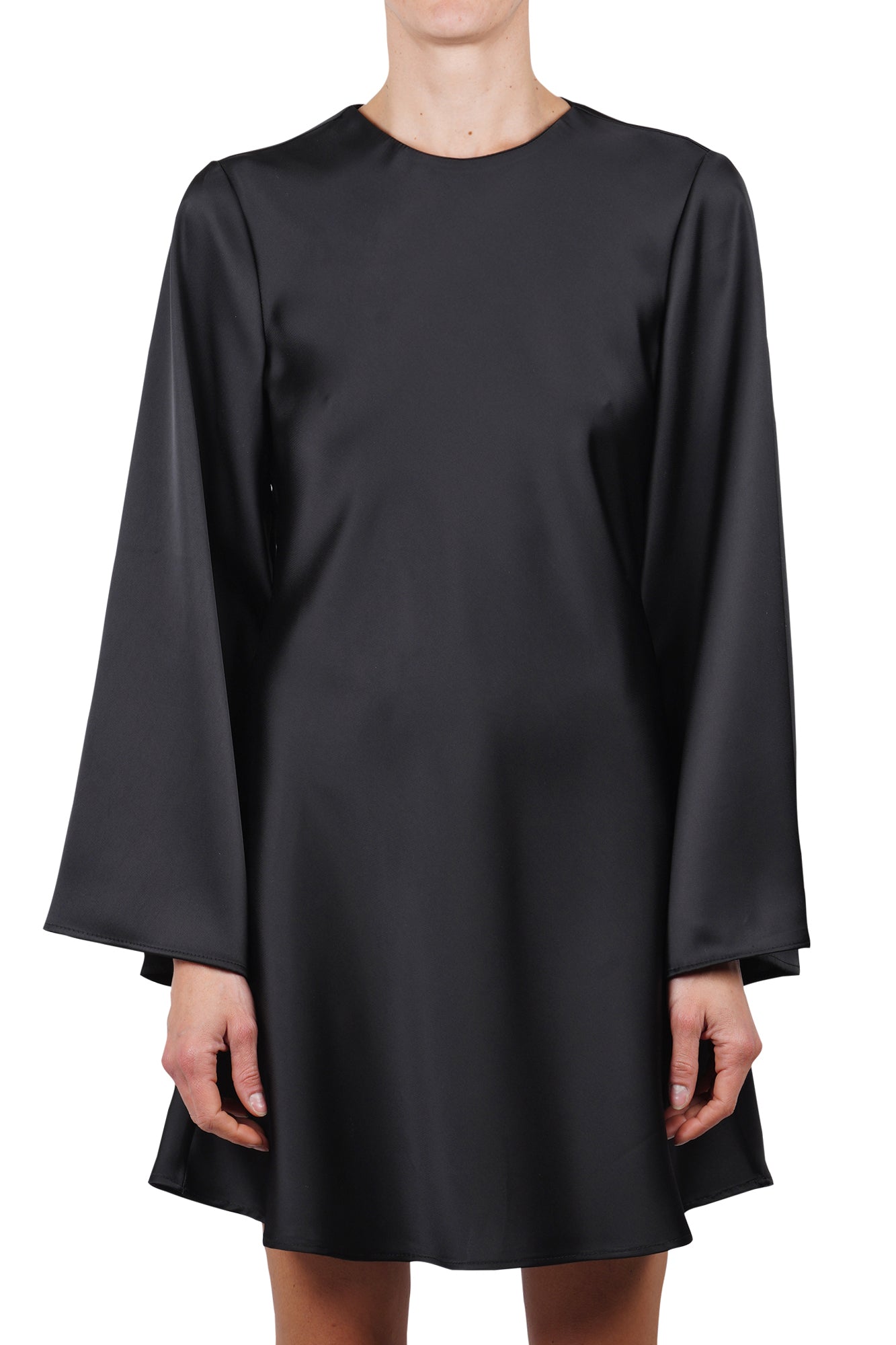 Abito corto in raso. Realizzato in tessuto fluido effetto satinato. Scollo rotondo. Maniche lunghe svasate a campana. Vestibilità dritta e linea ad A. Lunghezza mini. Composizione: 100% poliestere. Vestibilità: regolare. Made in Italy. La modella indossa una taglia unica ed è alta 175 cm. L'abito nero perfetto per un'eleganza minimal e sofisticata.