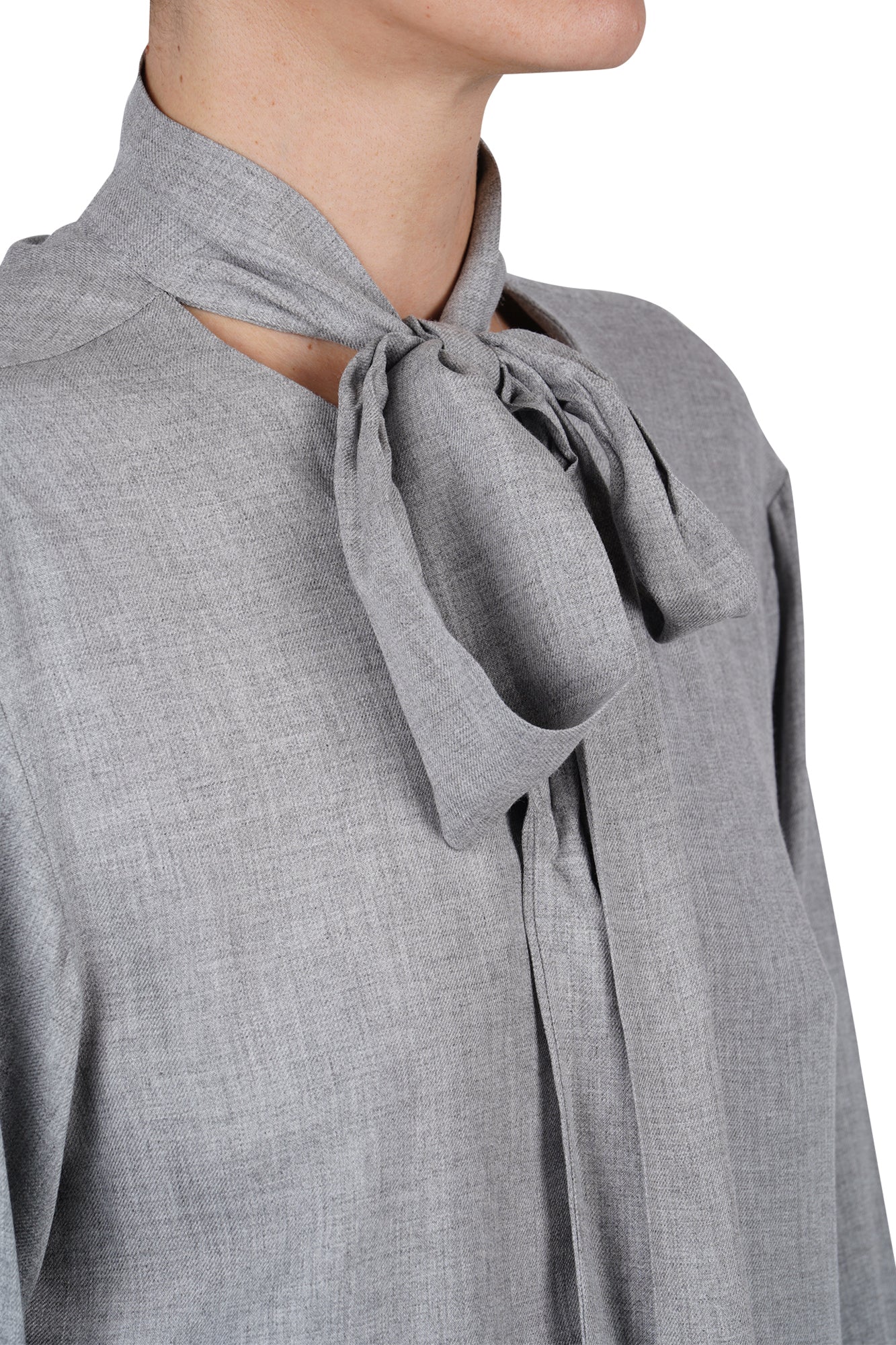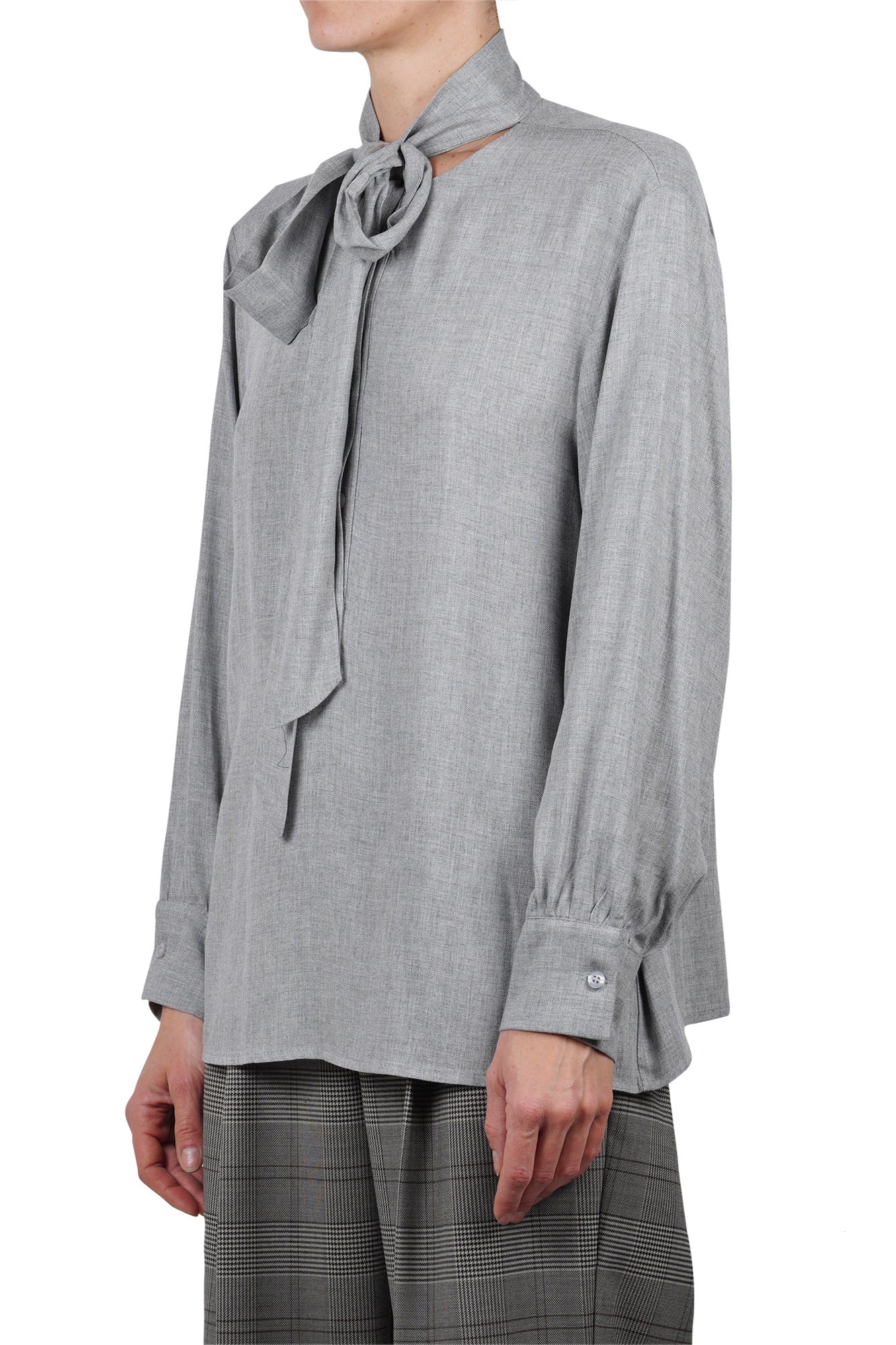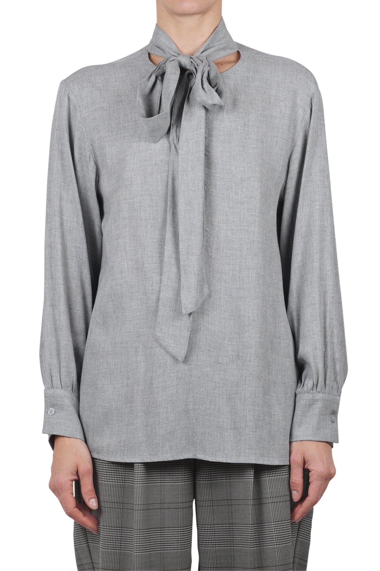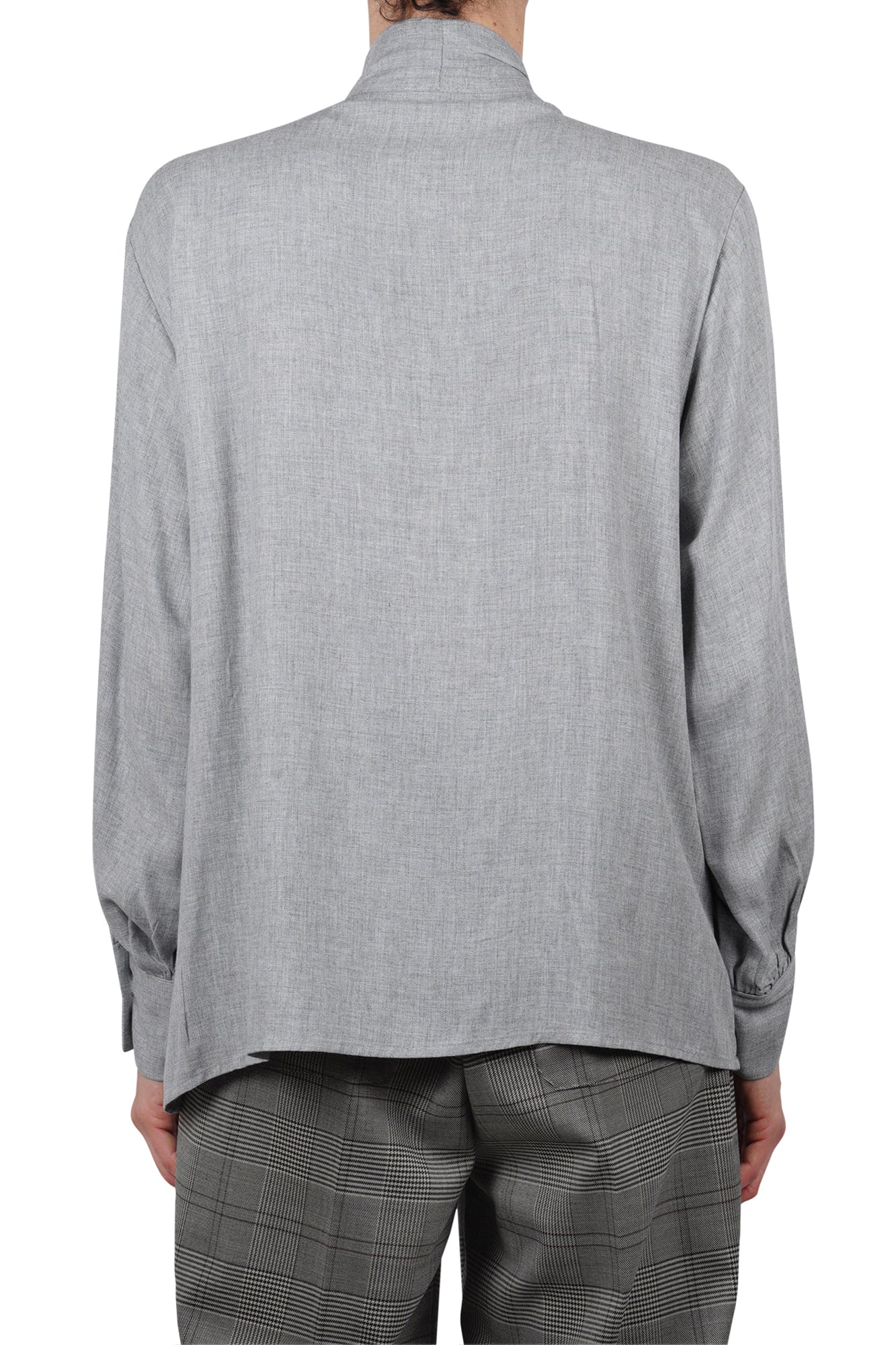 Camicia con nodo. Realizzata in tessuto effetto melange grigio. Collo alto con foulard integrato da annodare a fiocco o lasciare sciolto. Abbottonatura parziale sul davanti. Maniche lunghe con polsino e bottone. Fondo dritto. Composizione: 100% viscosa. Vestibilità: regolare. Made in Italia. La modella indossa una taglia S ed è alta 175 cm. Un capo versatile e sofisticato, perfetto per l'ufficio o per un look elegante da sera.