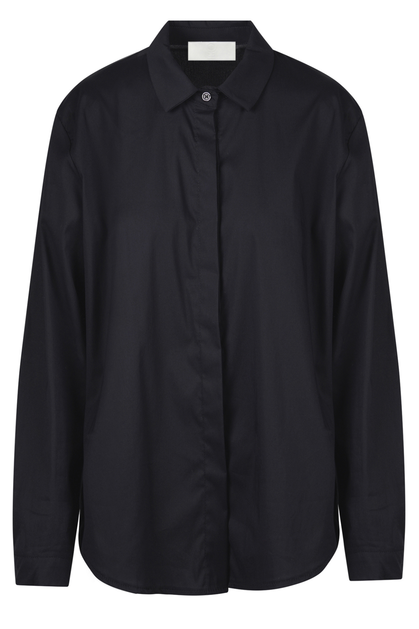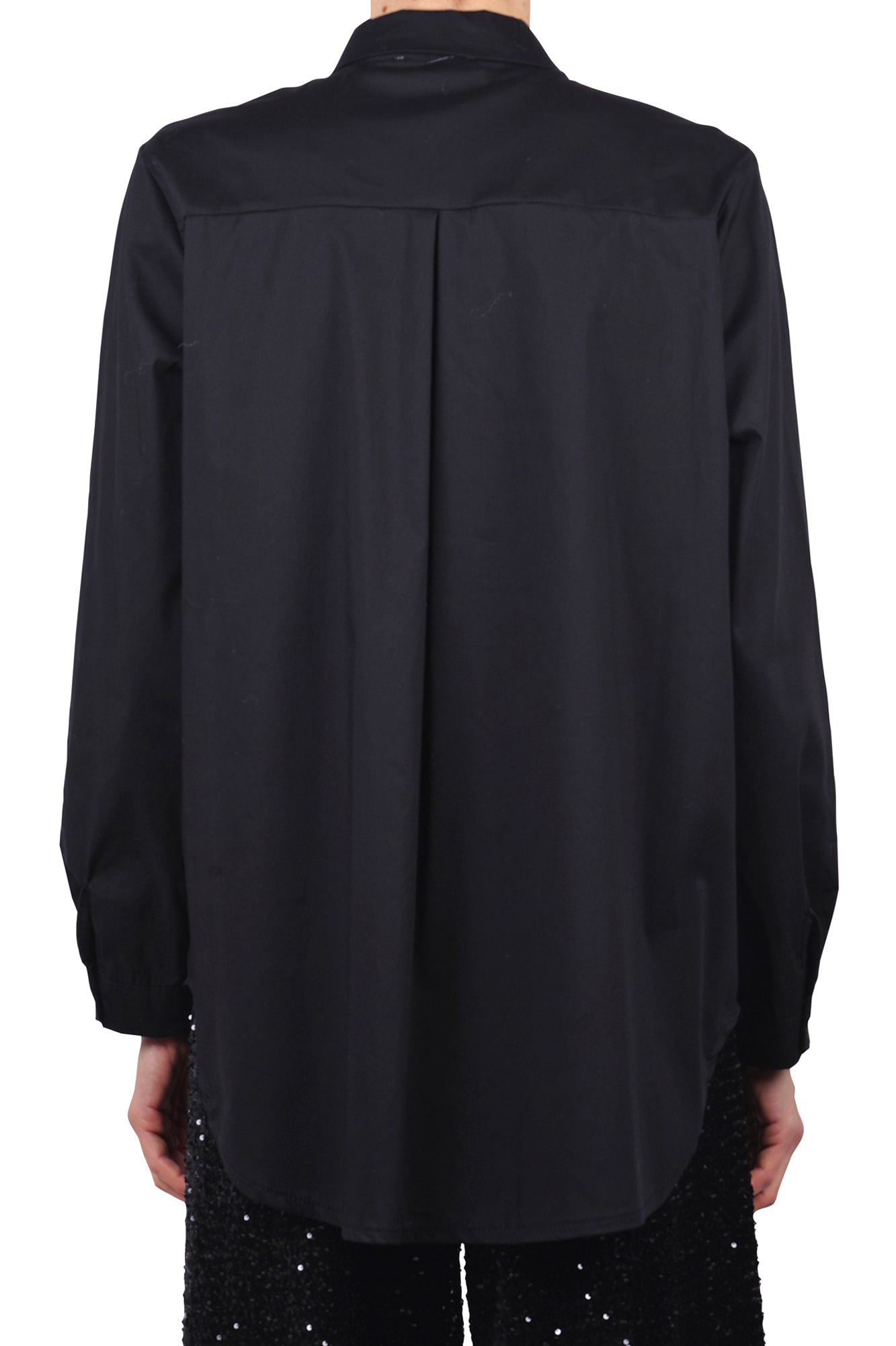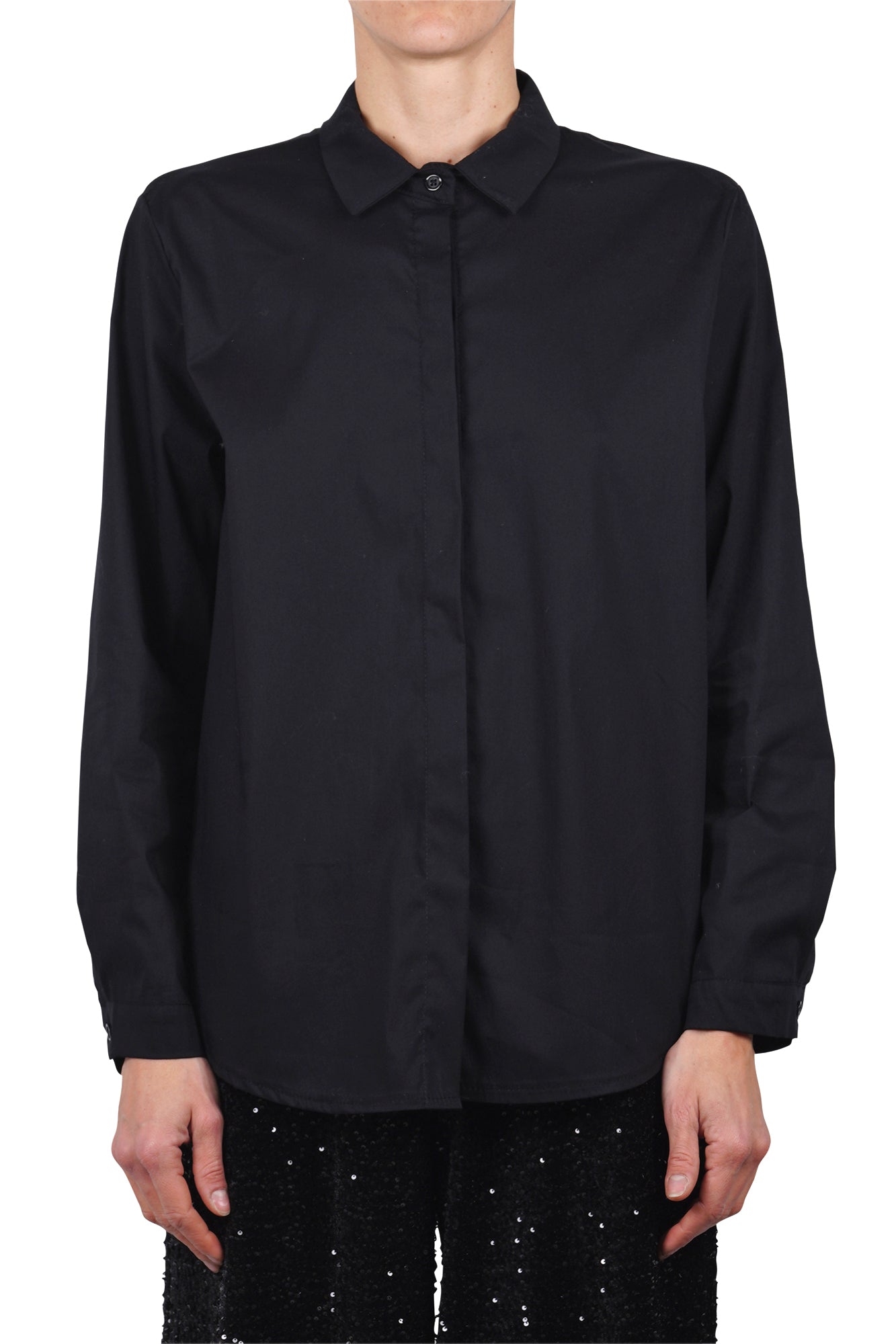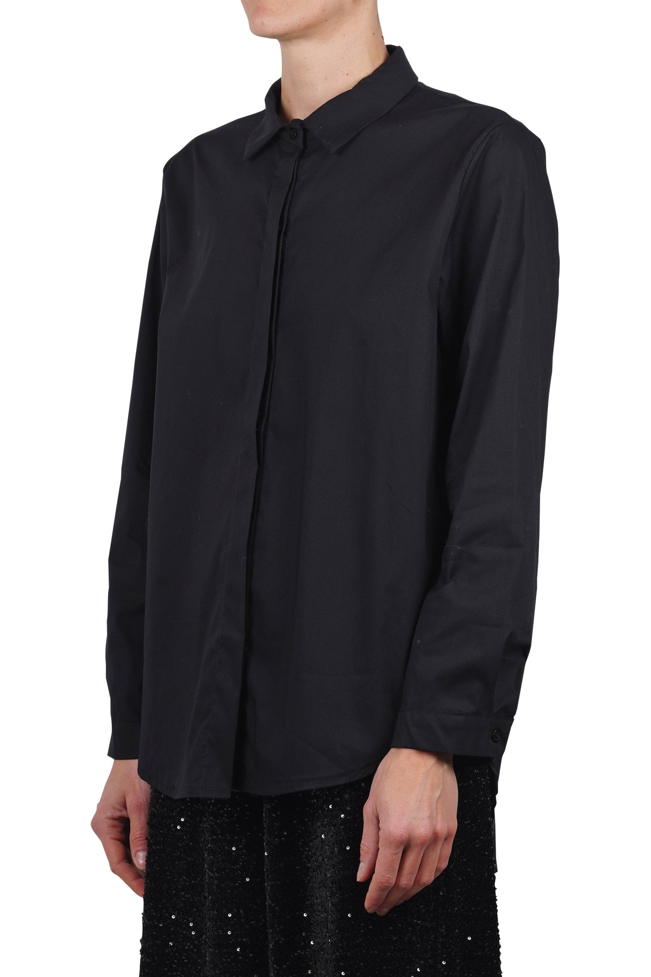 Camicia classica. Collo classico. Spalle scivolate e maniche lunghe. Chiusura frontale con bottoni. Polsini con bottone. Fondo arrotondato leggermente più lungo nel retro. Composizione tessuto: 70% cotone; 28% nylon; 2% elastan. Vestibilità: ampia. Made in Italy. La modella indossa una taglia unica ed è alta 175 cm. Un capo essenziale e versatile, perfetto per look eleganti o casual chic.
