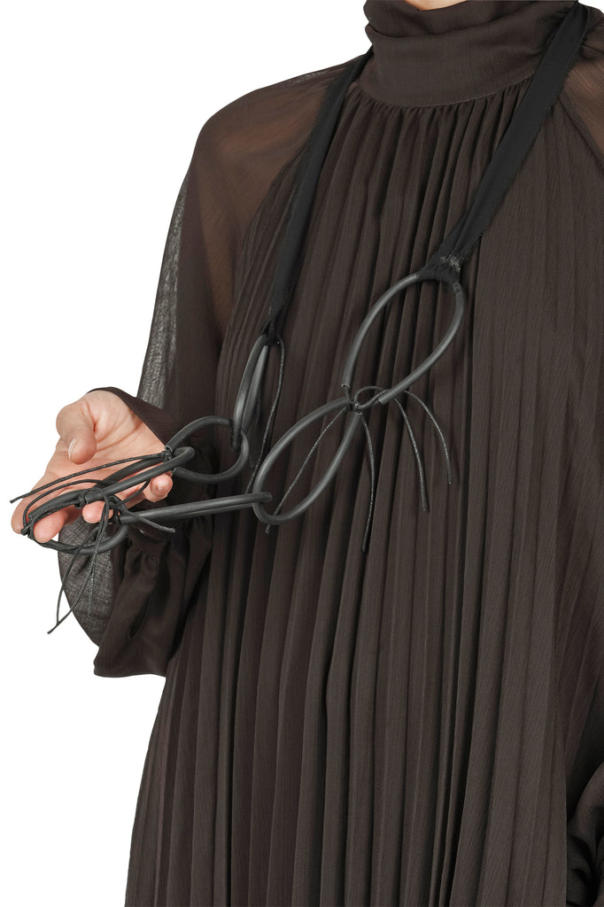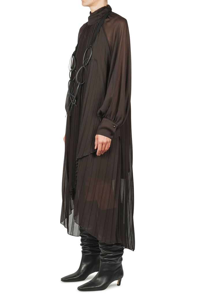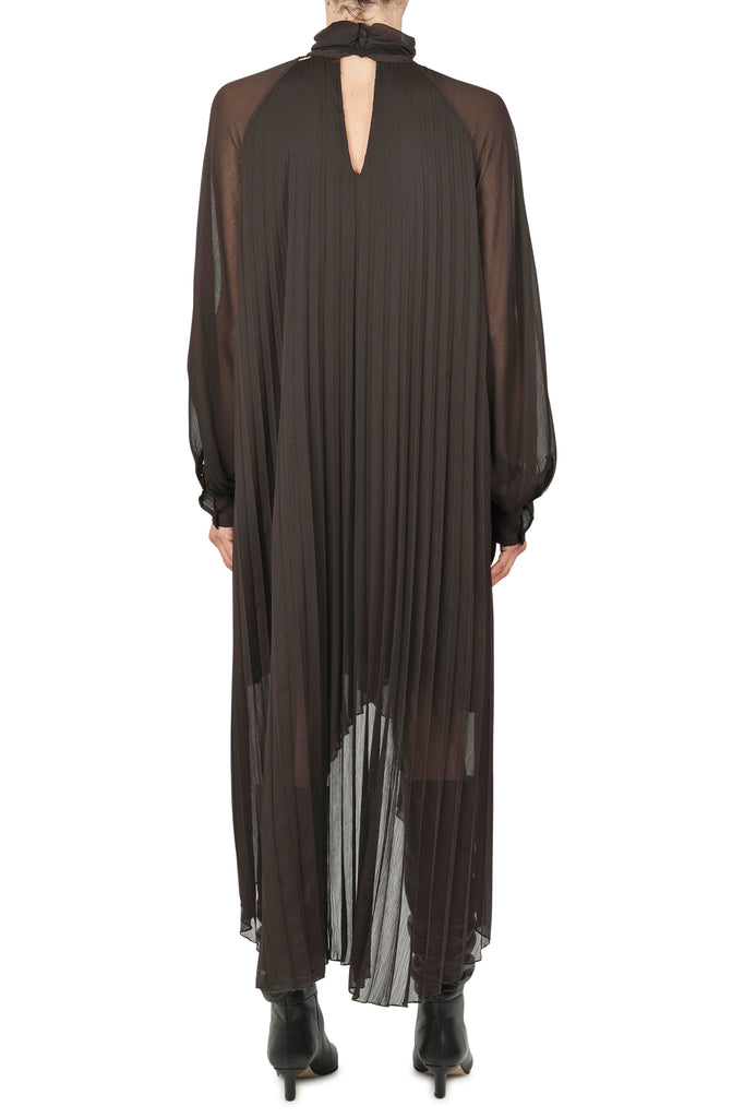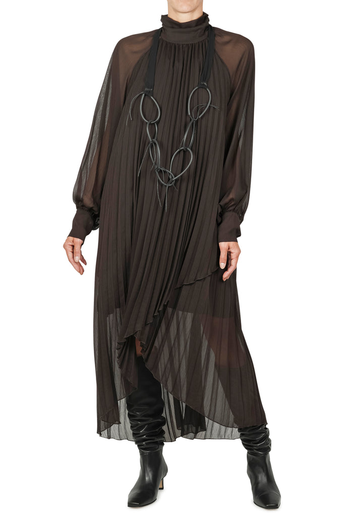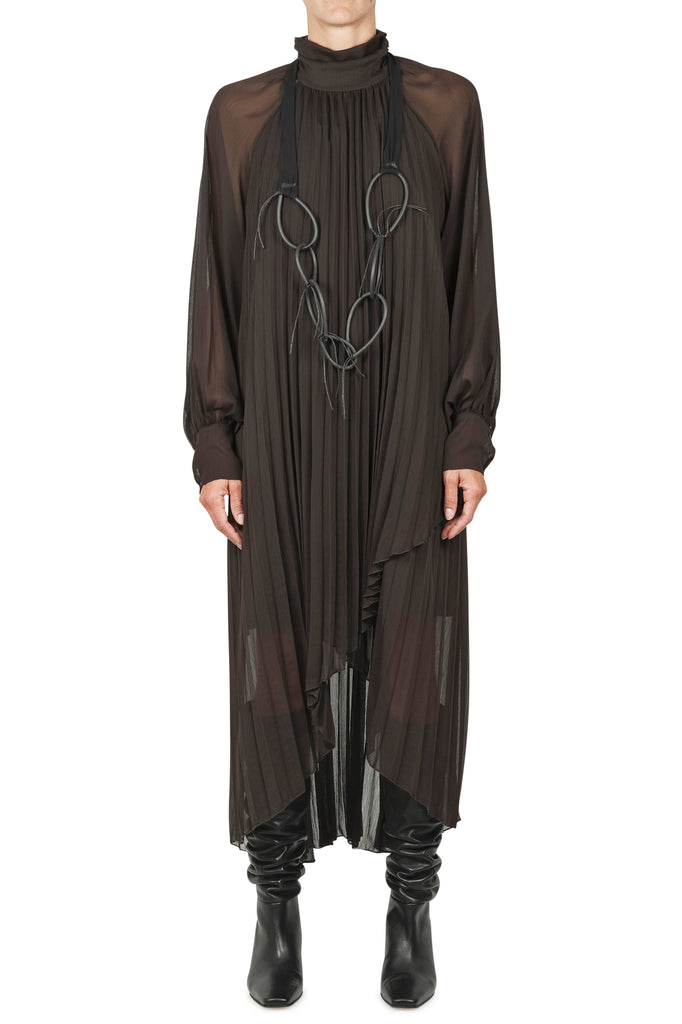 Abito in crepe plissettato. Collo alto. Chiusura sul retro con piccoli bottoni rivestitie apertura a goccia. Maniche lunghe in tessuto semi trasparente con bottone al fondo. Tessuto fluido. Fondo asimmetrico. Foderato. Collana removibile inclusa. Composizione tessuto: 100% poliestere. Composizione fodera: 100% poliestere. Vestibilità: regolare. Made in Italy. La modella indossa la taglia M ed è alta 175 cm. Amiamo questo abito perchè è un capo estremamante femminile e pieno di fascino.