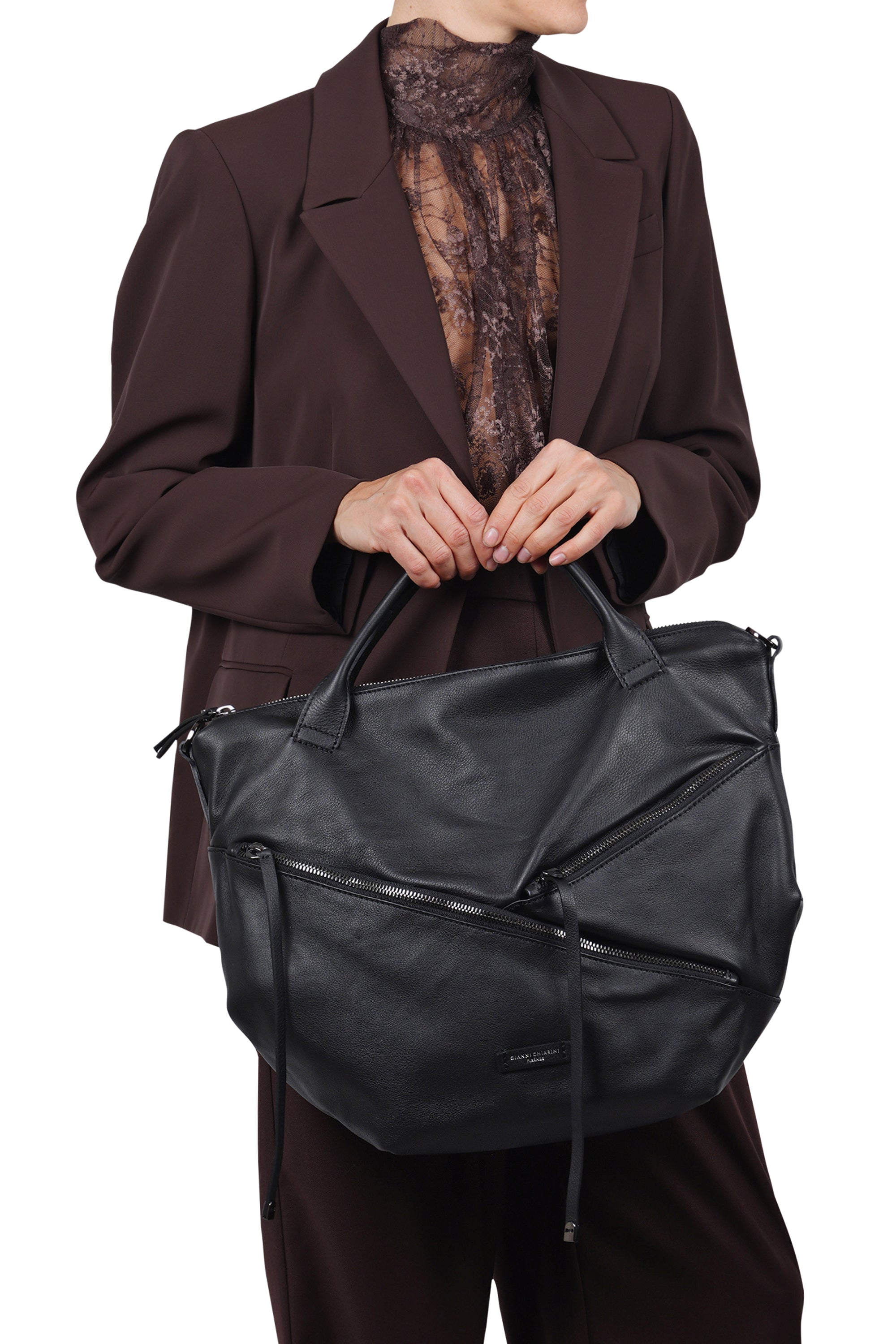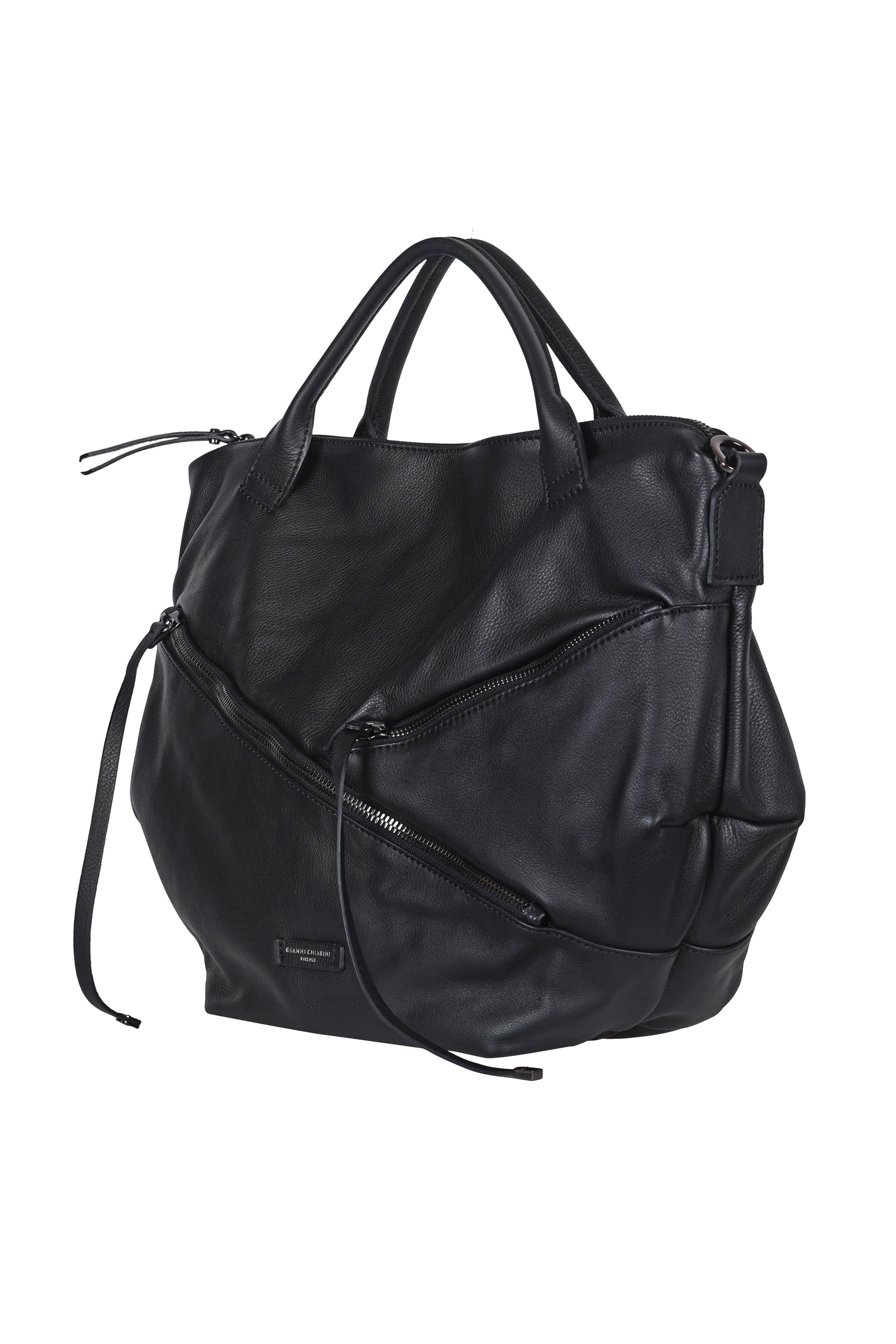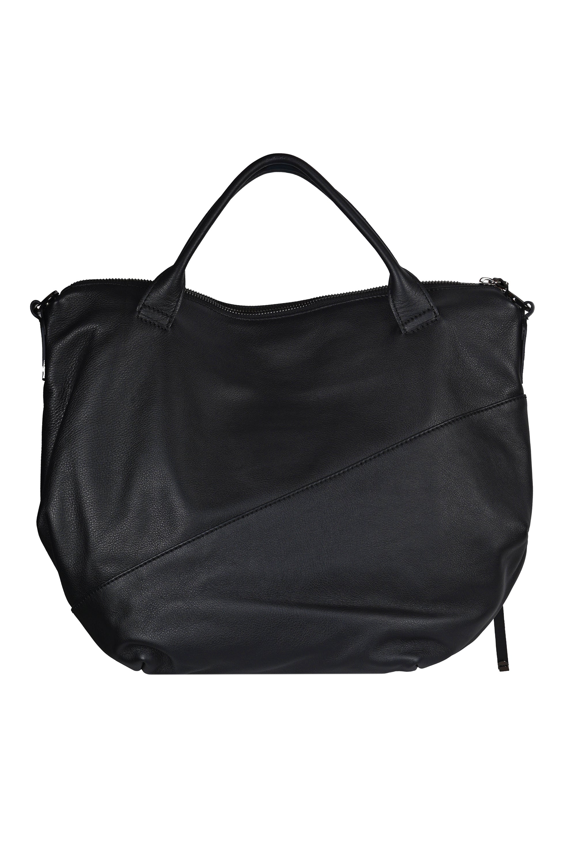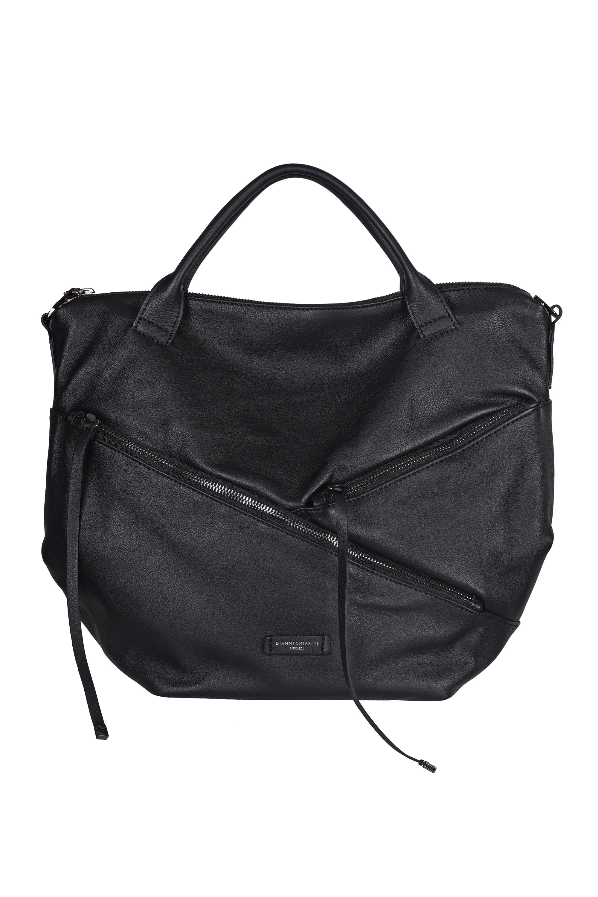 Handbag and shoulder bag Shania. Made of soft hammered leather. Modern and sinuous design with a soft silhouette. Top closure with zip. Double handles for easy carrying by hand or on the shoulder. Adjustable and removable leather shoulder strap for shoulder carrying. Two flat front pockets with zip closure and asymmetric/diagonal cuts. Internal service pocket with zip closure. Internal lining in polyester. Height: 34 cm. Length: 46 cm. Depth: 16 cm. Composition: 100% leather. Made in Italy. L'a bold and sophisticated accessory, ideal for those looking for versatility and character in a single bag.