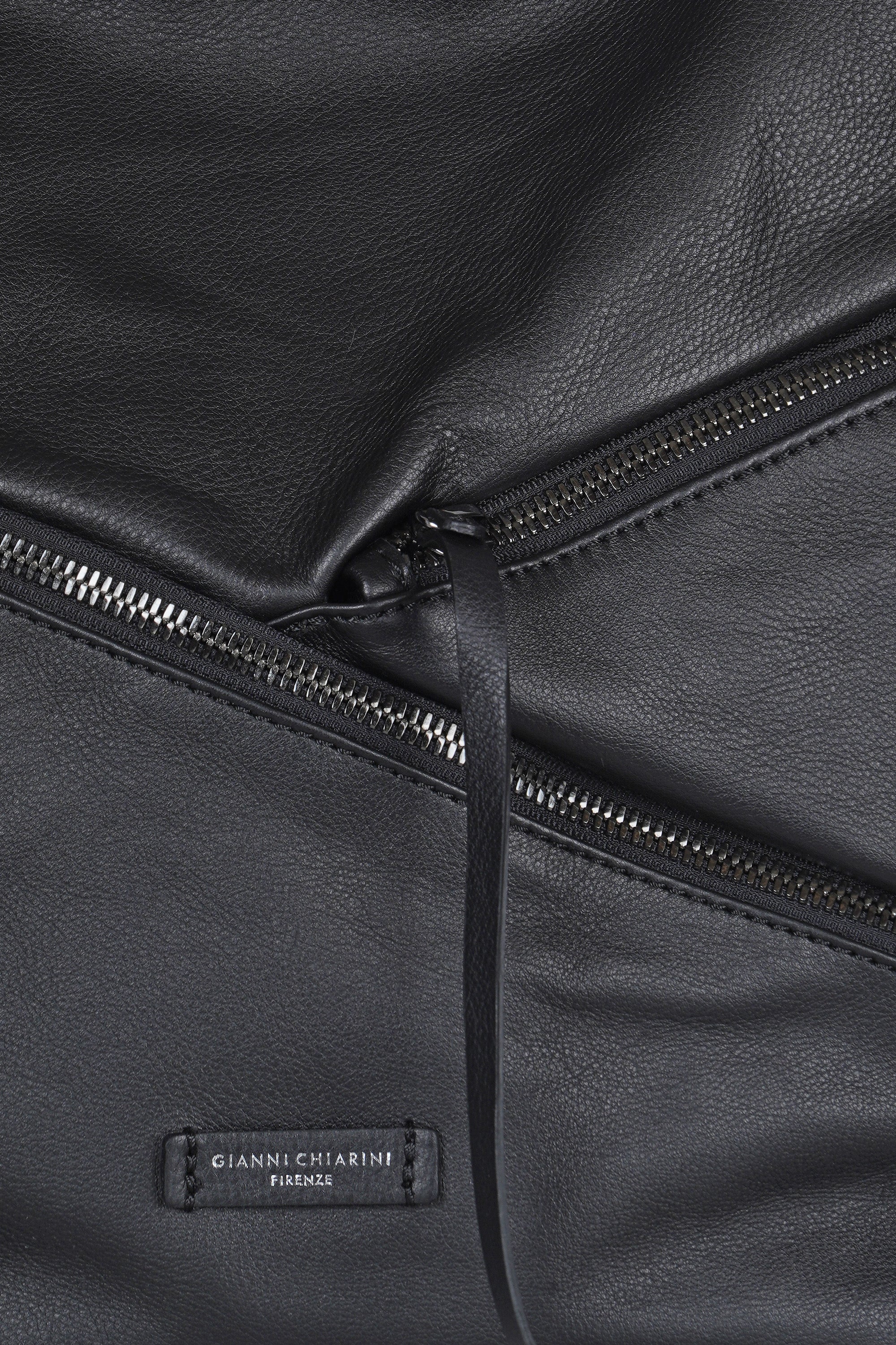 • Due tasche piatte frontali con chiusura a zip e tagli asimmetrici/diagonali. - Elementi di stile che aggiungono interesse visivo e funzionalità alla borsa.