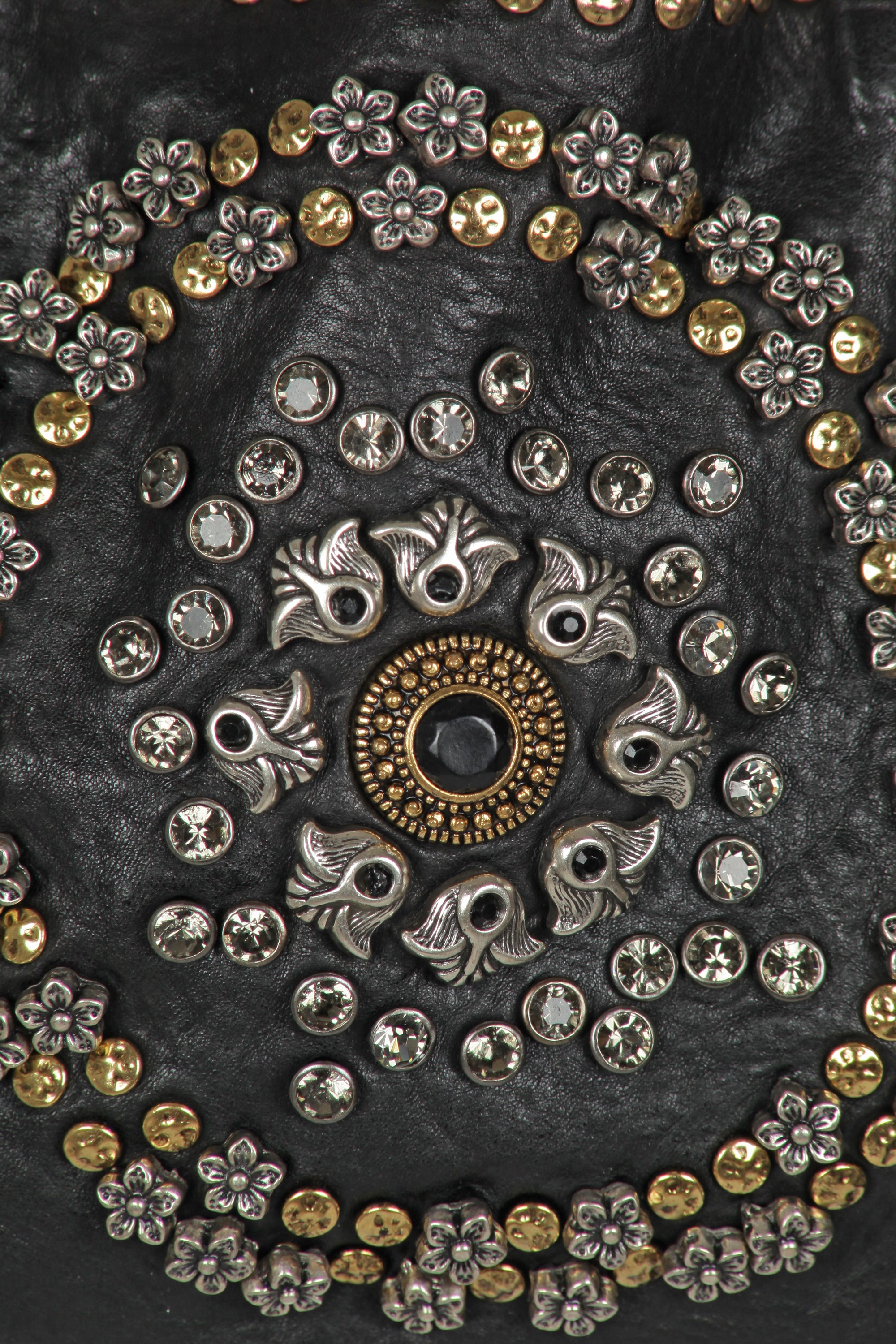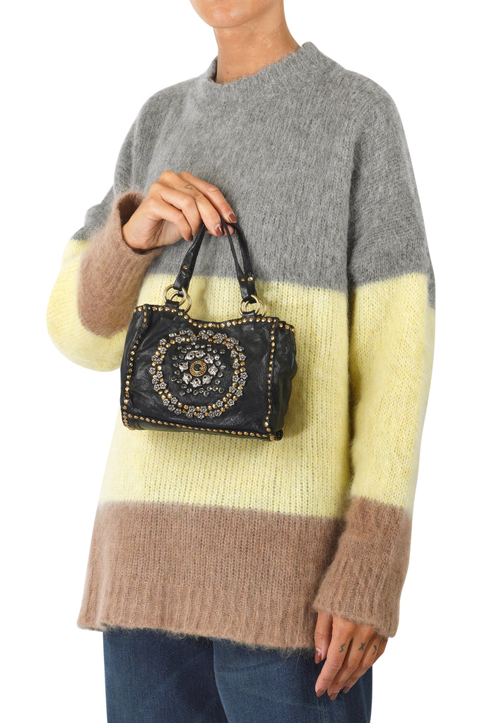 Small vintage leather bag with studs. Two leather handles. Adjustable and removable shoulder strap. Closure with snap button. Single compartment. Logo on the back. Lined. Height: 15 cm. Width: 18 cm. Depth: 8 cm. Composition: 100% leather. Made in Italy. Cotton dust bag and care cream kit for the bag included.