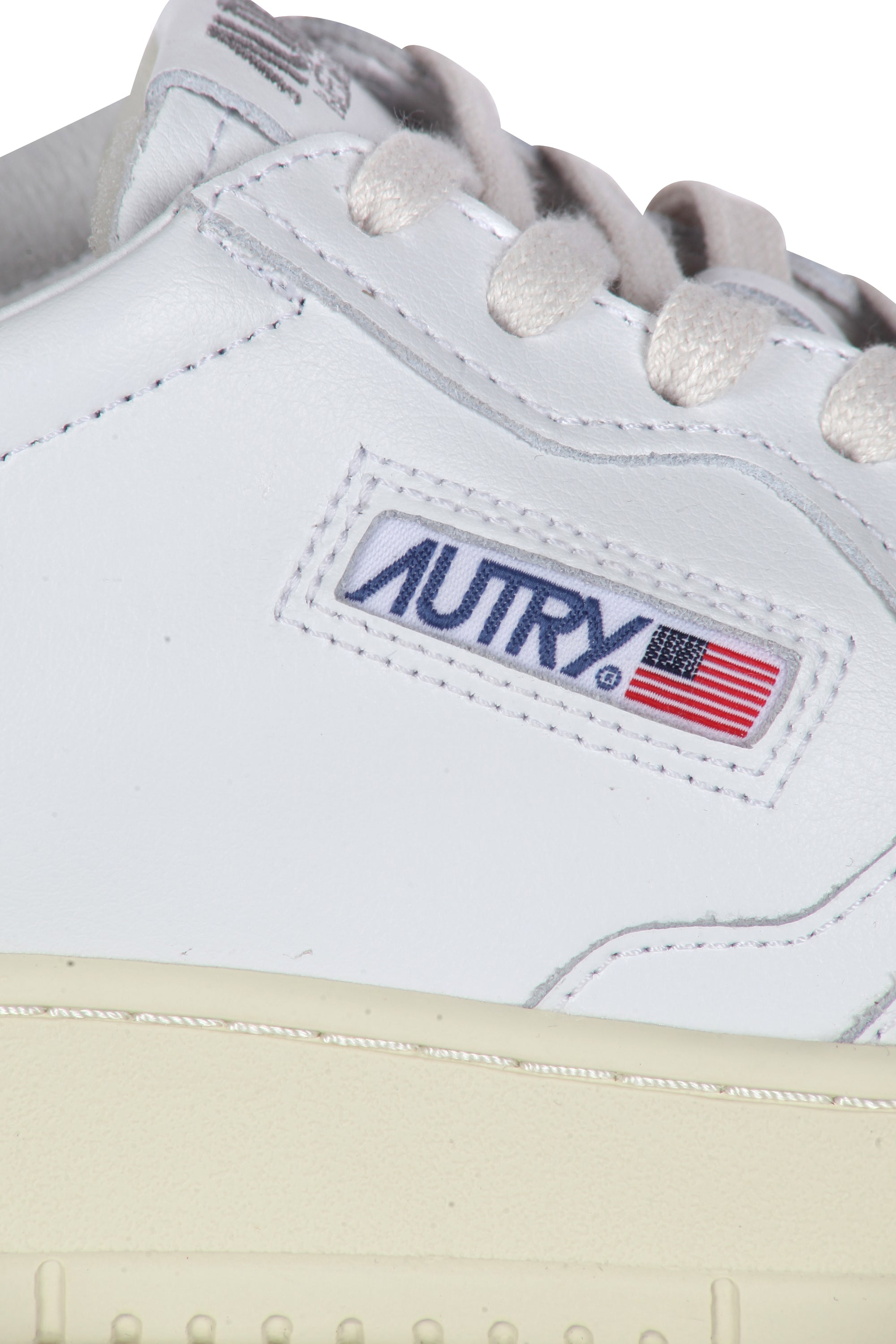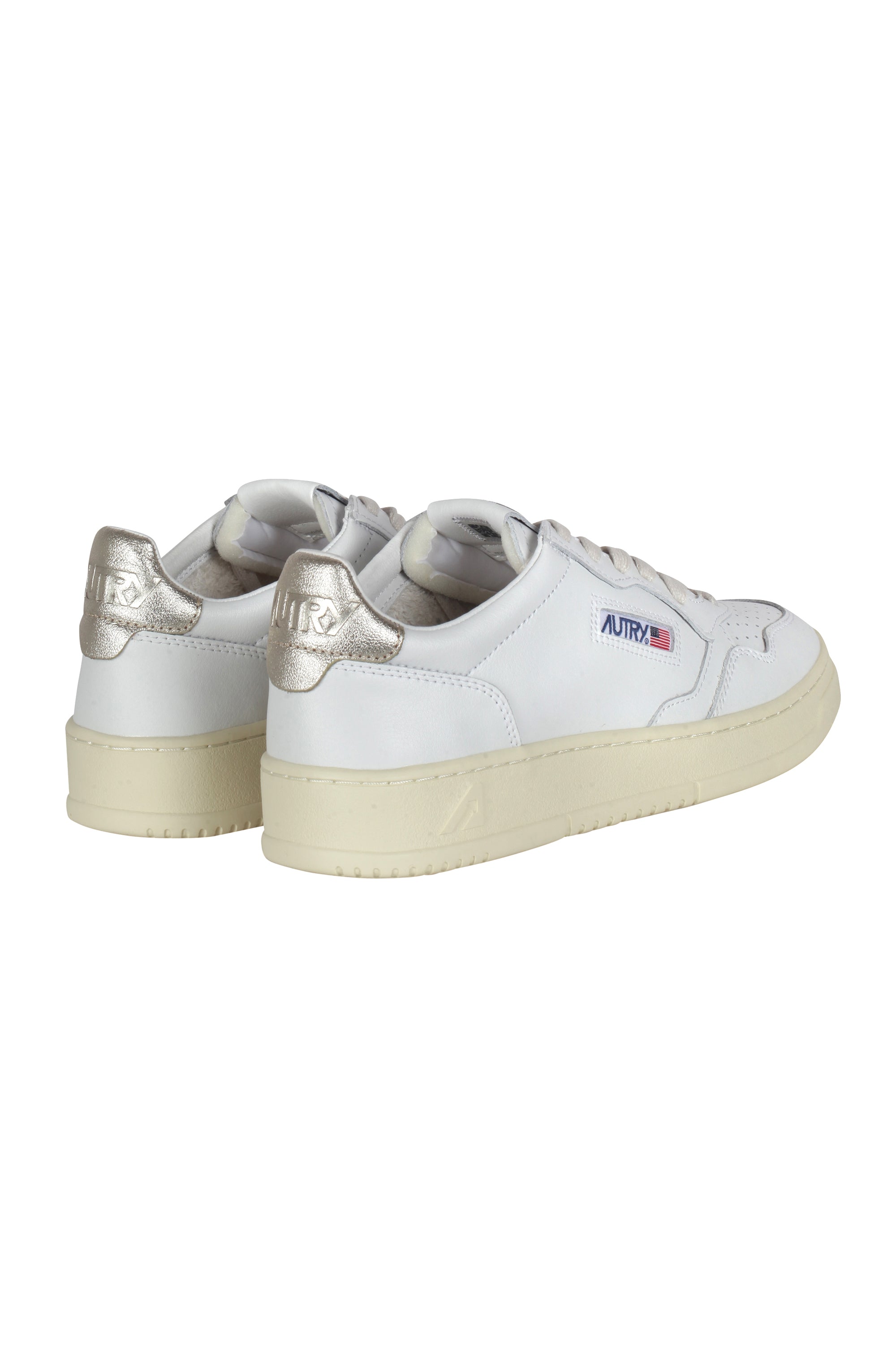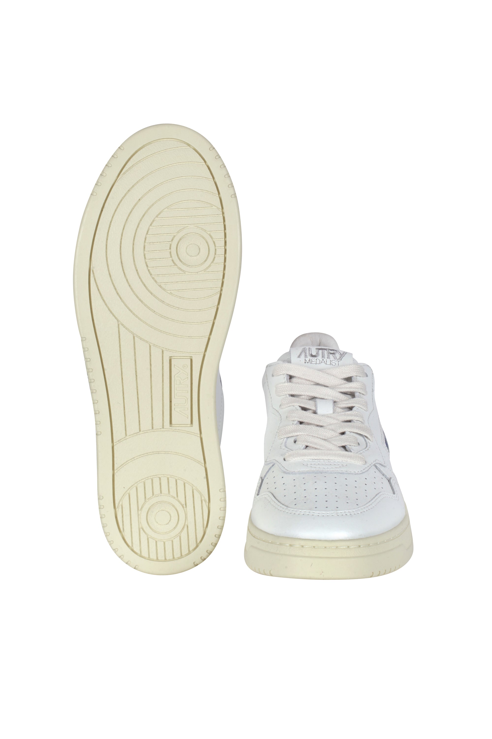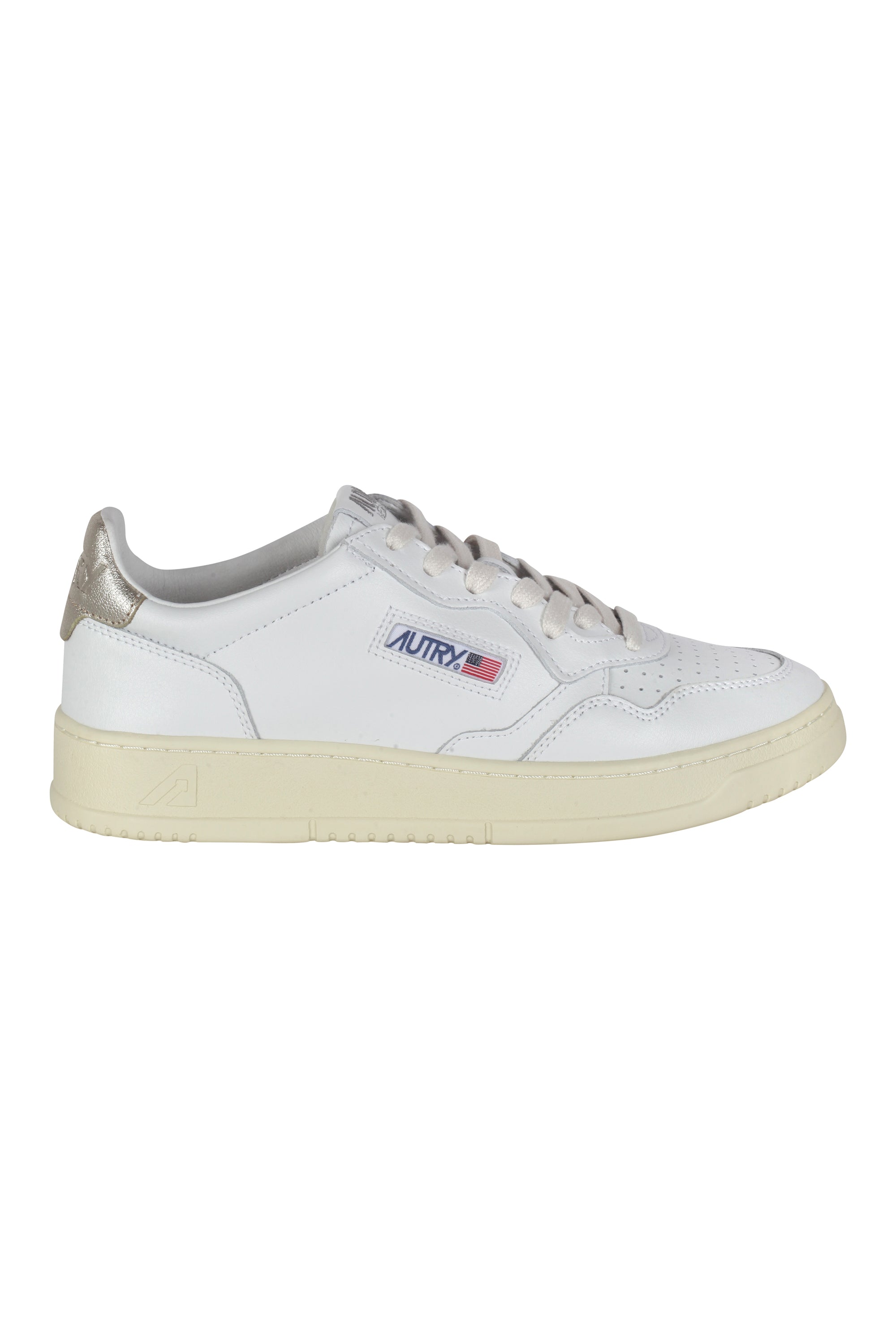 Medalist Low sneakers in leather. Low-top model inspired by 80s tennis shoes. Upper in soft white leather with micro-perforated toe for increased breathability. Flat cotton laces in color Cream. Iconic side insert with logo and American flag. Metallic gold leather heel with embossed Autry logo. Lining in leather and cotton sponge. Rubber sole with vintage effect. Sole height: 2.5–3.5 cm. Composition: 100% leather. Size: regular.