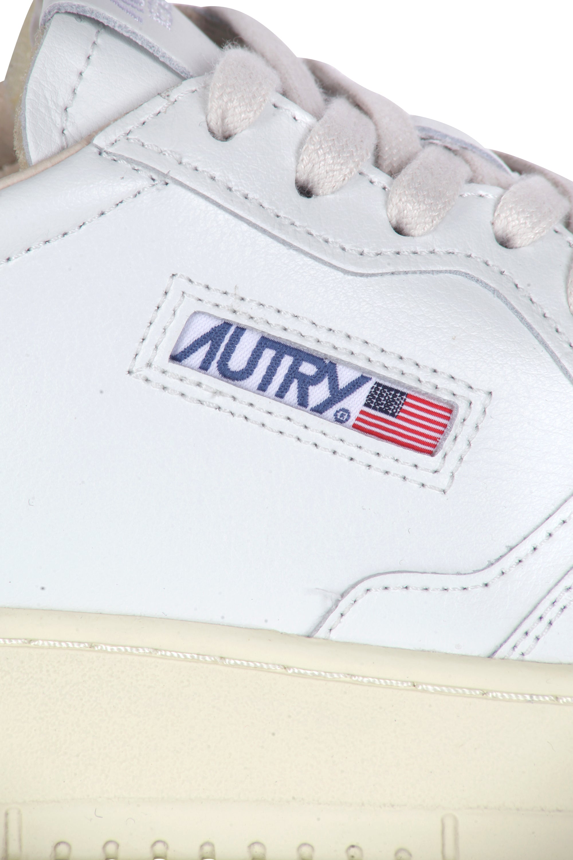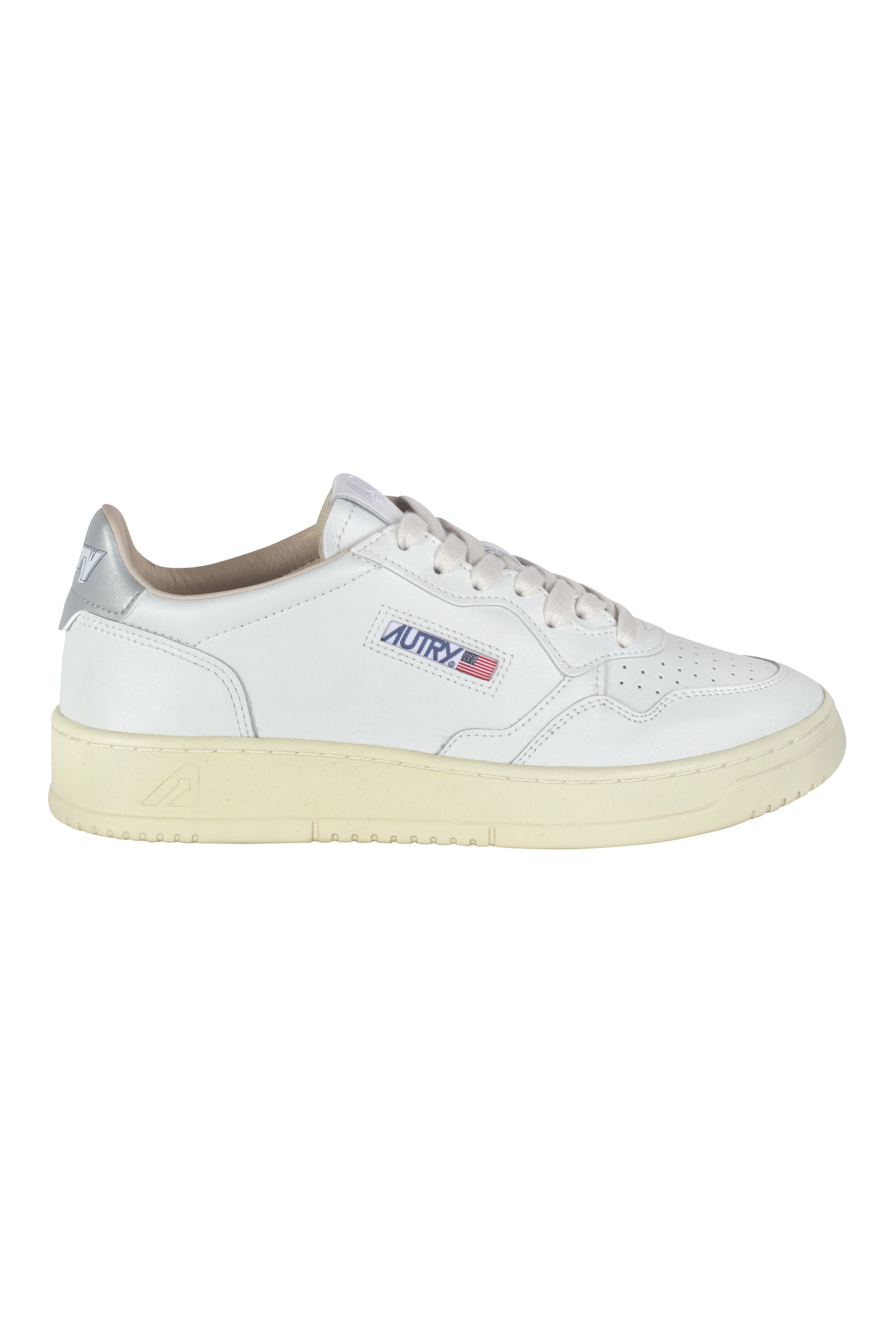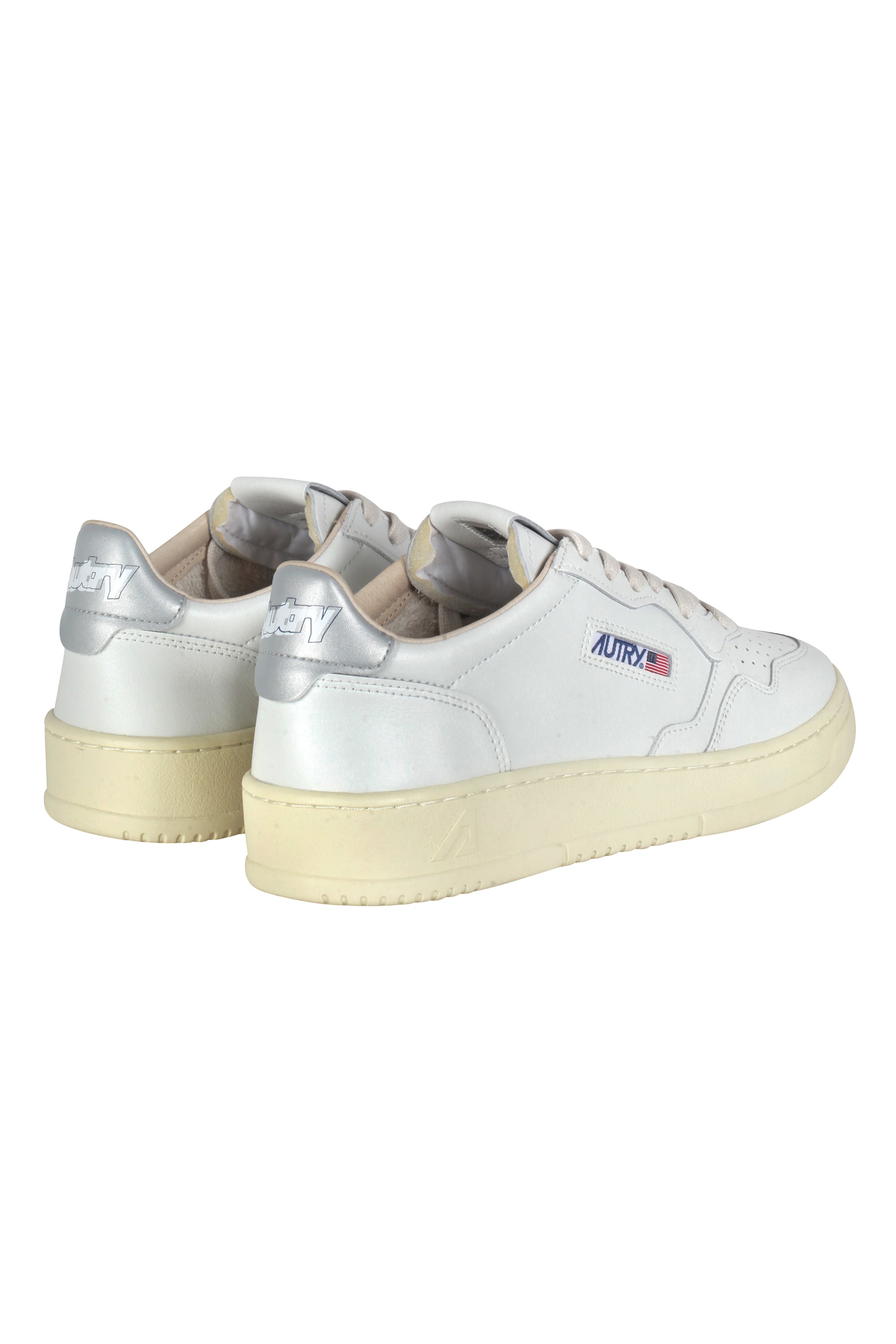Metallic silver leather heel tab with embossed Autry logo.