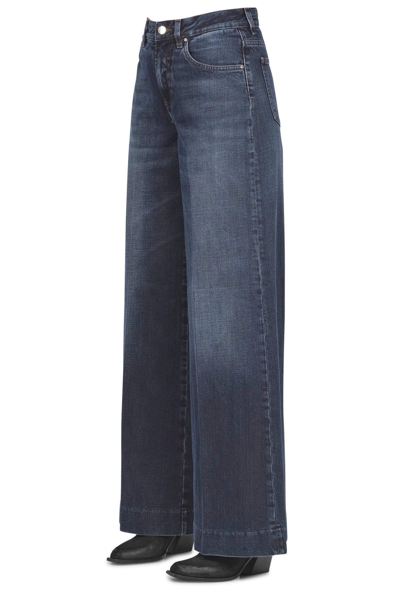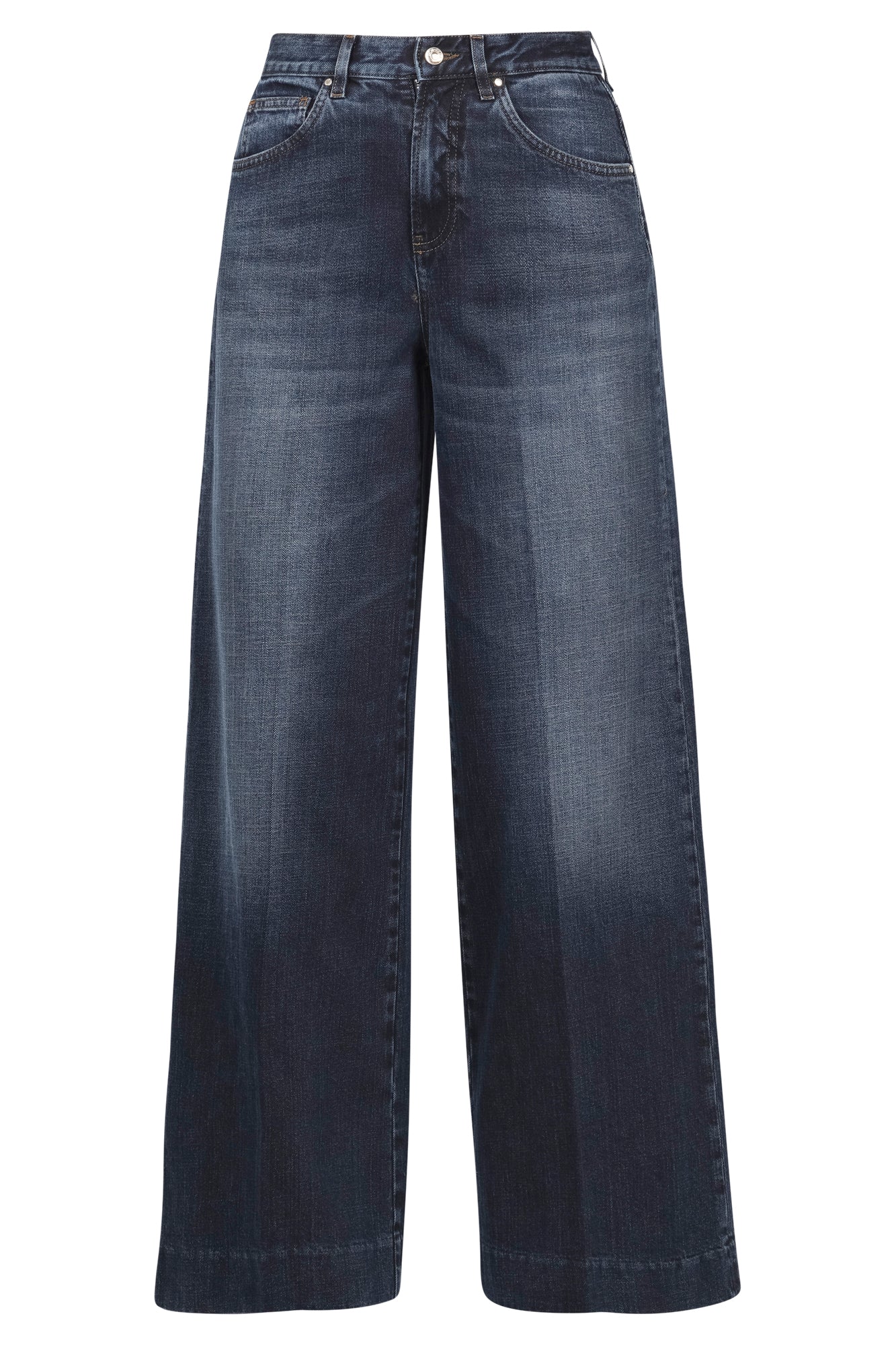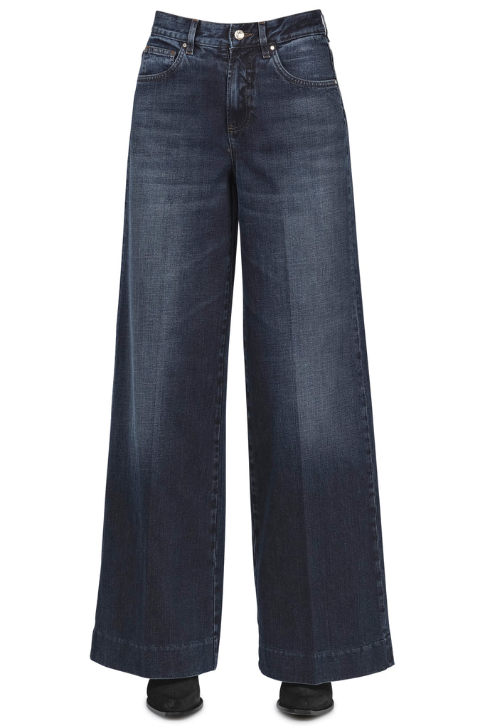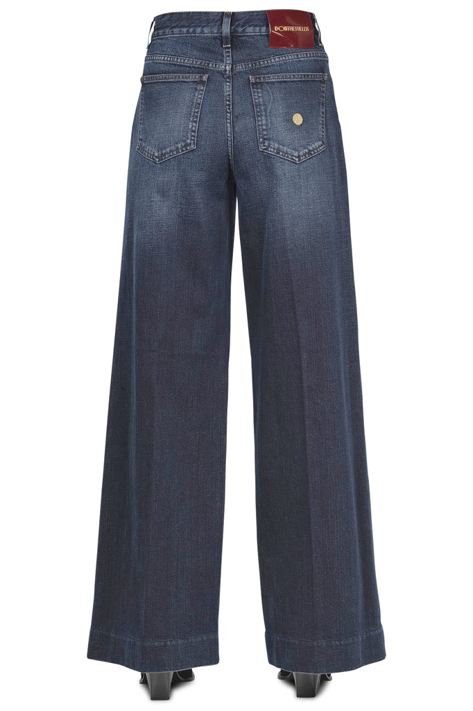 Wide jeans Nice. high waist. Belt loops. Front closure with logo button and zip. Five pockets. Leather patch on the back in burgundy. Embroidered logo on the back with lurex details. Stone wash effect. Bottom width: 32 cm. Fabric composition: 99% cotton, 1% elastane. Fit: regular. Made in Italy. The model wears Size size 26 and is 175 cm tall. We love these jeans for their well-designed, sensual, and relaxed line.
