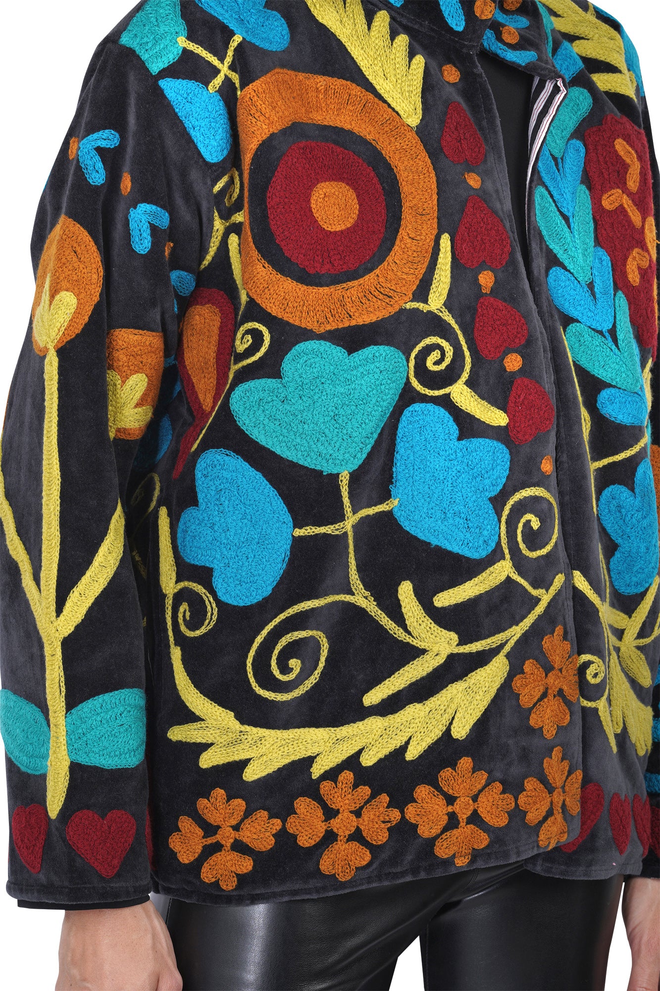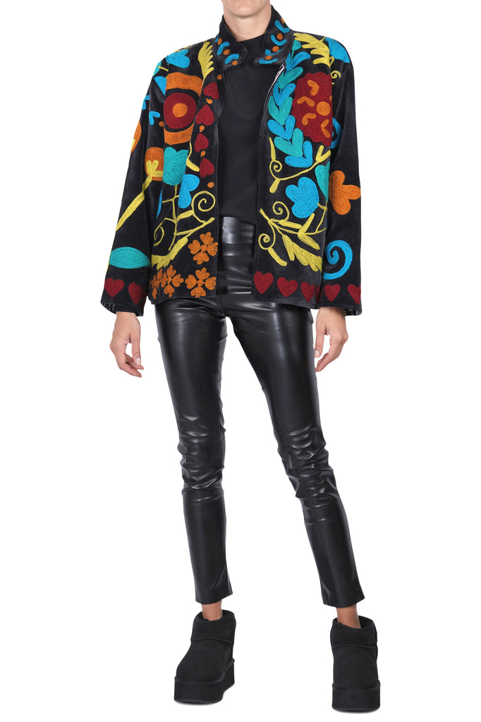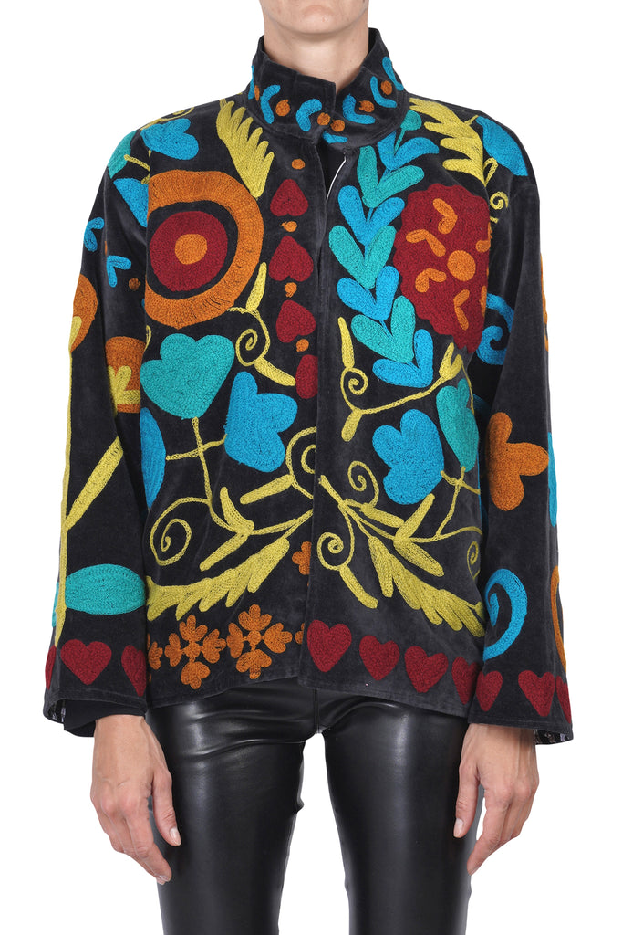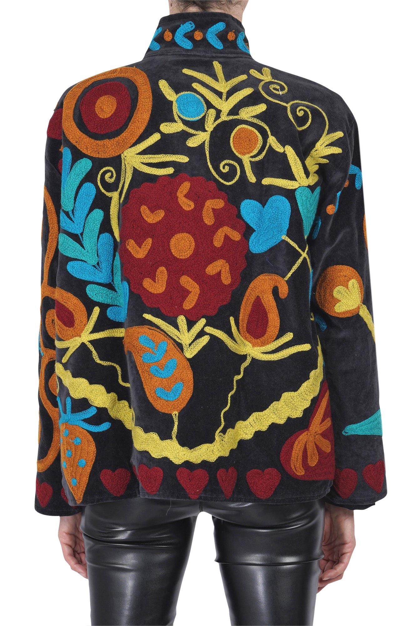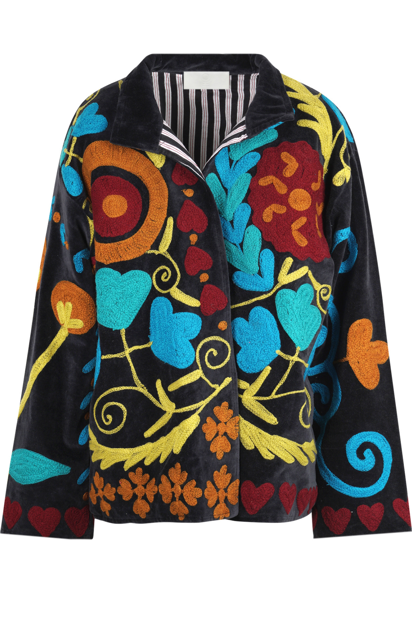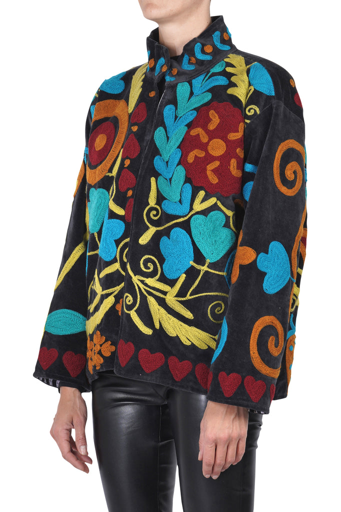 Embroidered velvet jacket. High neck. Dropped shoulders. Long sleeves. No closure. With embroidery. Side welt pockets. Lined. Fabric composition: 100% cotton. Fit: regular. Made in India. The model wears a Size unique piece and is 175cm tall. We love this one-of-a-kind jacket.