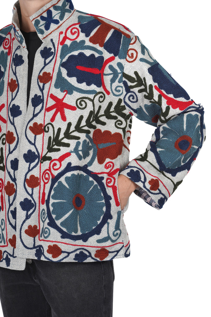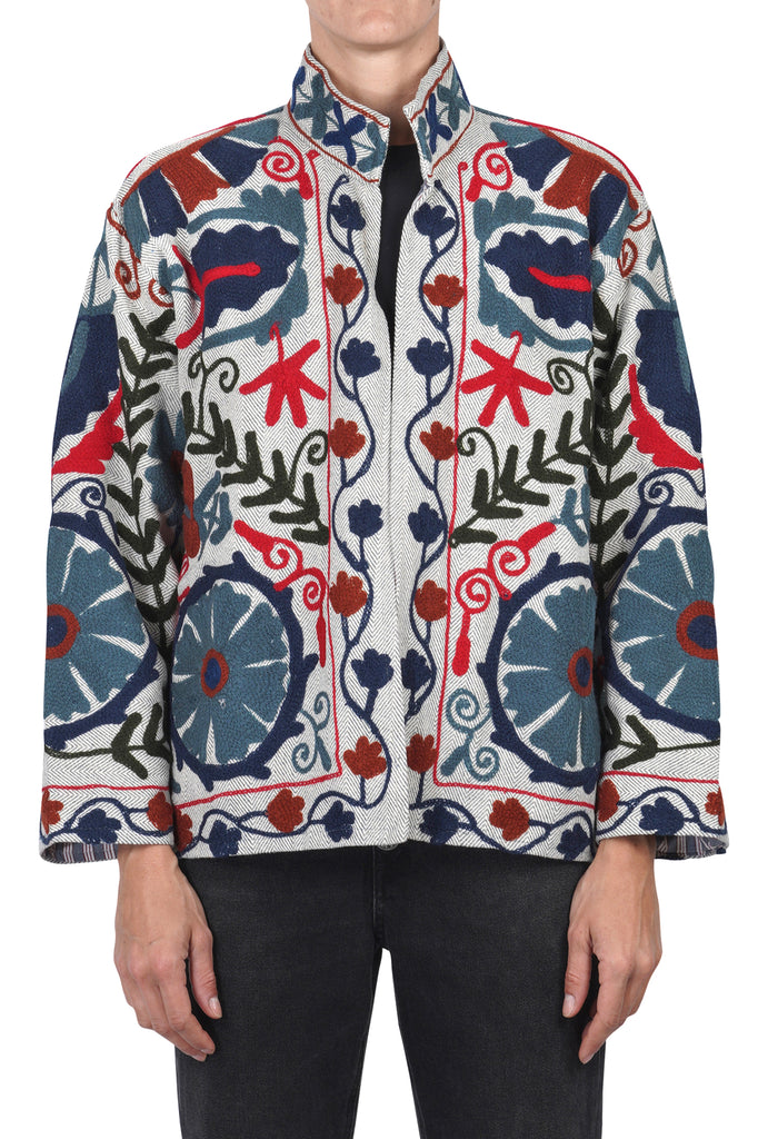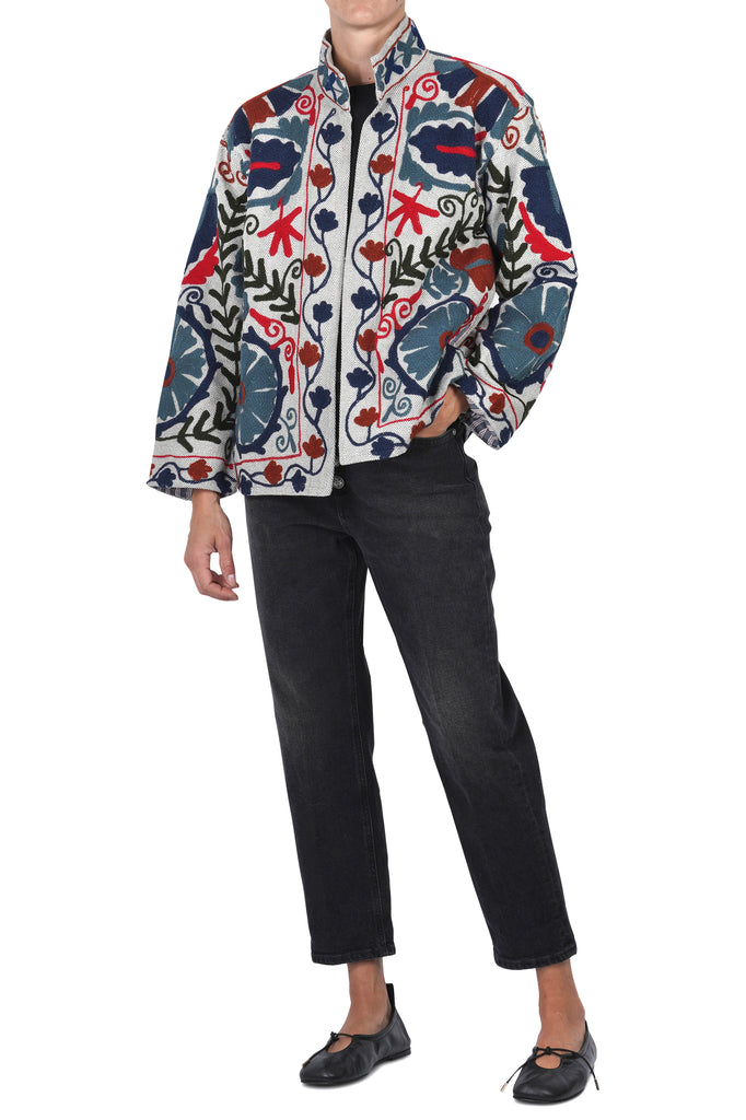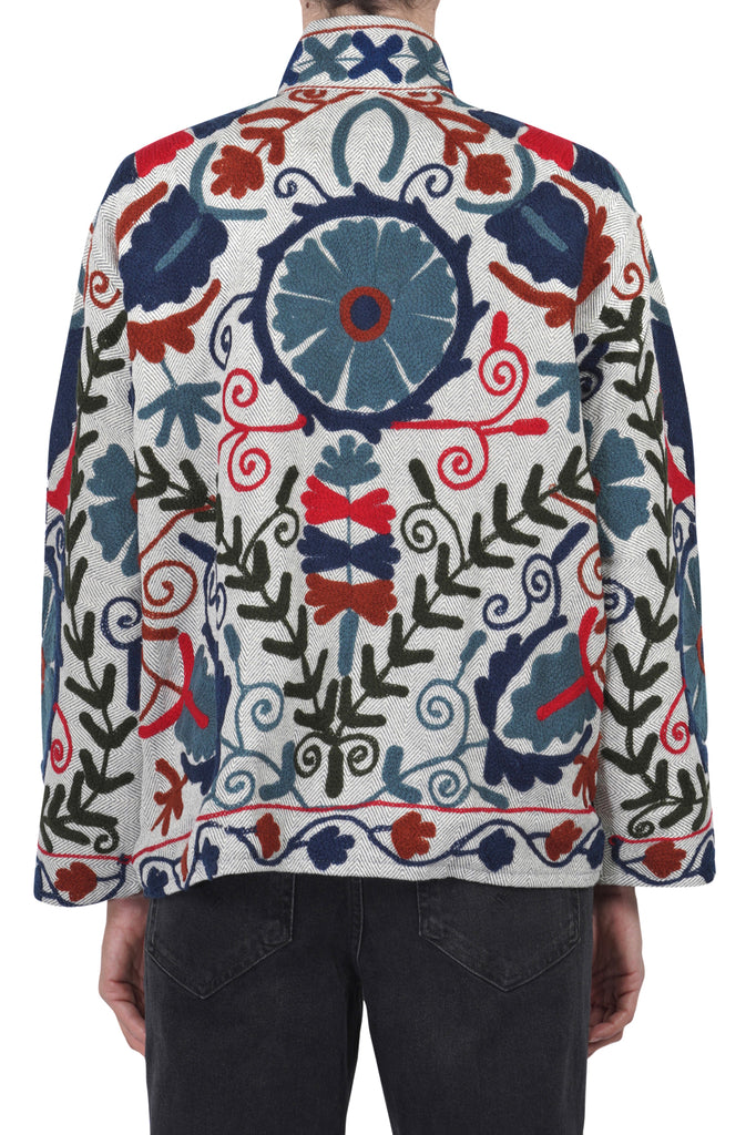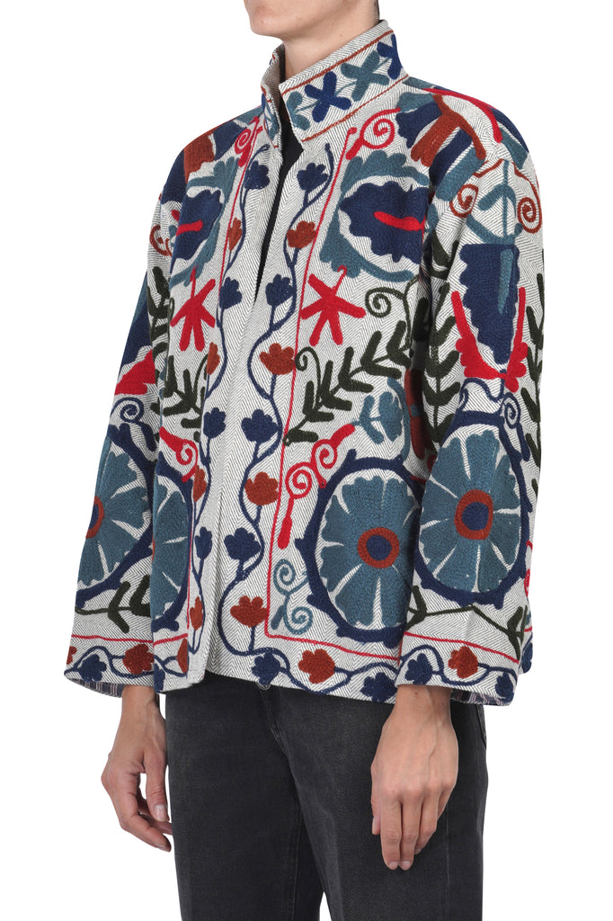 Cotton herringbone jacket with embroidery. High collar with a band. Dropped shoulders. Long sleeves. Front opening. Without closure. Two side pockets inserted in the seam. Lined. Fabric composition: 100% cotton. Fit: regular. Made in India. The model wears a unique Size and is 175 cm tall. We love this jacket for its bohemian character.