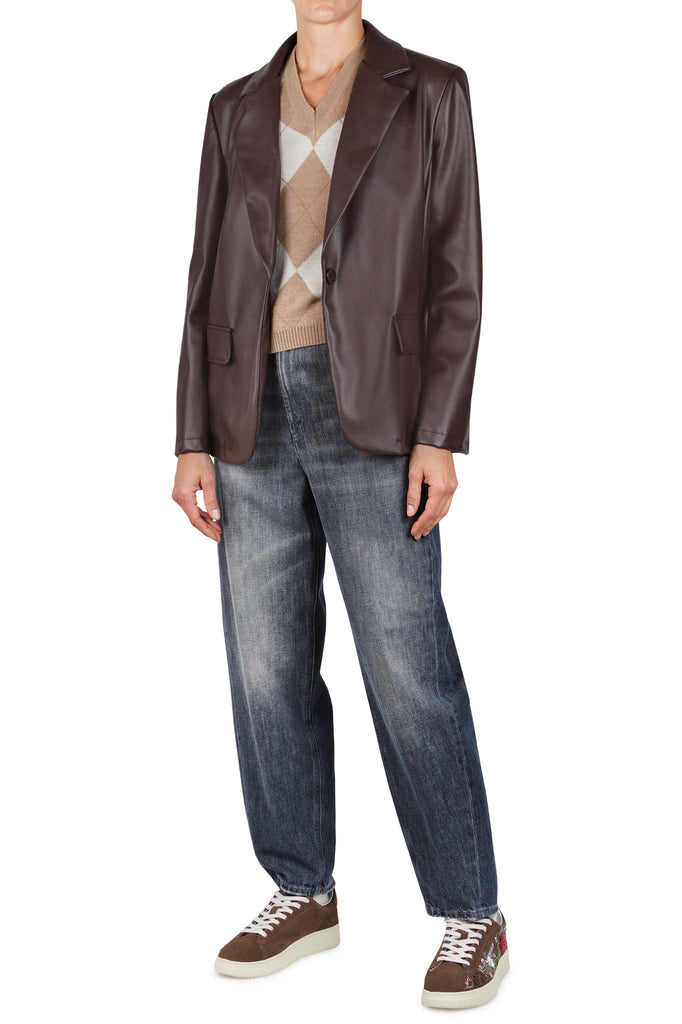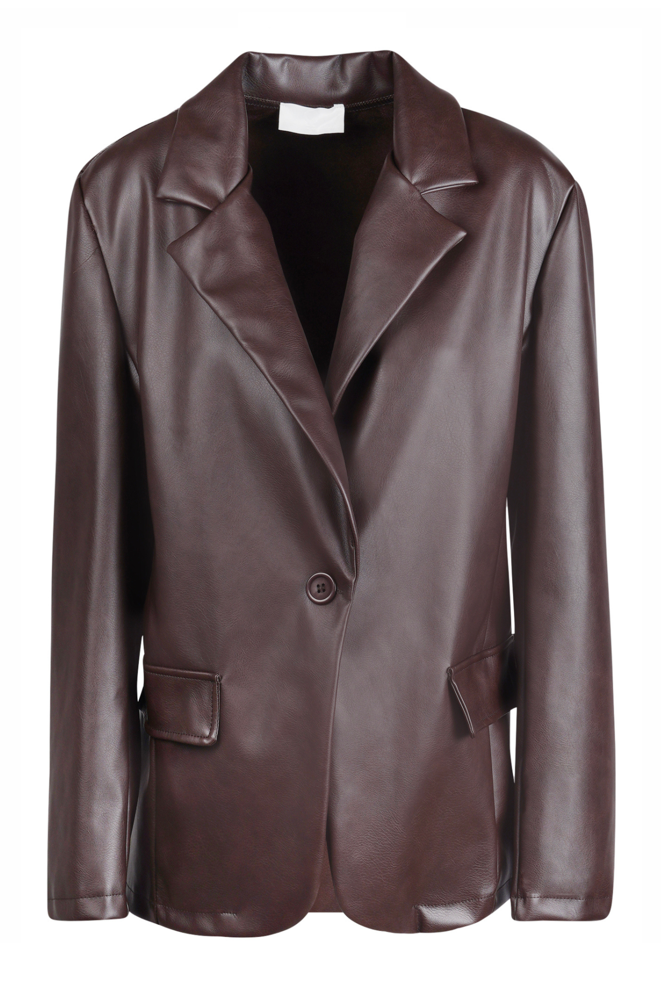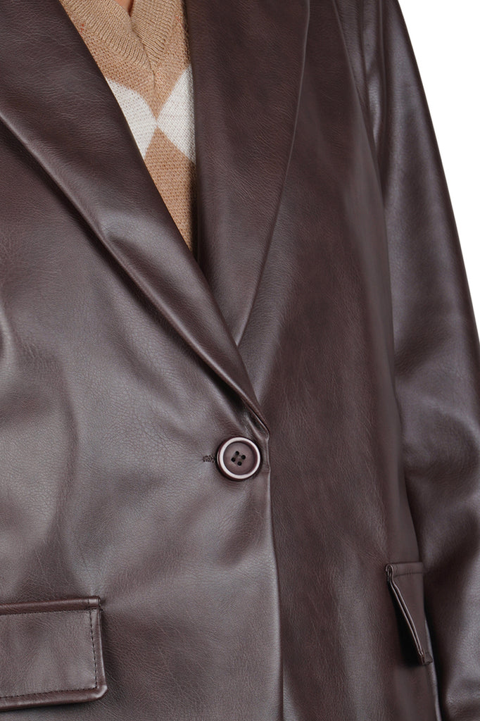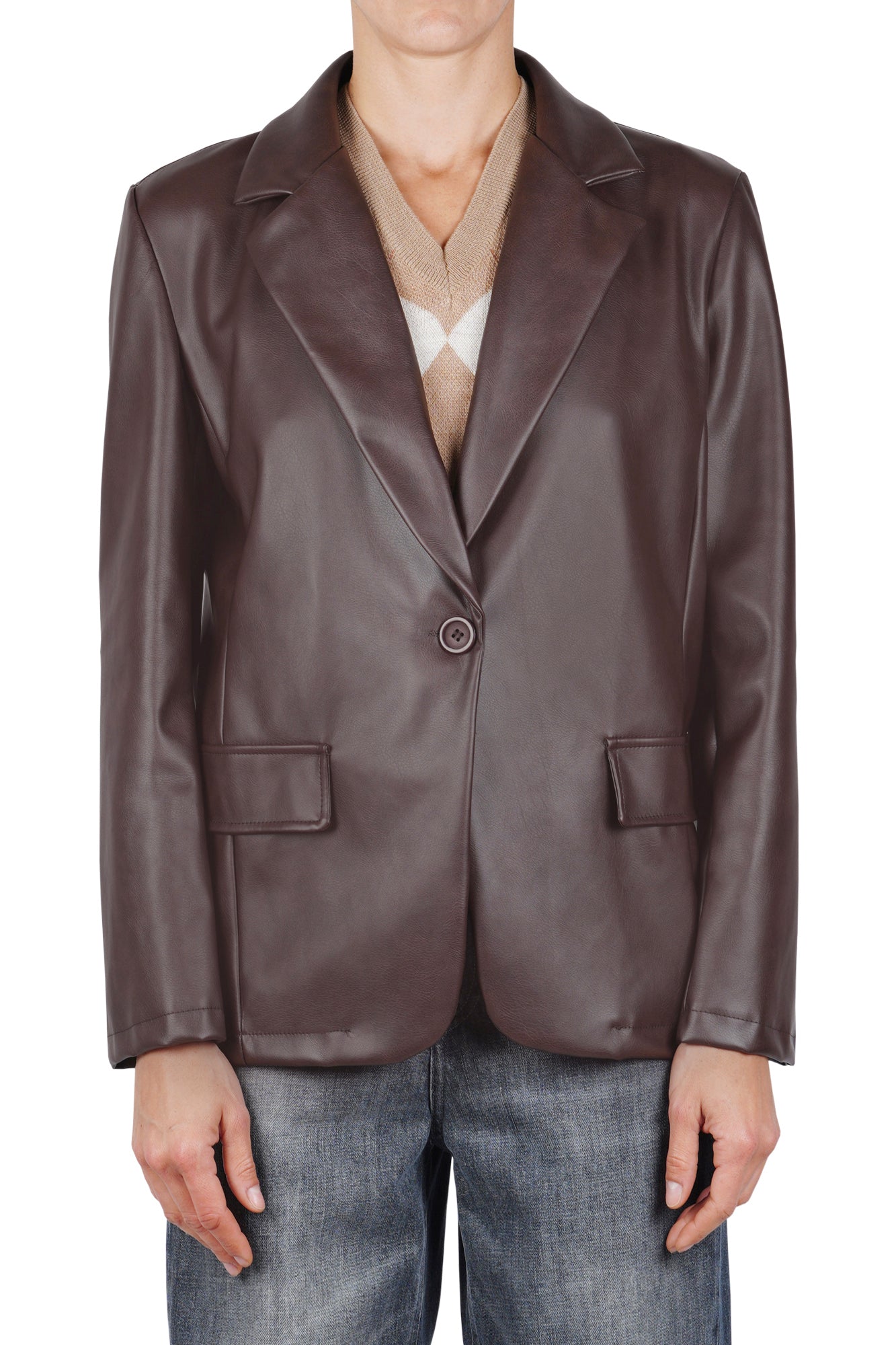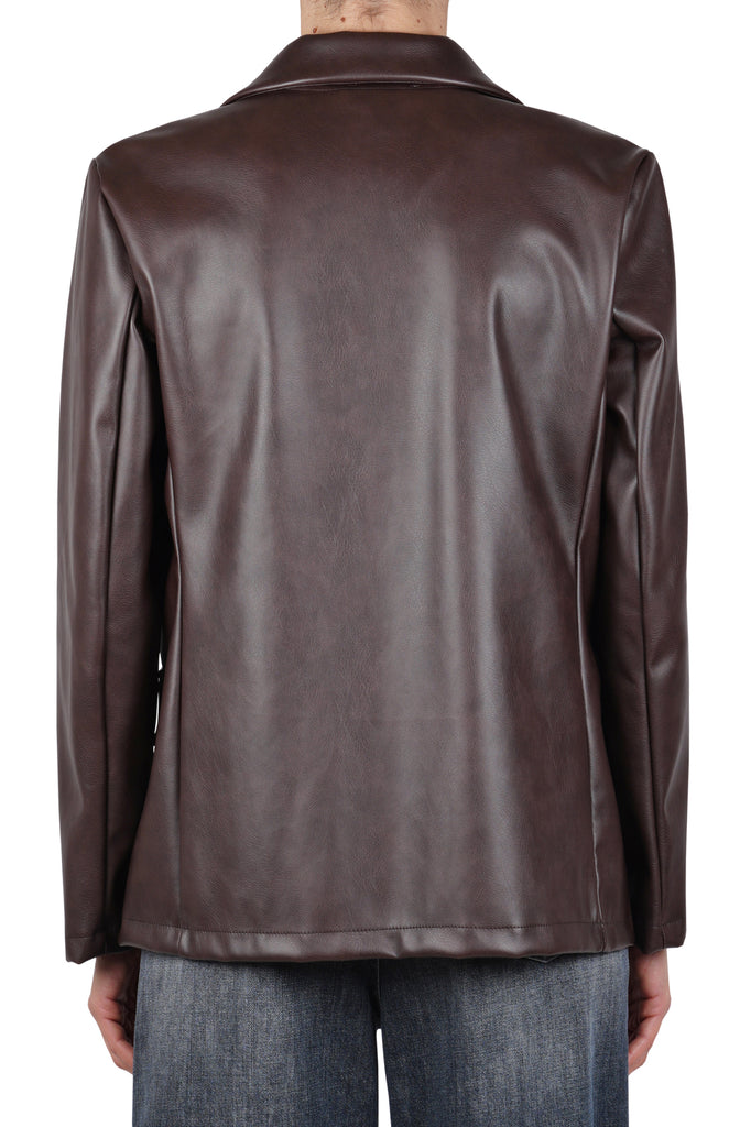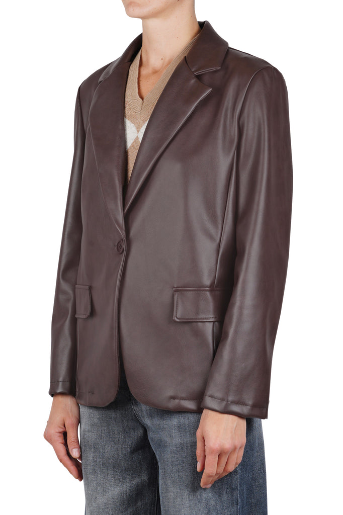 Giacca monopetto in ecopelle. Collo con revers classici. Chiusura frontale con un bottone. Maniche lunghe. Due tasche a patta finte sul davanti. Composizione tessuto: 72% cotone, 26% poliammide, 2% elastan. Vestibilità: regolare. Made in Italy. La modella indossa una taglia unica ed è alta 175cm. Il capo perfetto per dare un tocco rock e sofisticato ai tuoi look.