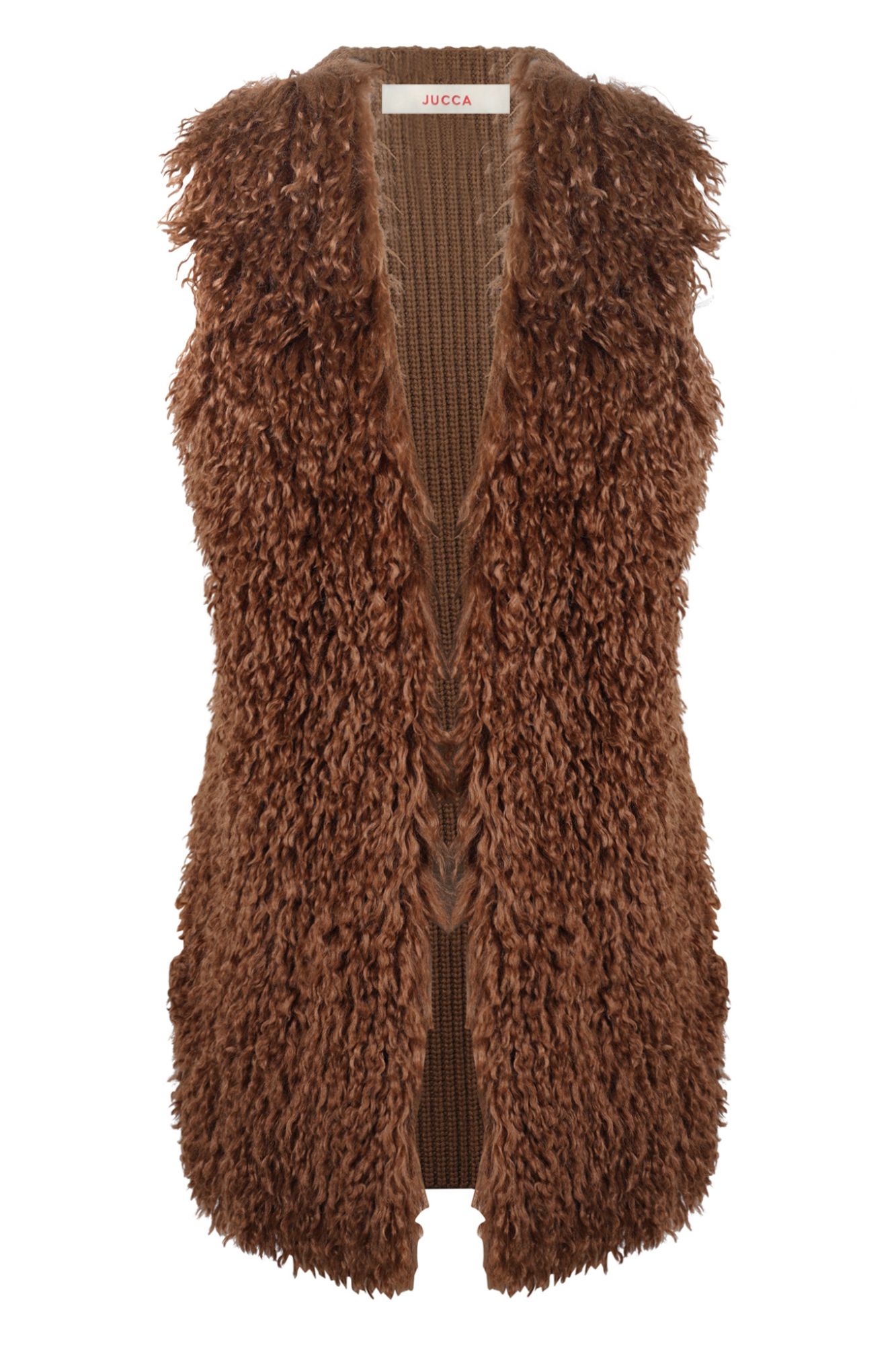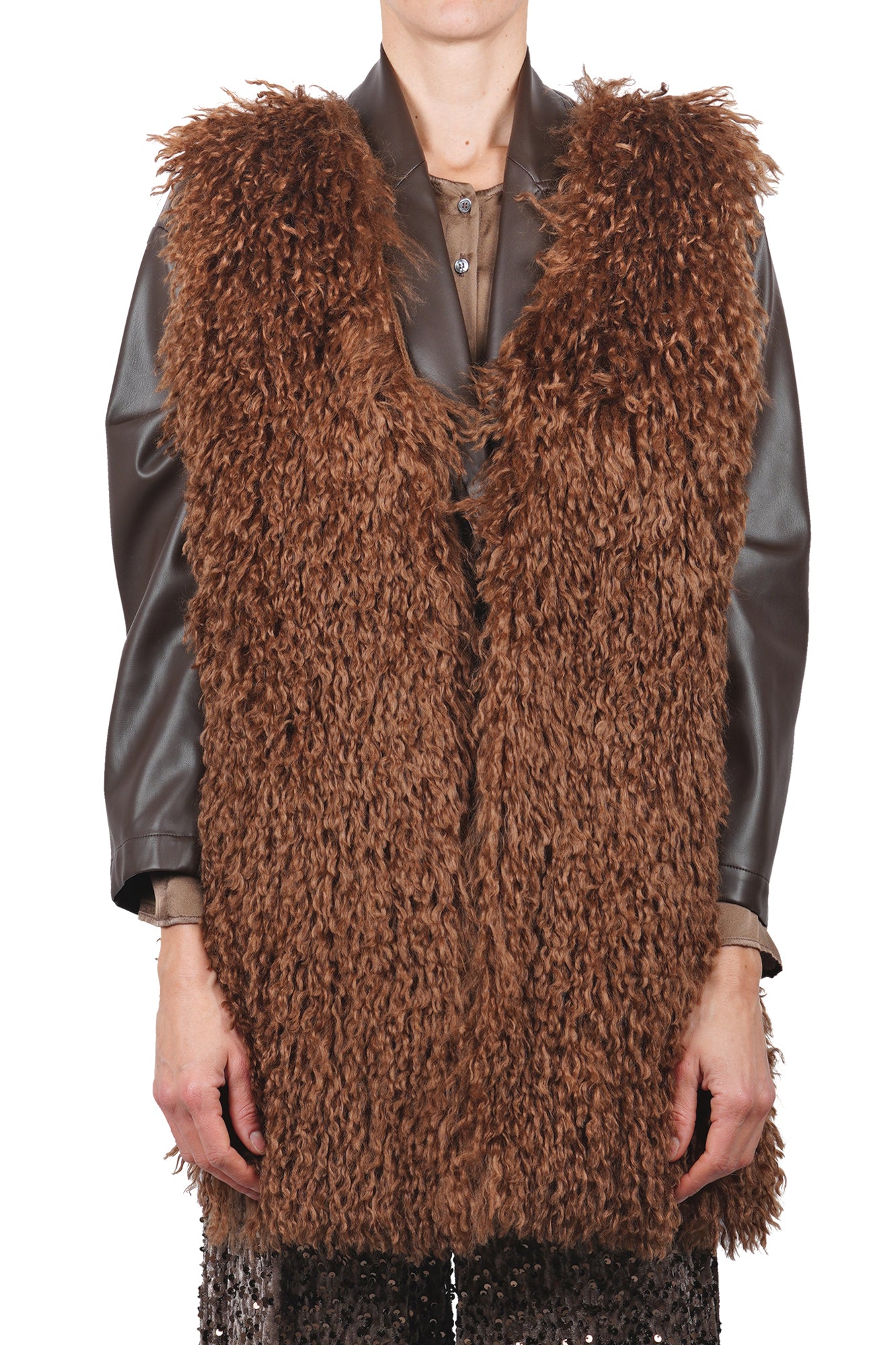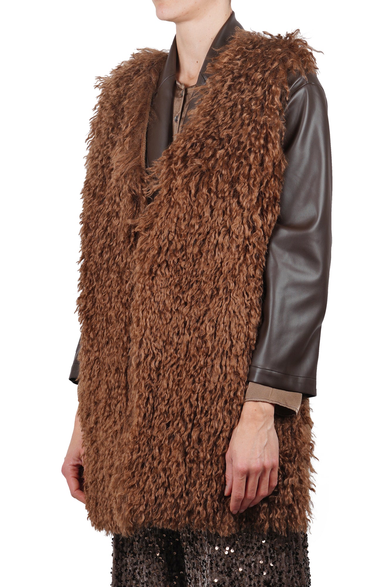 Knit vest with faux fur. Front part in long-pile synthetic fur with a curly effect. Back part made of ribbed knit. V-neck. Long and sleeveless model. Fabric composition: 100% Virgin wool. Faux fur fabric composition: 100% Polyester. Fit: loose. Made in Italy. The model is wearing a Size S and is 175 cm tall. The perfect piece to add a touch of texture and warmth to your winter looks.