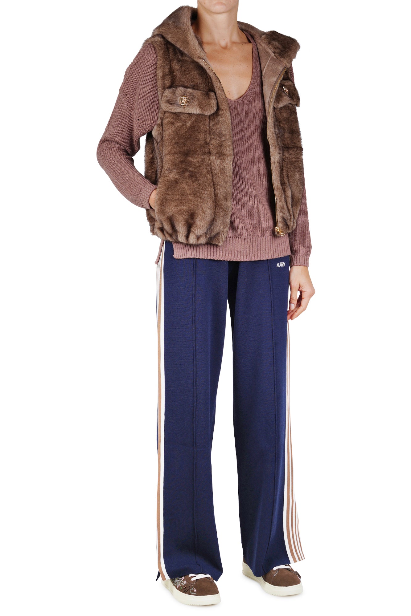 Eco-fur vest. Hood. Sleeveless. Front zip closure. Two fake chest pockets with flap. Jewelry applications. Two front welt pockets. Elastic at the bottom. Fabric composition: 100% acrylic. Lining composition: 100% polyester. Fit: regular. The model is wearing the Size S and is 175 cm tall. We love this vest for its contemporary and sophisticated character.