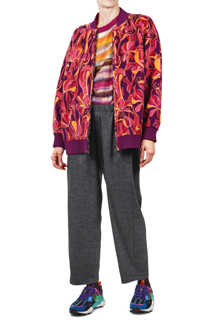 Ribbed collar, cuffs, and hem.