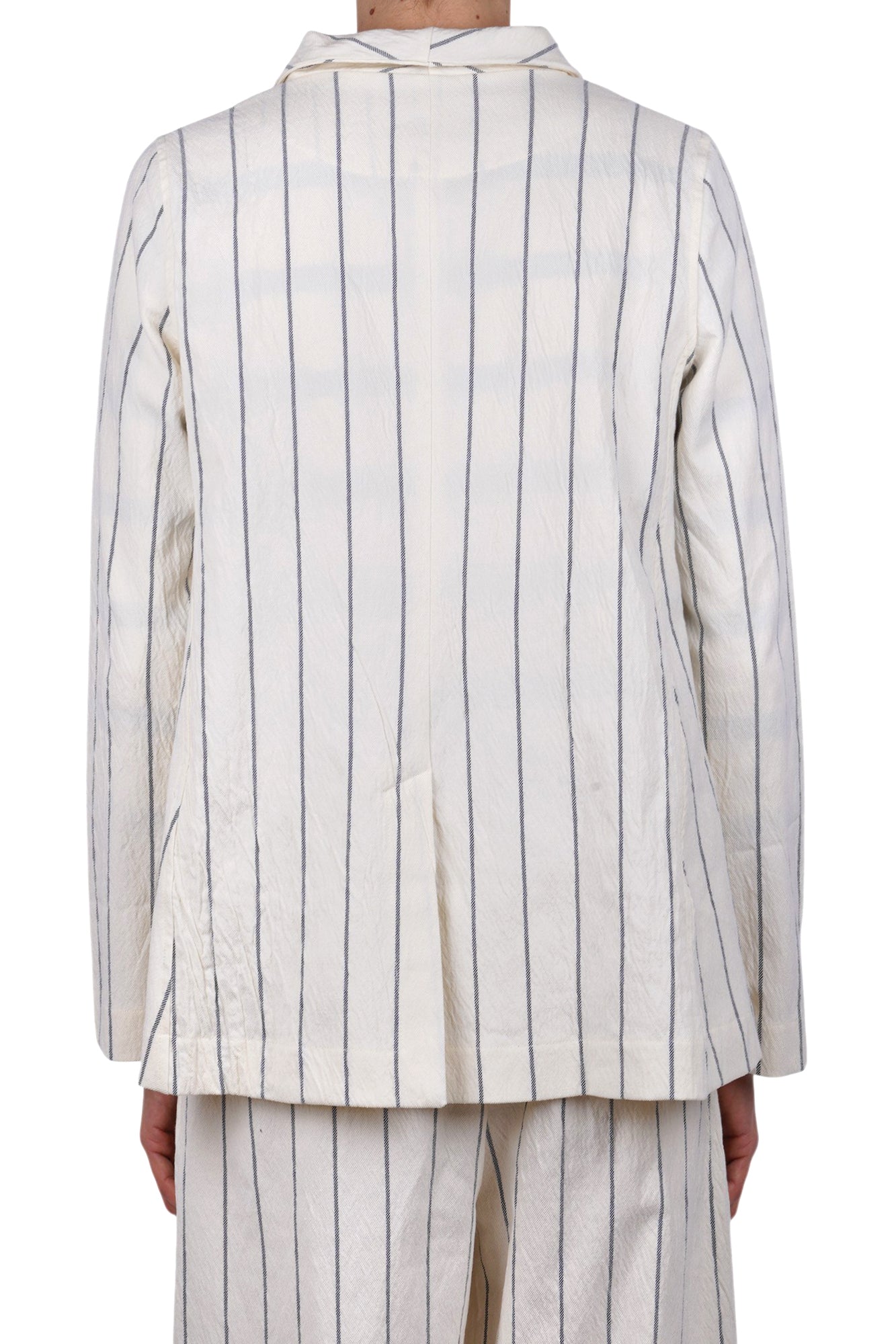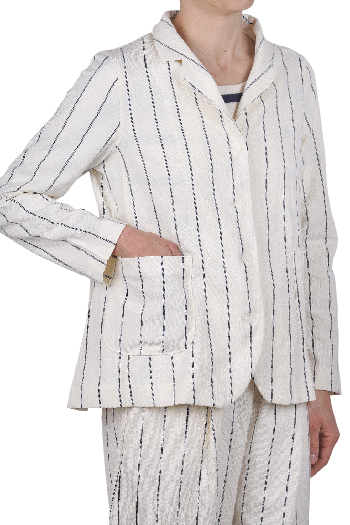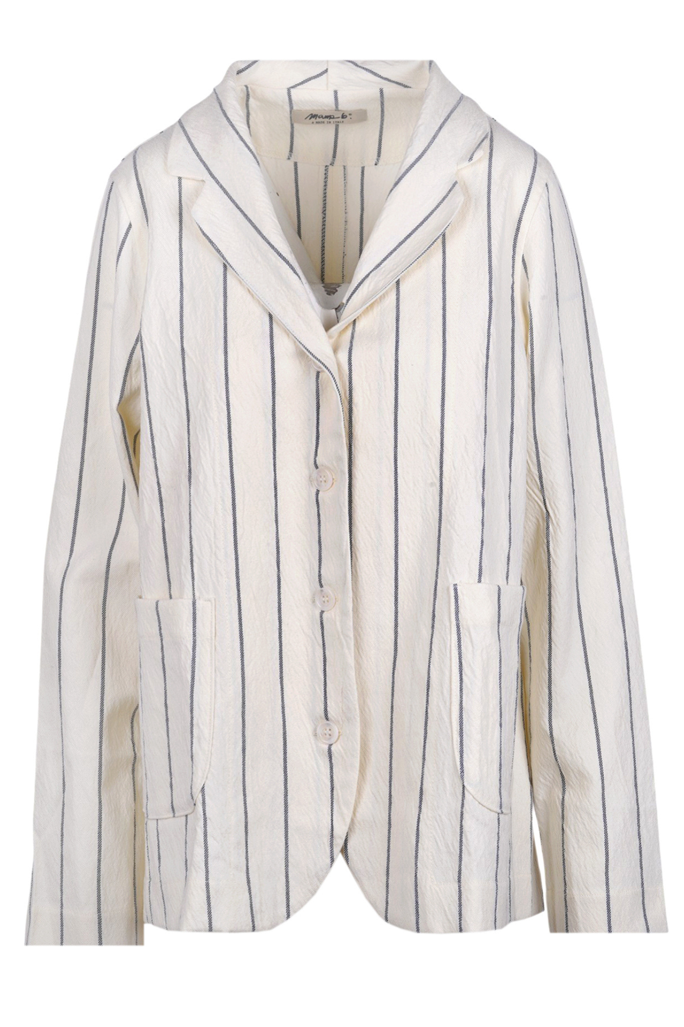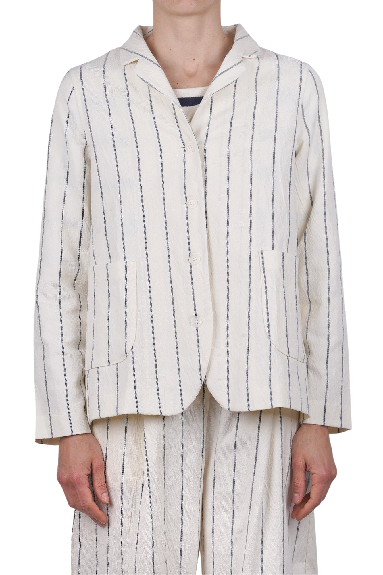Striped jacket in textured fabric. Notched collar. Long sleeves. Front button closure. Two applied pockets on the front. Rounded bottom. Central vent at the back. Fabric composition: 43% cotton; 35% polyester; 19% viscose; 1% polyamide; 1% metal. Fit: regular. Made in Italy. The model is wearing a Size S and is 175 cm tall. A versatile and comfortable piece, perfect for a refined everyday look.
