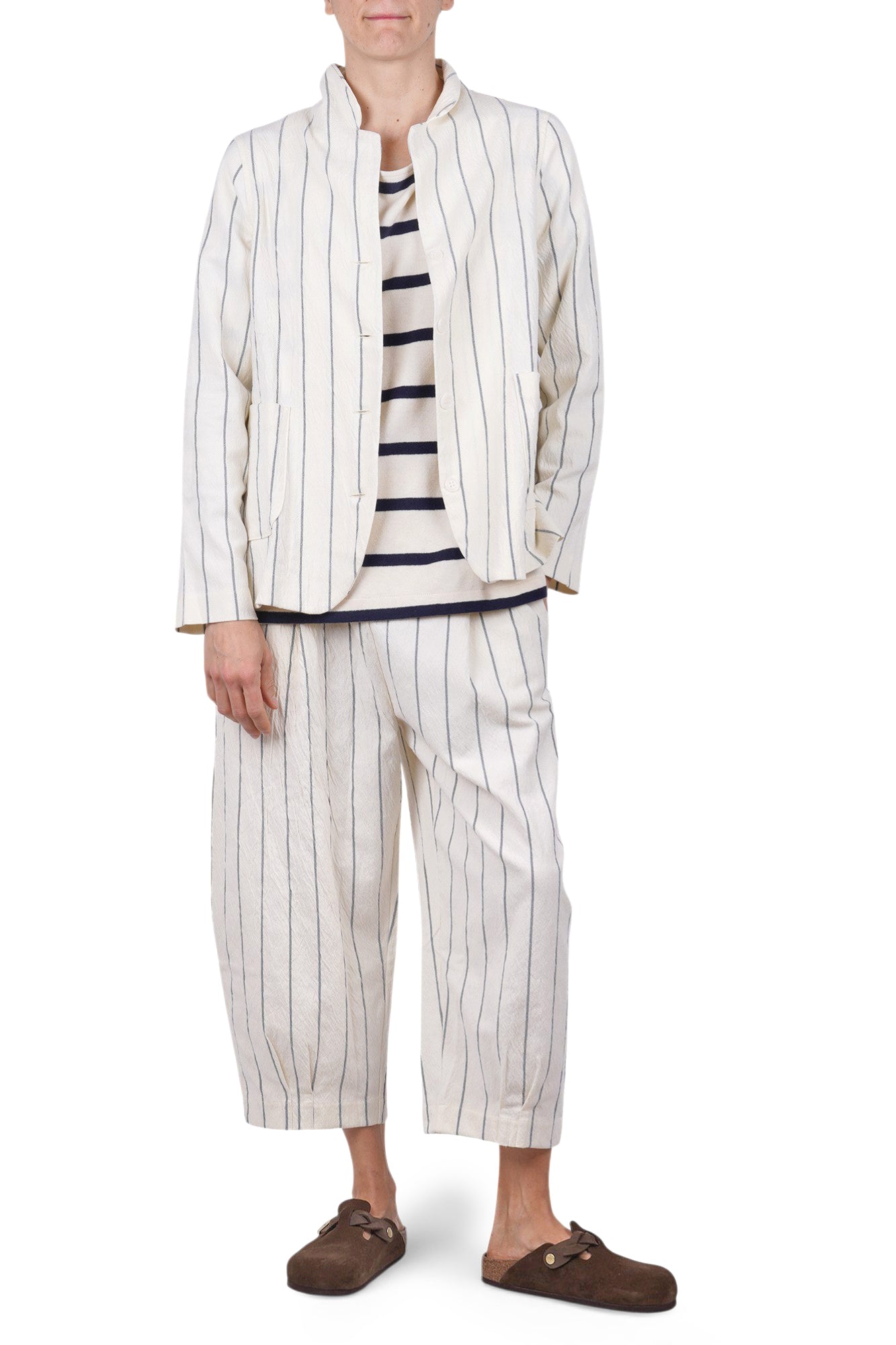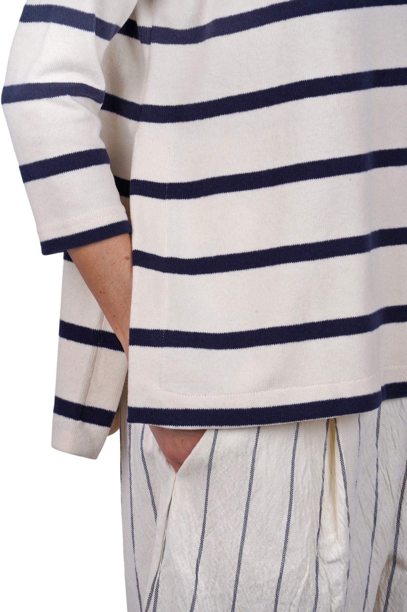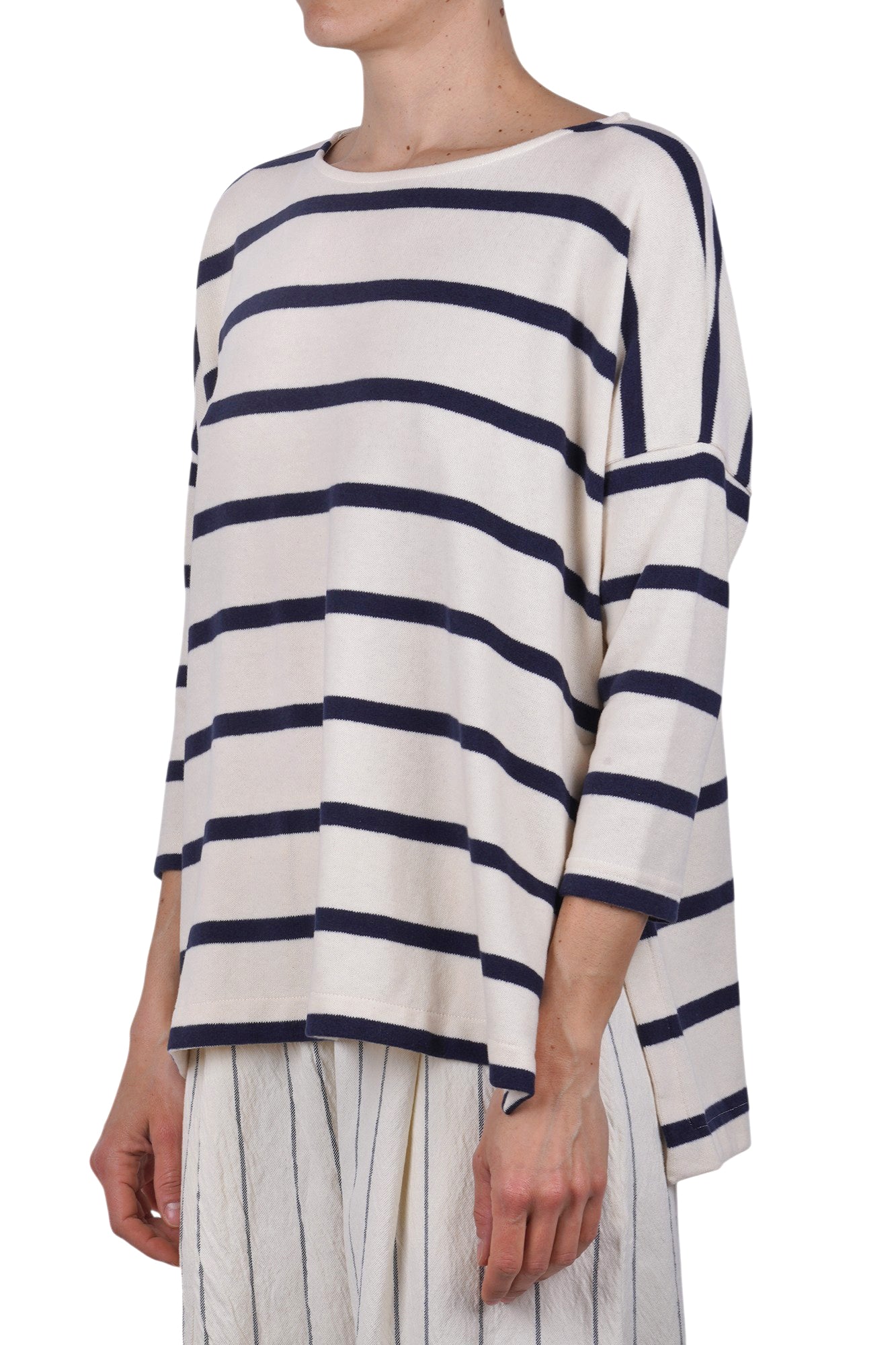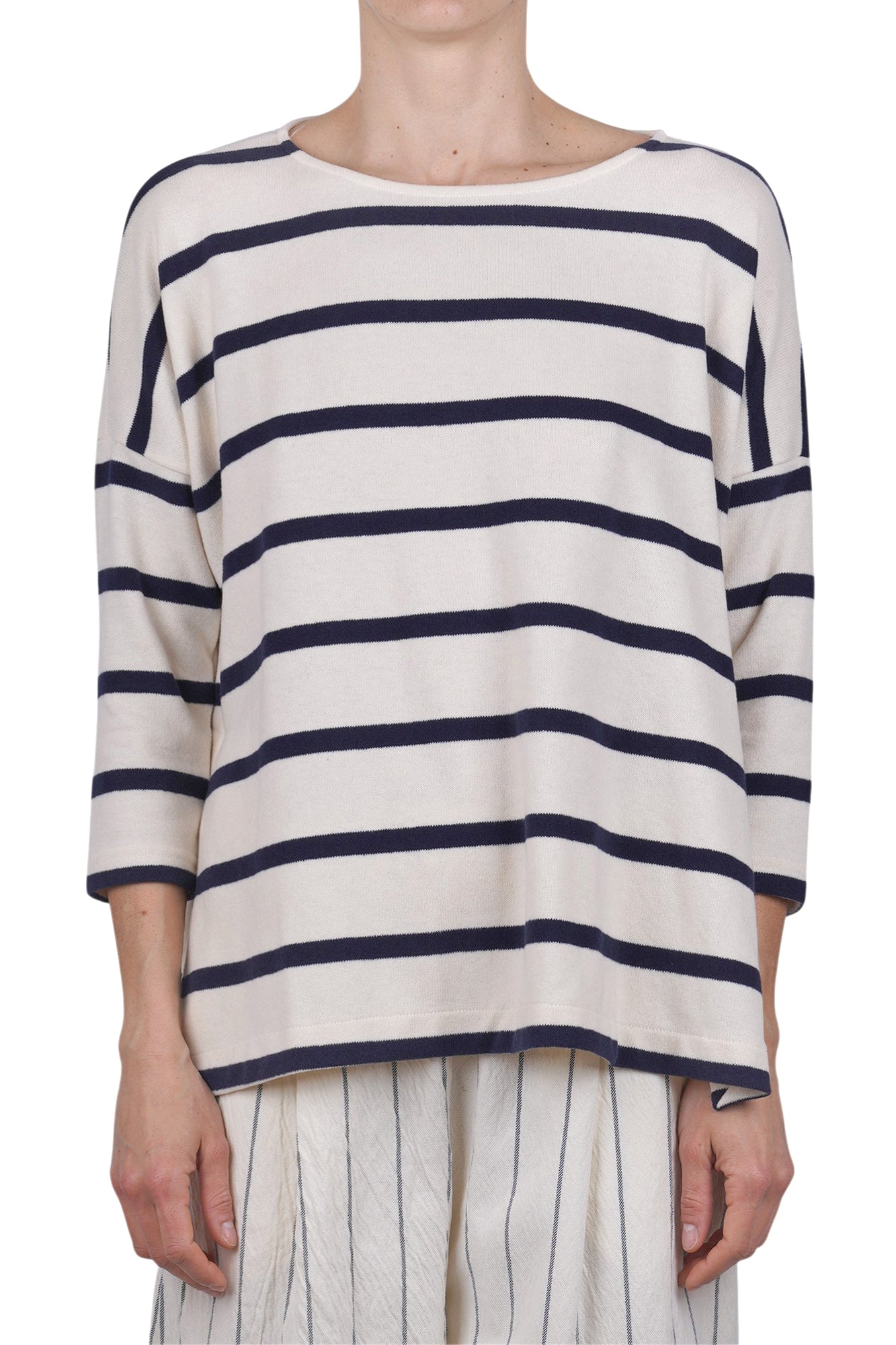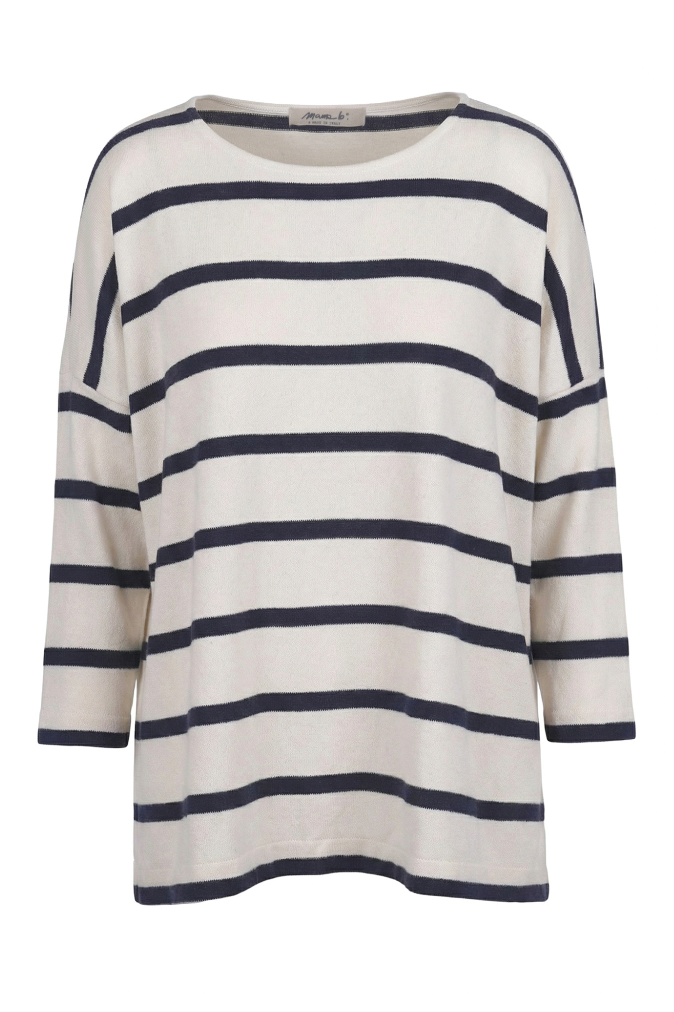 Emotional striped sweater. Boat neckline. Dropped shoulders. Three-quarter sleeves. Horizontal striped pattern. Square model. Side slits at the bottom. Fabric composition: 48% cotton; 48% acrylic; 4% elastane. Fit: wide. Made in Italy. The model is wearing a Size S and is 175 cm tall. A versatile and comfortable garment for a casual chic look.