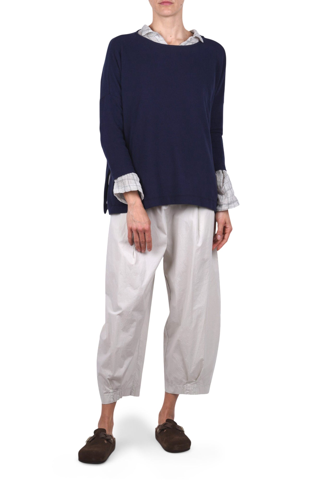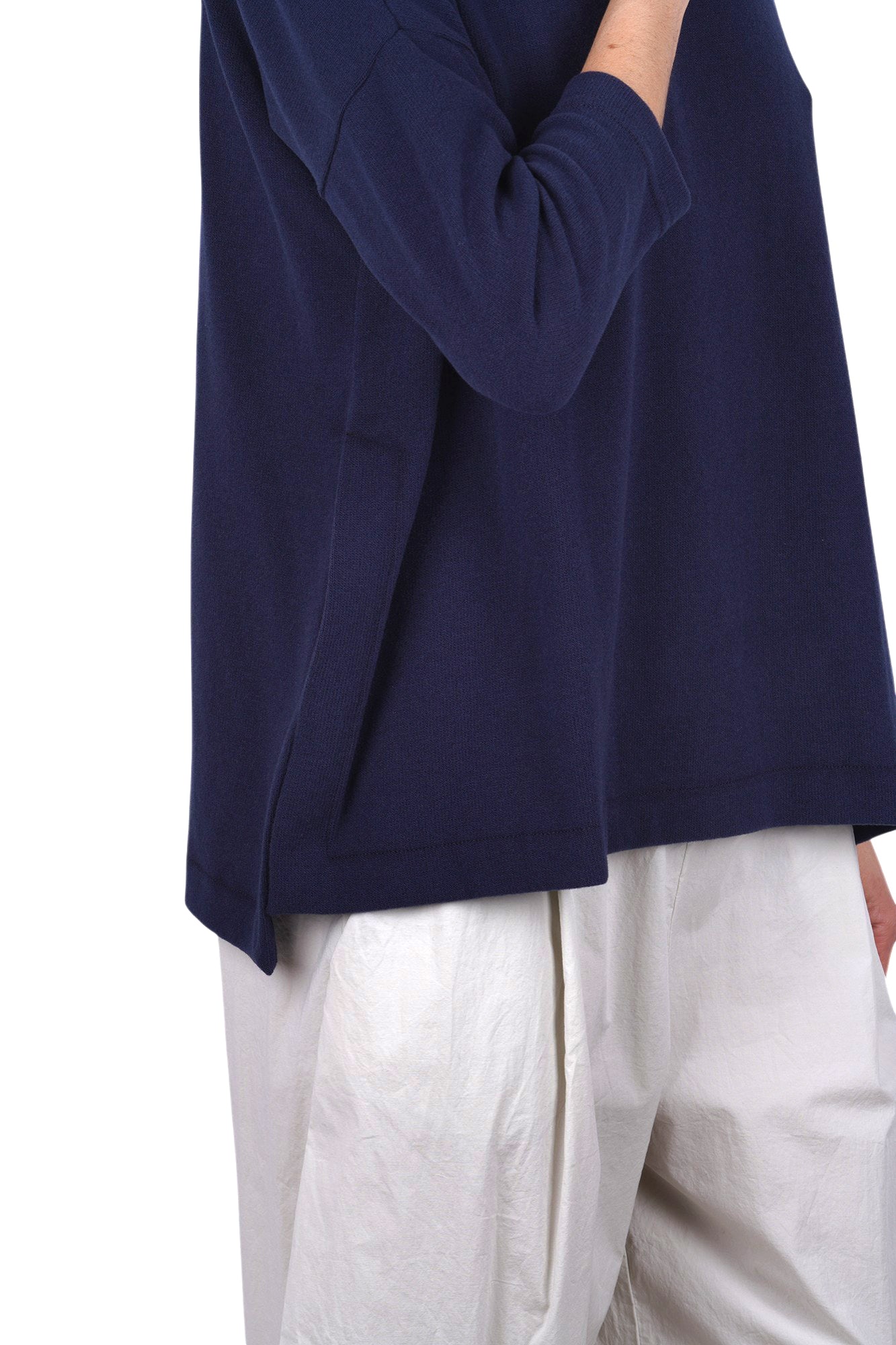 Dropped shoulder and three-quarter sleeves.