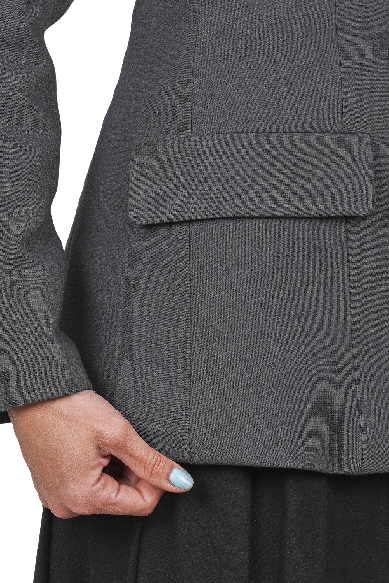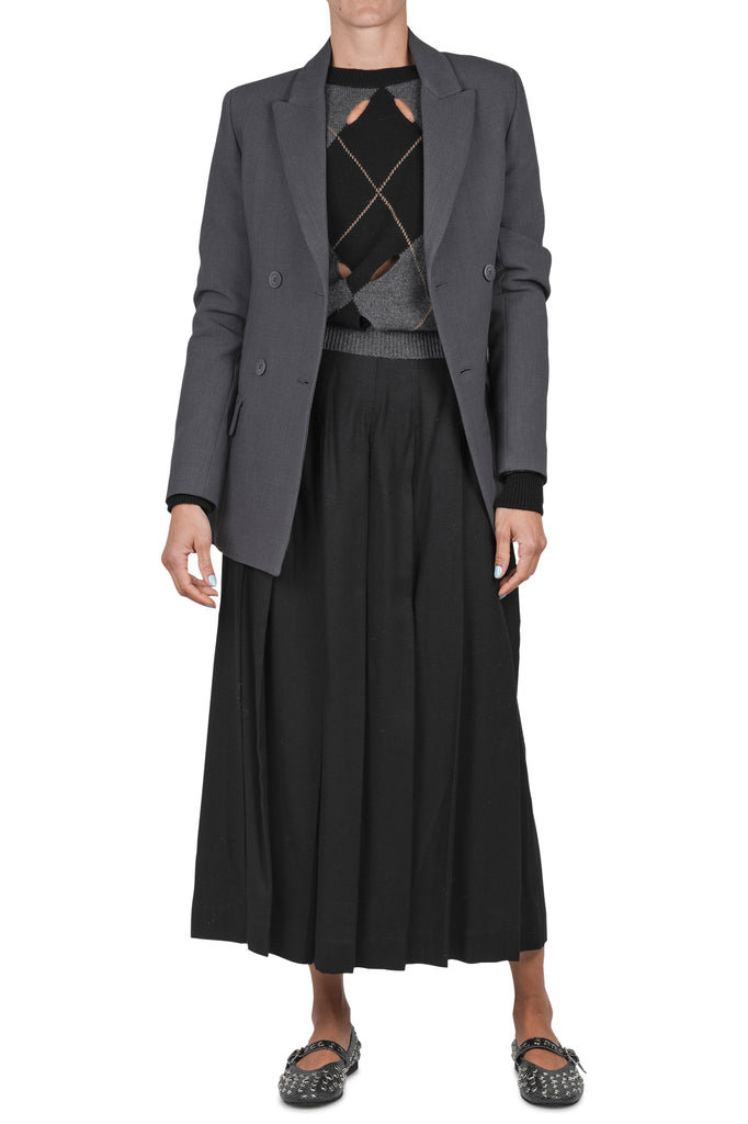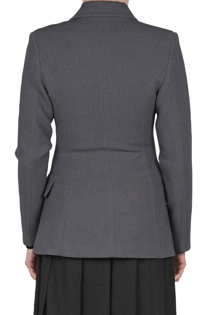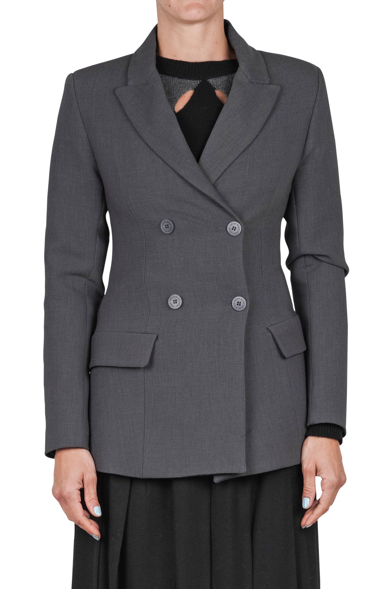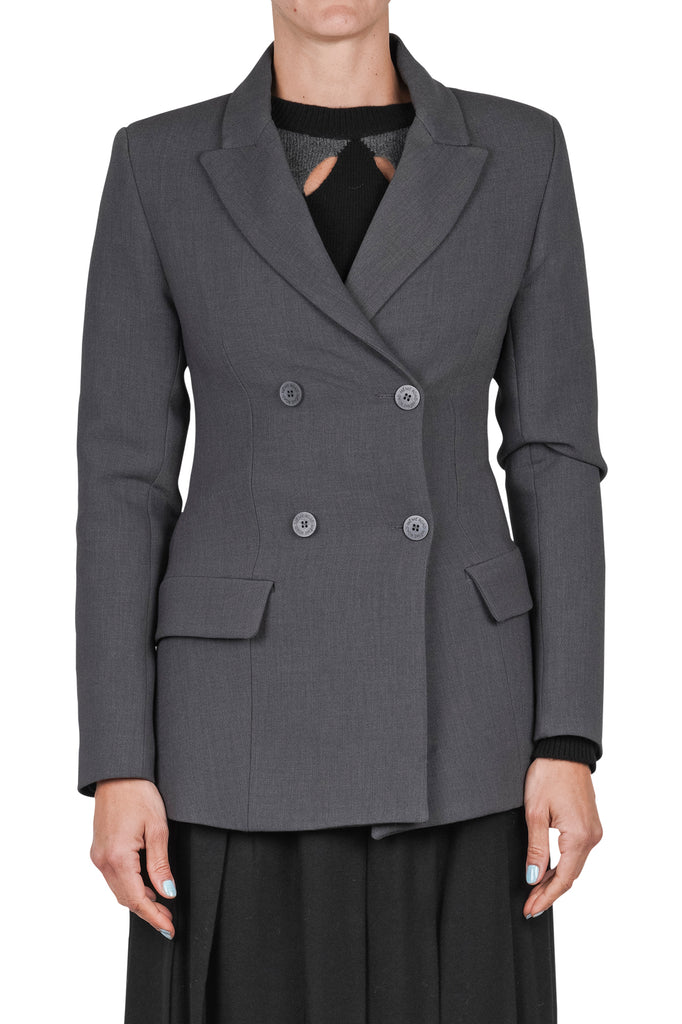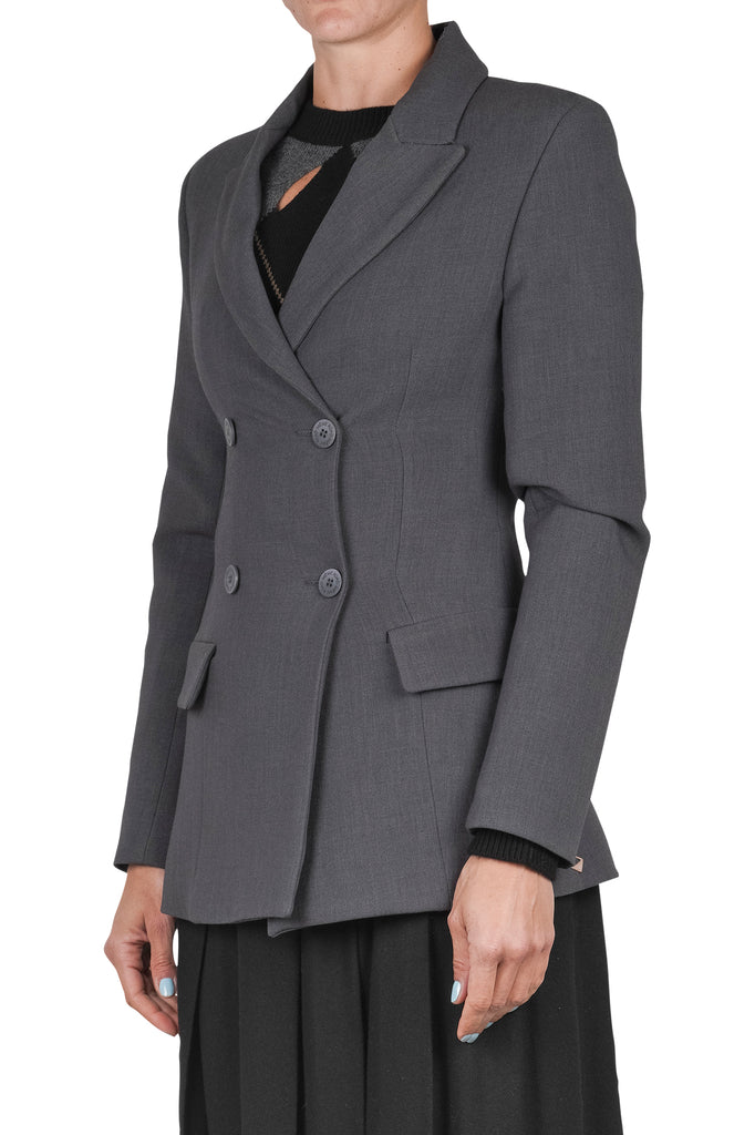 Double-breasted jacket. Revers collar. Slightly padded shoulders. Long sleeves. Double-breasted closure with branded buttons. Front pleats. Two fake front pockets. Lined. Pleats on the back. Fabric composition: 63% polyester, 32% rayon, 5% elastane. Lining composition: 95% polyester, 5% elastane. Fit: regular. The model wears a Size size 38 and is 175cm tall. We love this jacket because it adds a chic and elegant touch to basic looks.
