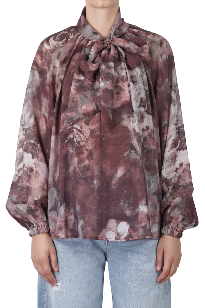 Blouse with floral print. High collar with buttons on the back. Ribbons to tie at the front. Small drop opening at the back. Long raglan sleeves with elastic at the bottom. Straight cut. Fabric composition: 75% viscose, 25% nylon. Fit: regular. Made in Italy. The model wears size Size 40 and is 175 cm tall. We love this blouse for its pattern and the fluidity of the fabric.