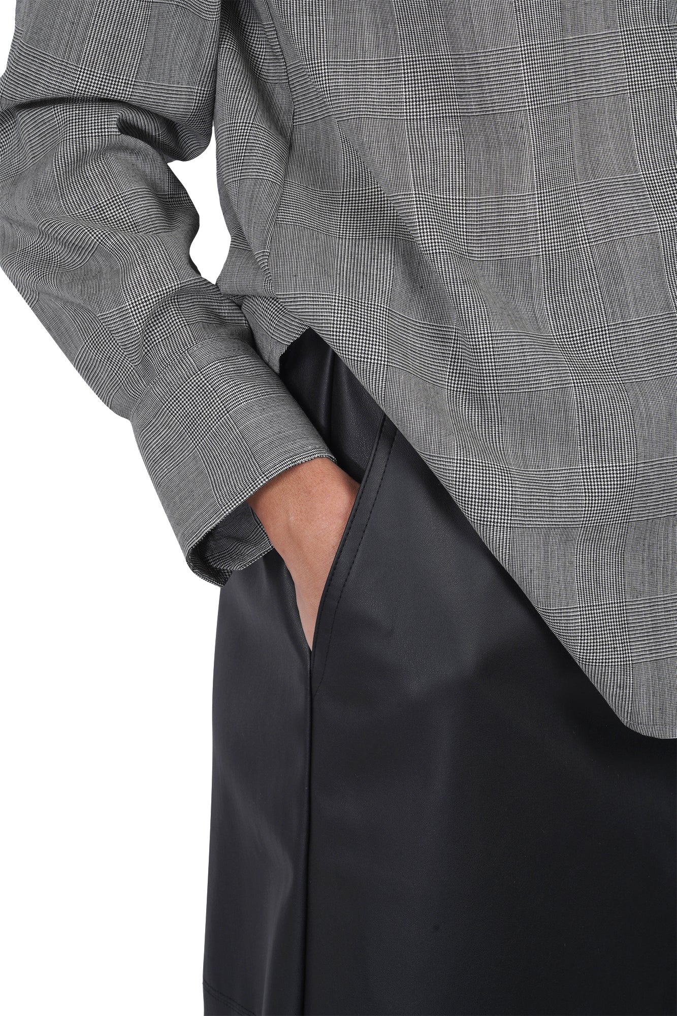 Front closure with hidden zip and covered button.