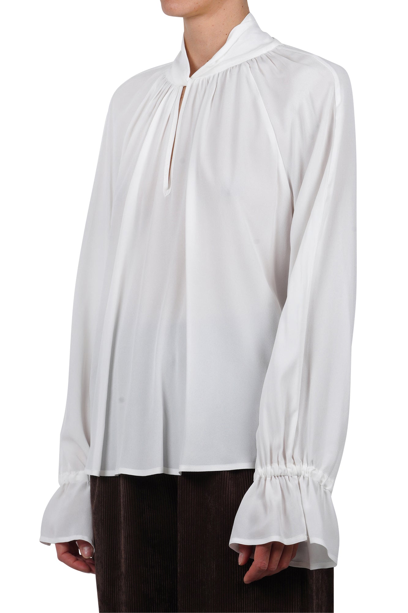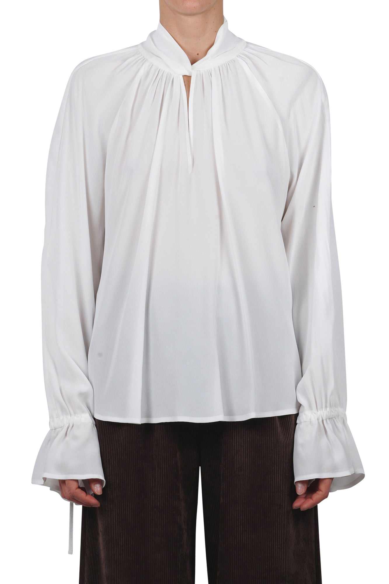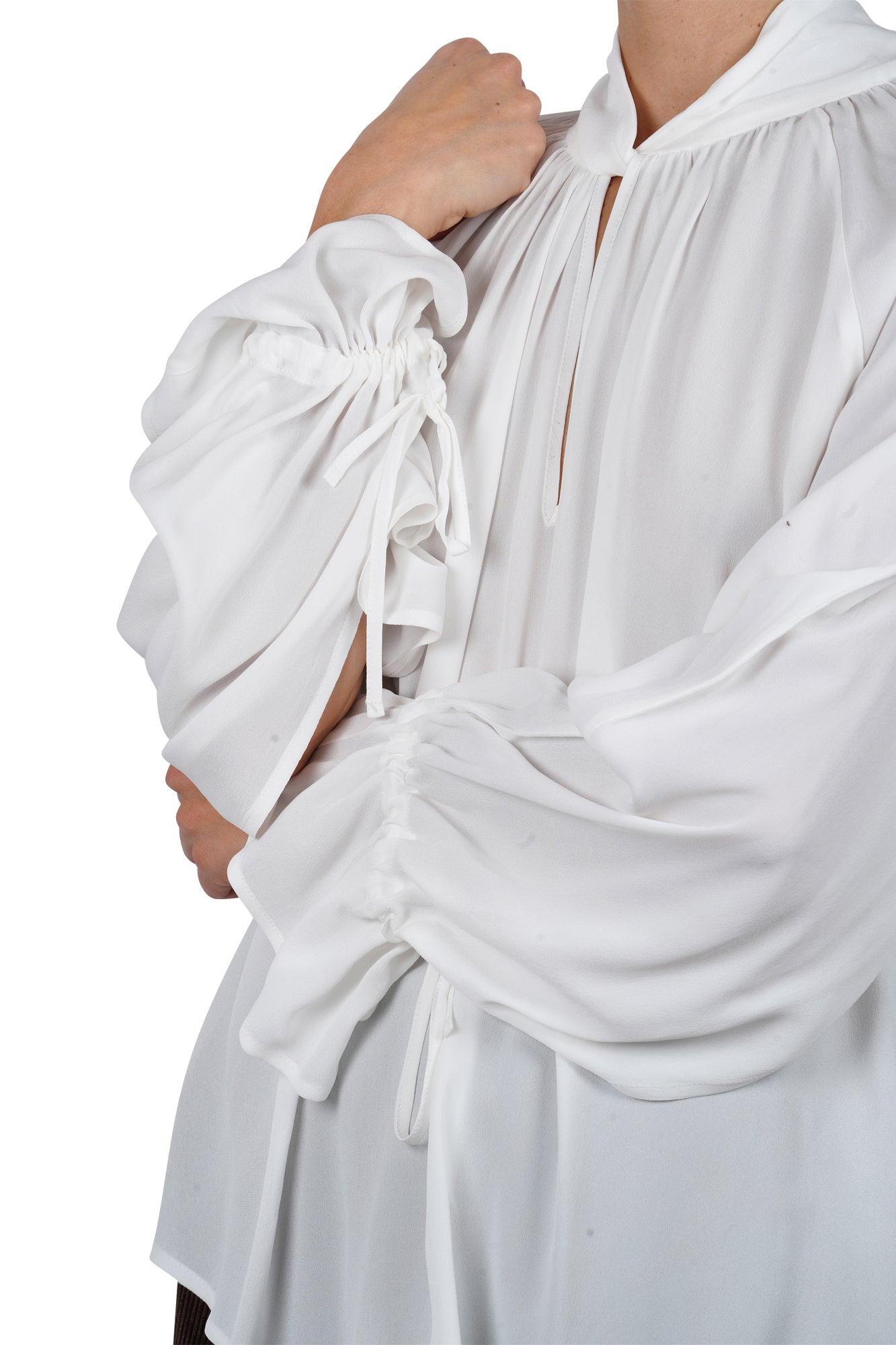 - Dettagli eleganti: Il collo alto arricciato e i polsini con rouche e laccetti aggiungono un tocco raffinato al capo.