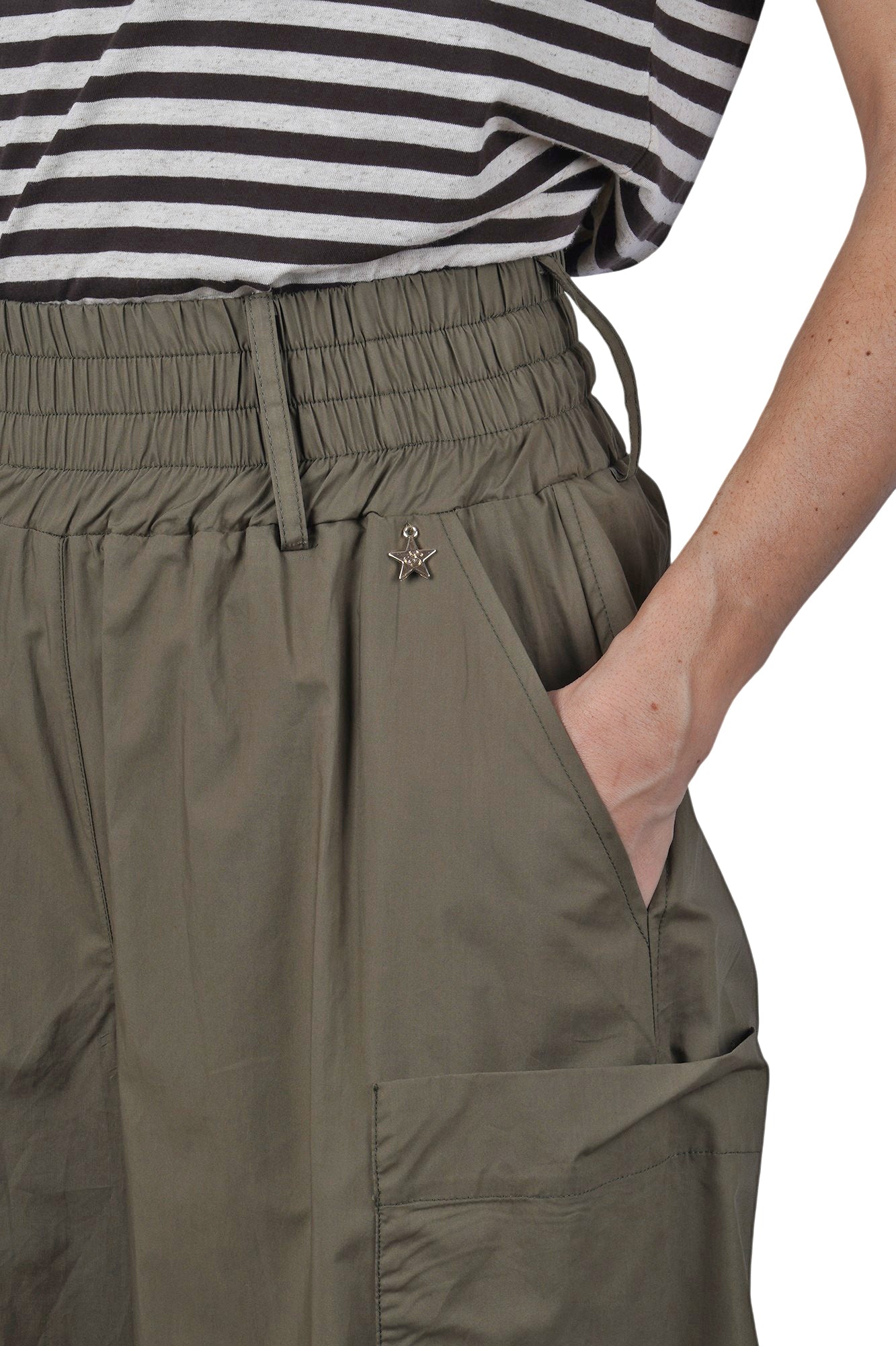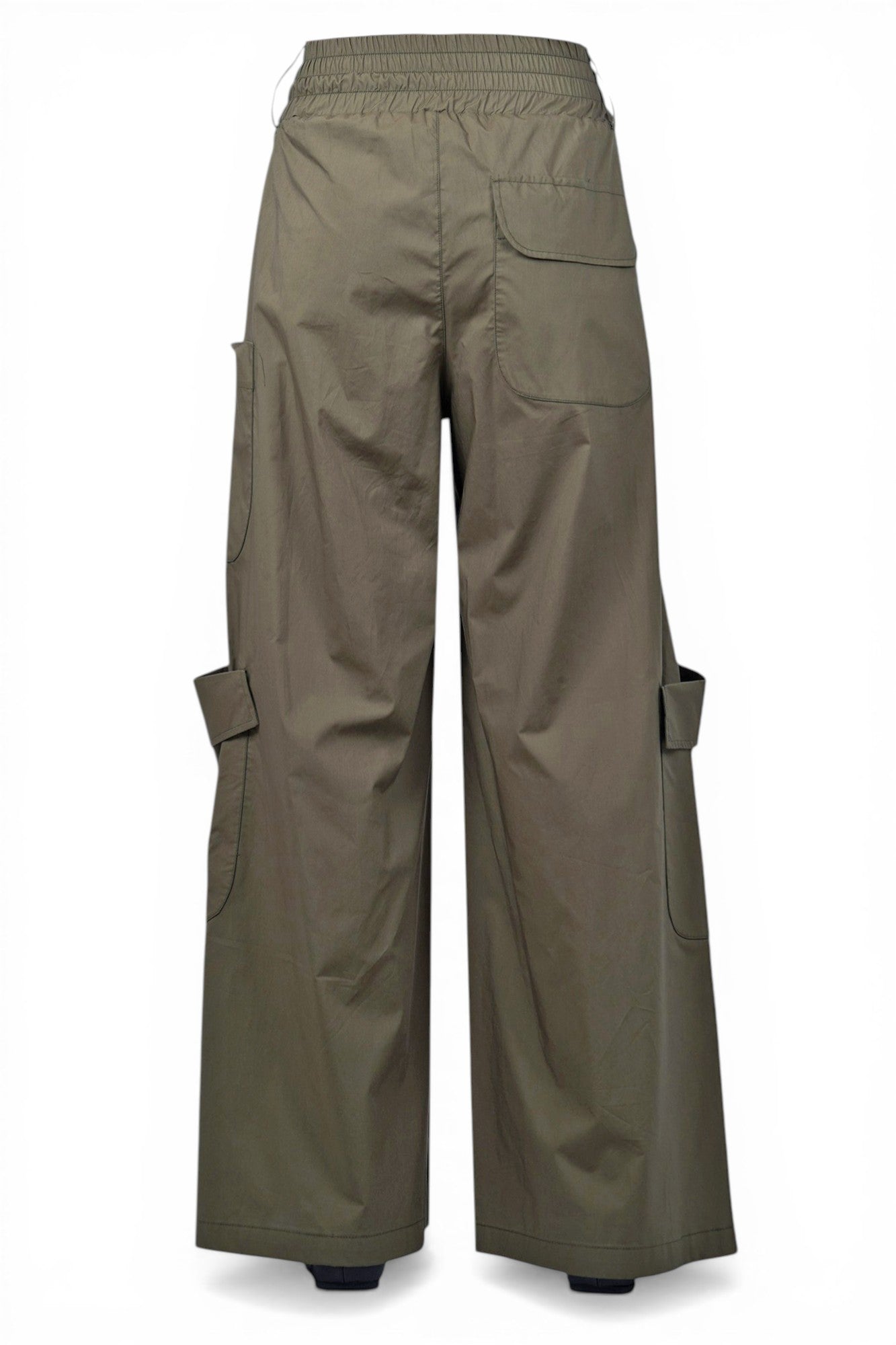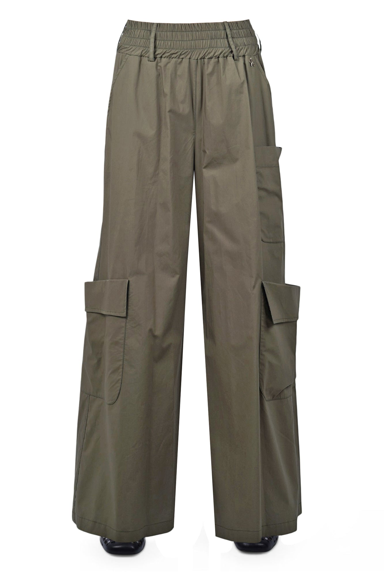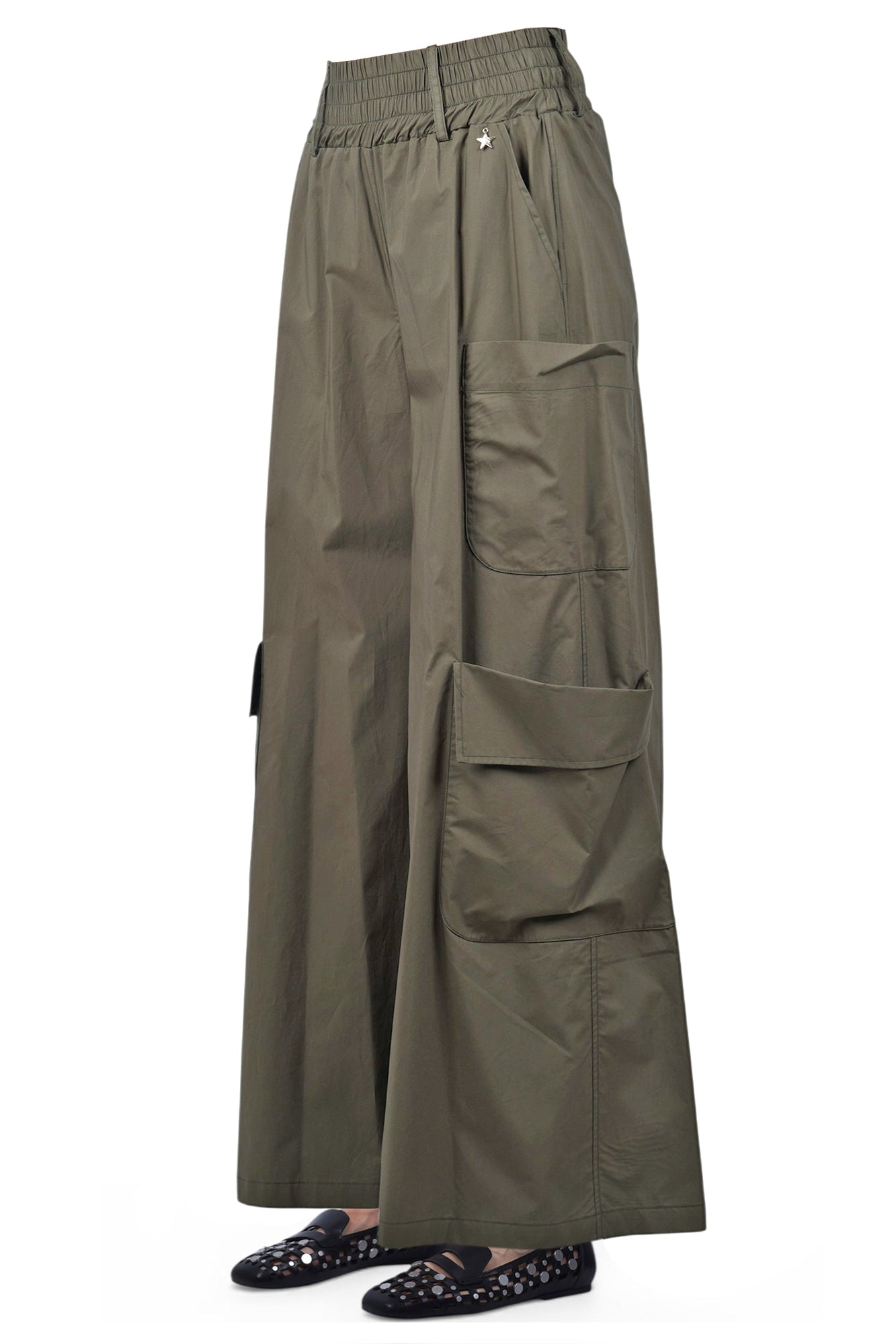 Pantalone cargo in cotone. Vita alta elasticizzata e arricciata. Passanti per cintura. Tasche a filetto oblique. Tasca applicata sul retro. Grandi tasche applicate sulle gambe. Gamba ampia. Larghezza fondo: 44 cm. Composizione: 100% cotone. Vestibilità: regolare. Made in Italy. La modella indossa una taglia XS ed è alta 175 cm. Questi pantaloni sono perfetti per un look casual ma ricercato.