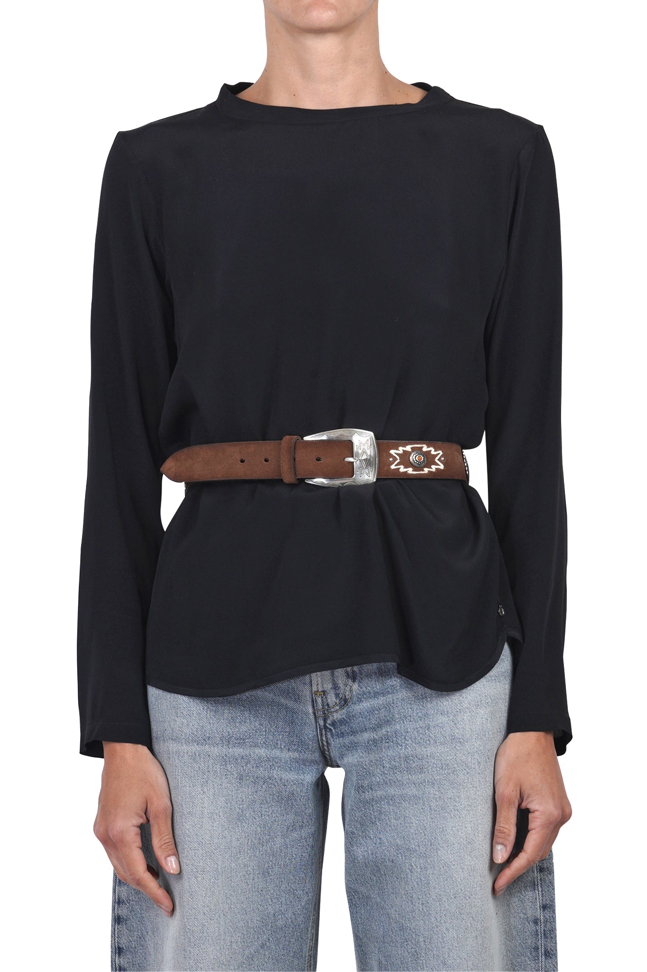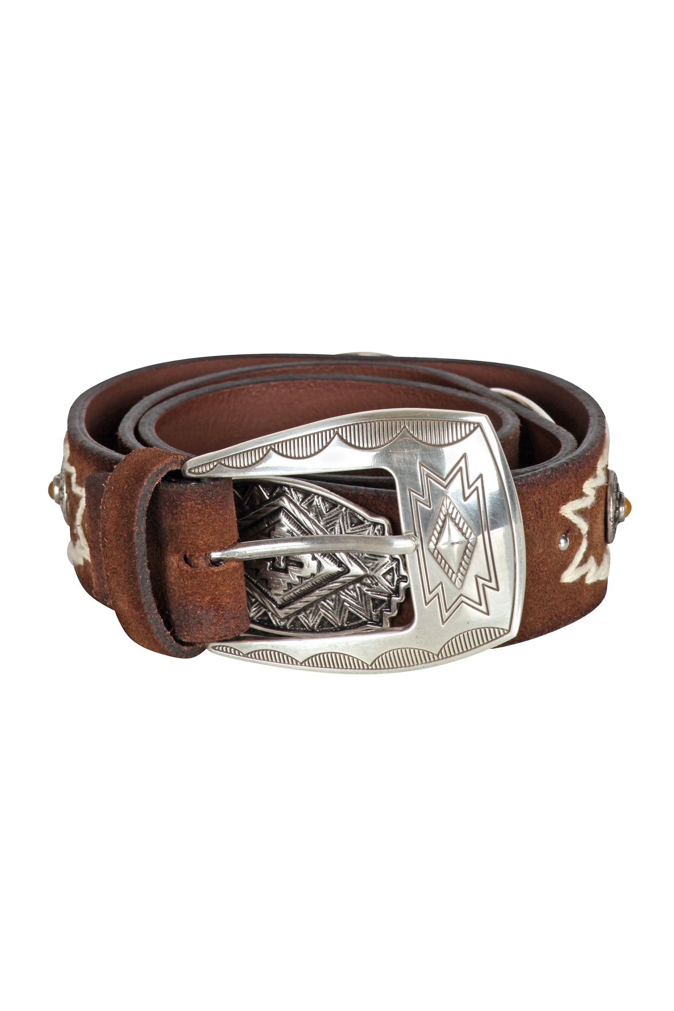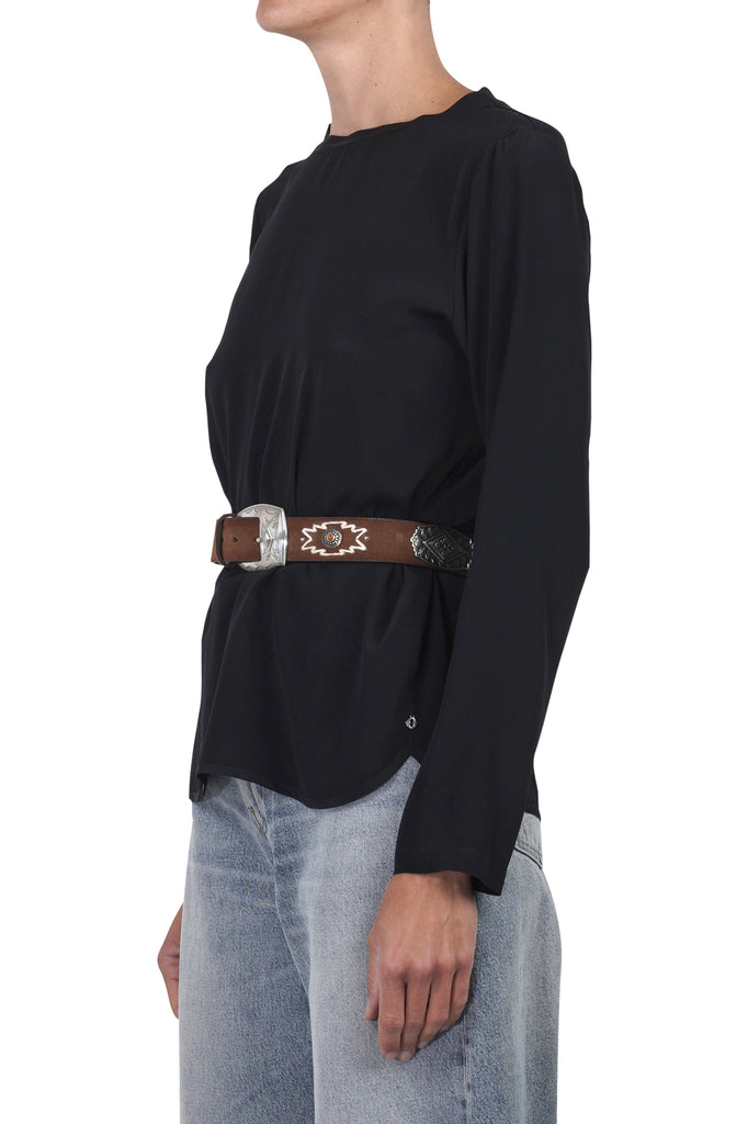 Cintura in pelle con borchie e pietre incastonate.