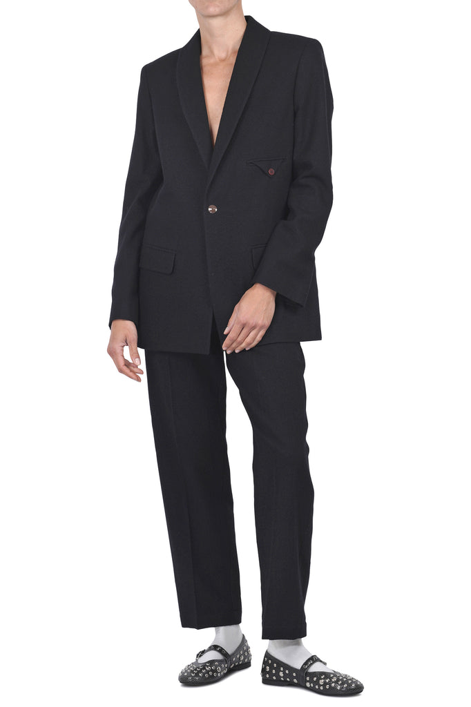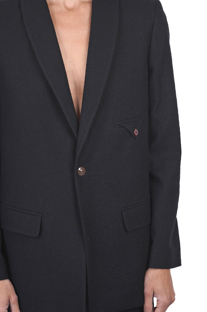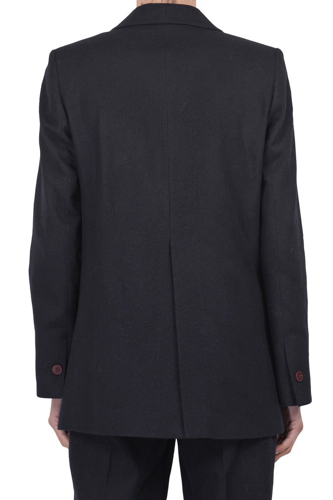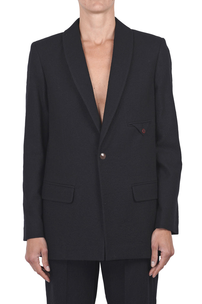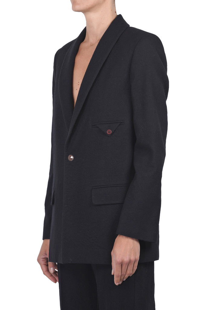Blazer in lana. Collo con revers sciallati. Spalline leggermente imbottite. Maniche lunghe con bottone al fondo. Tasca frontale a filetto sul petto con bottone. Chiusura frontale con bottone smaltato. Due tasche frontali patta. Ampio spacco al fondo sul retro. Foderata. Composizione tessuto: 100% lana vergine. Composizione fodera: 100% acetato. Vestibilità: ampia. Made in Italy. La modella indossa la taglia 40 ed è alta 175 cm. Amiamo questo blazer per il carattere easy e versatile.