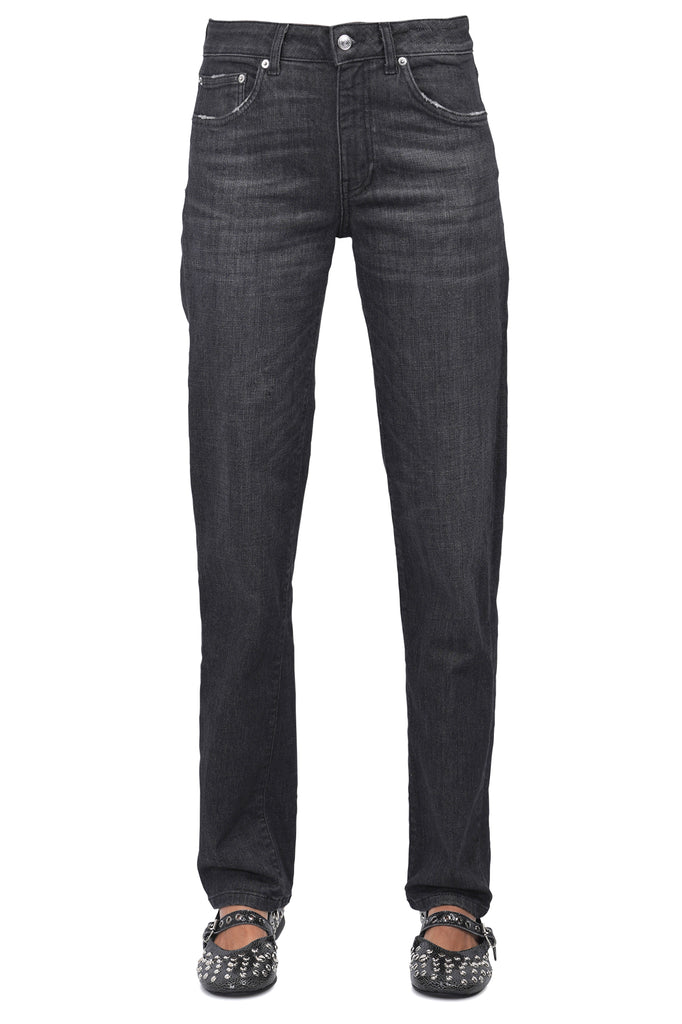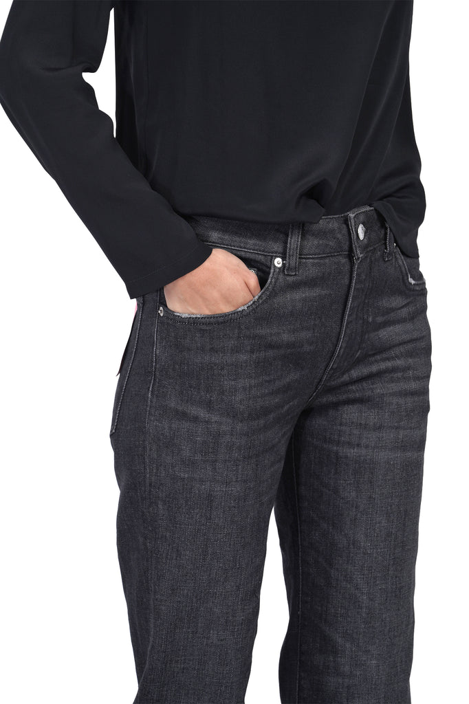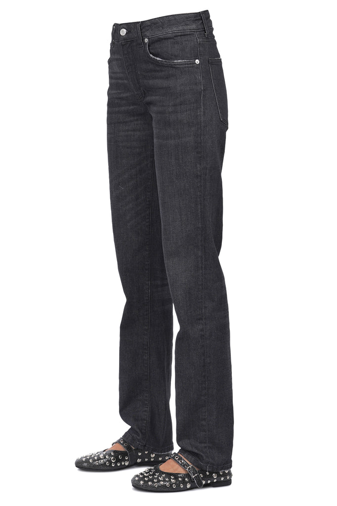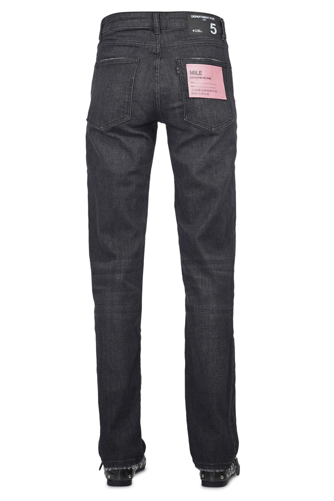 Jeans dritto nero. Passanti per cintura. Chiusura frontale con bottone logato e zip. Cinque tasche. Dettagli e piccoli strappi effetto vitage. Tag con logo applicato sul retro. Gamba dritta. Larghezza fondo: 18 cm. Composizione tessuto: 98% cotone, 2% elastane. Vestibilità: regolare. La modella indossa la taglia 26 ed è alta 175 cm. Amiamo questi jeans per il twist grintoso e i dettagli grunge.