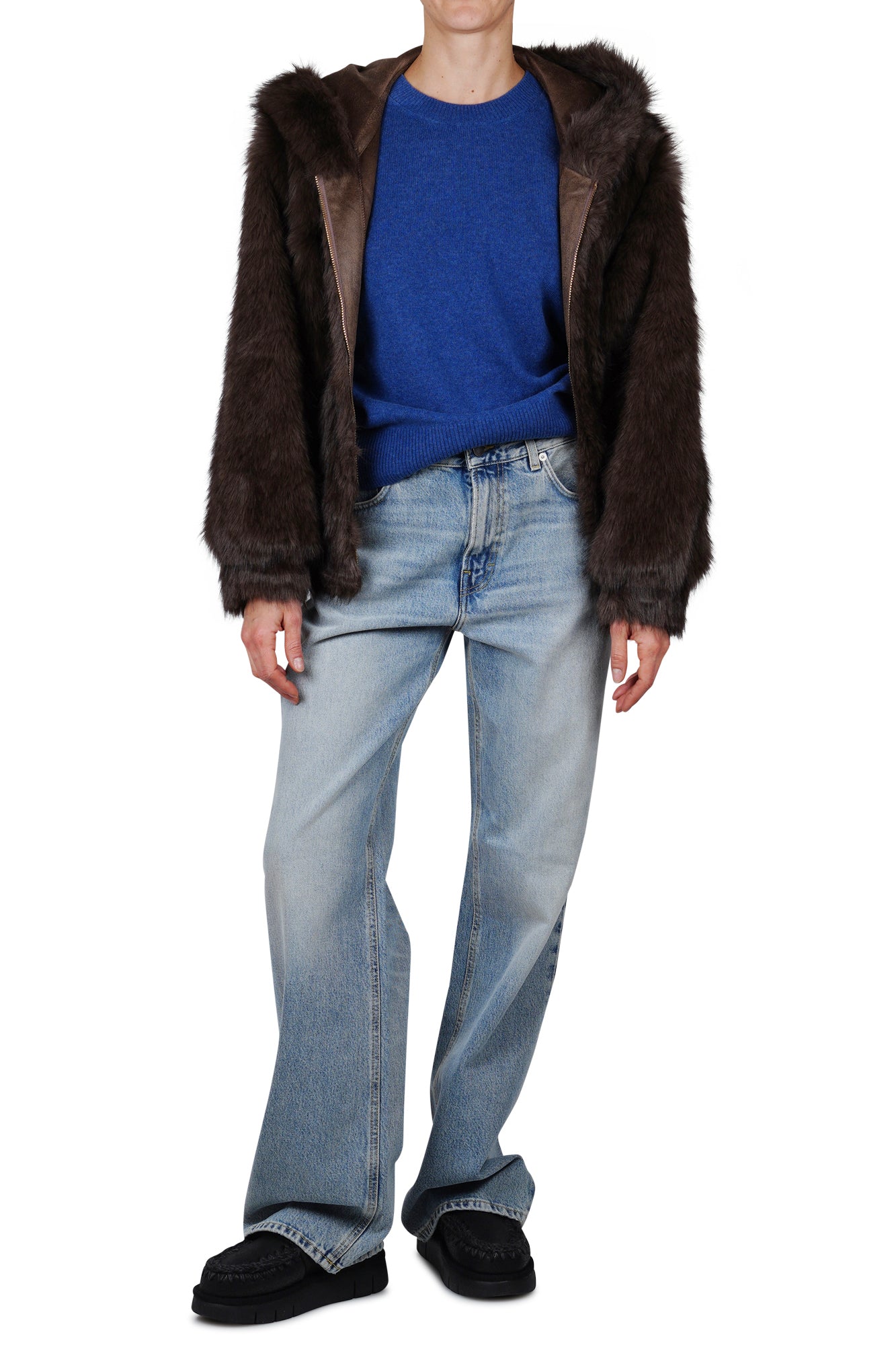 Chiusura frontale con zip e bottone.