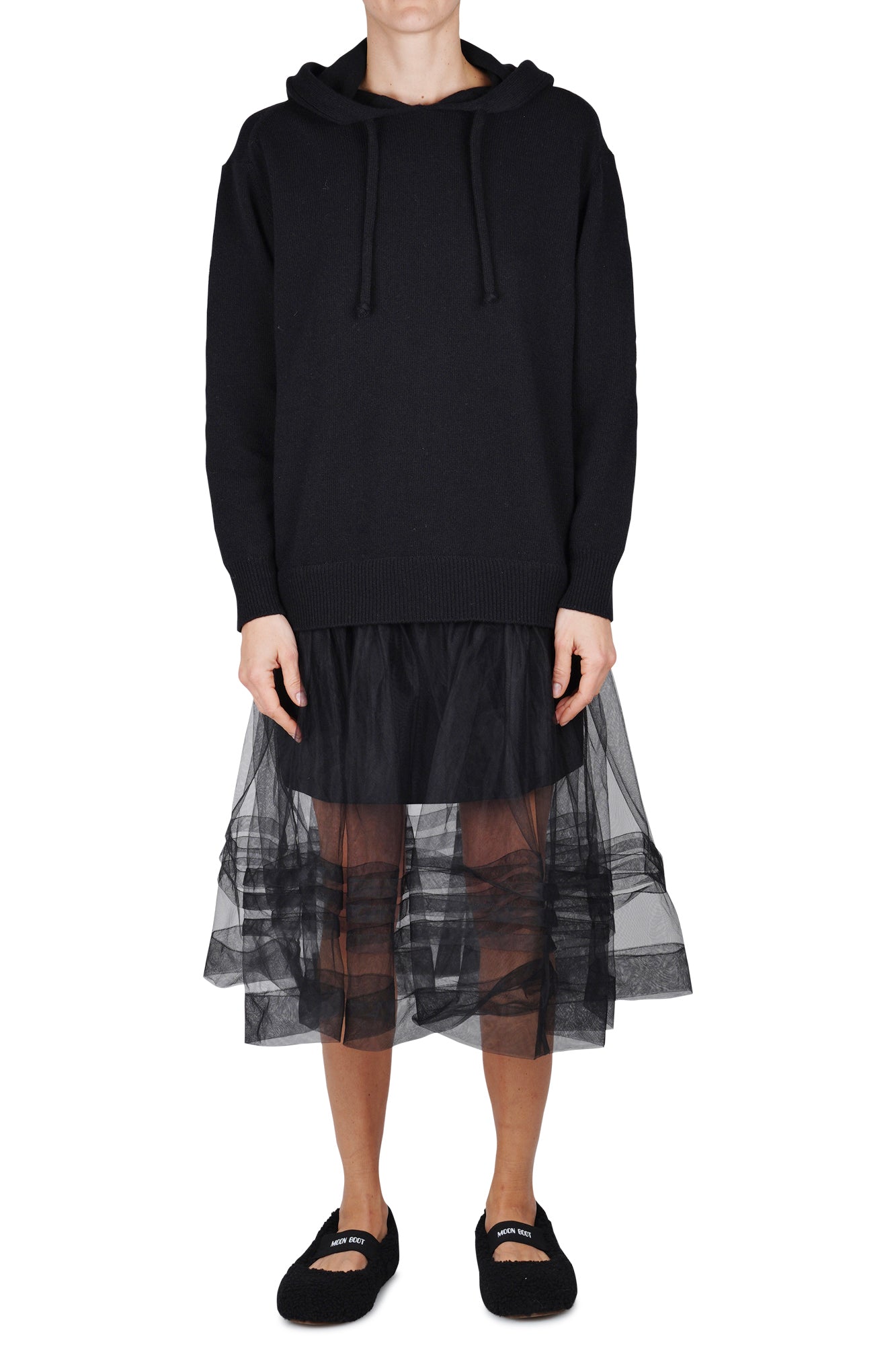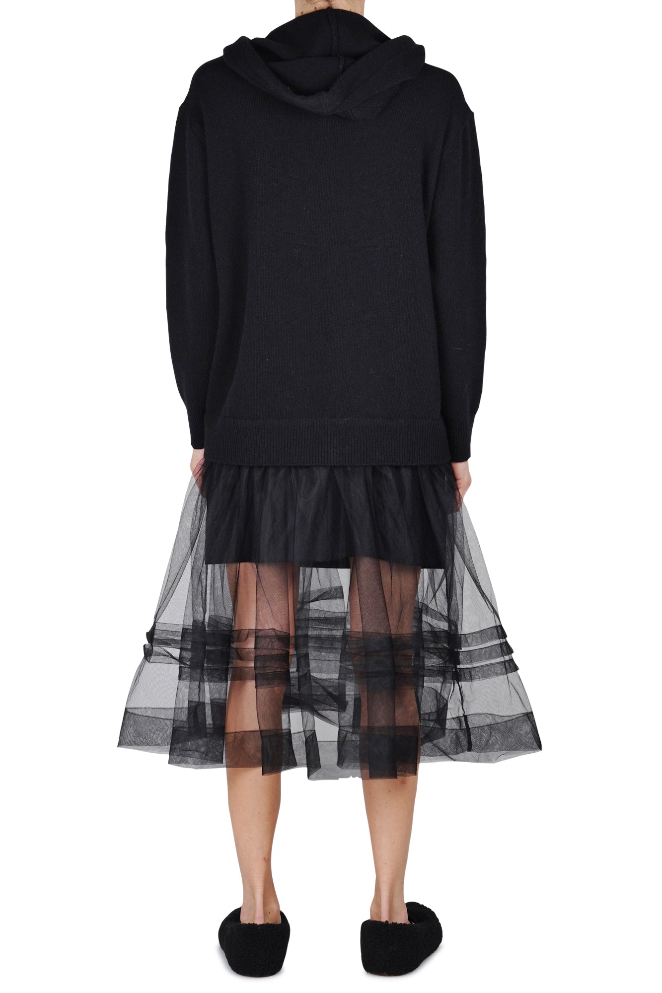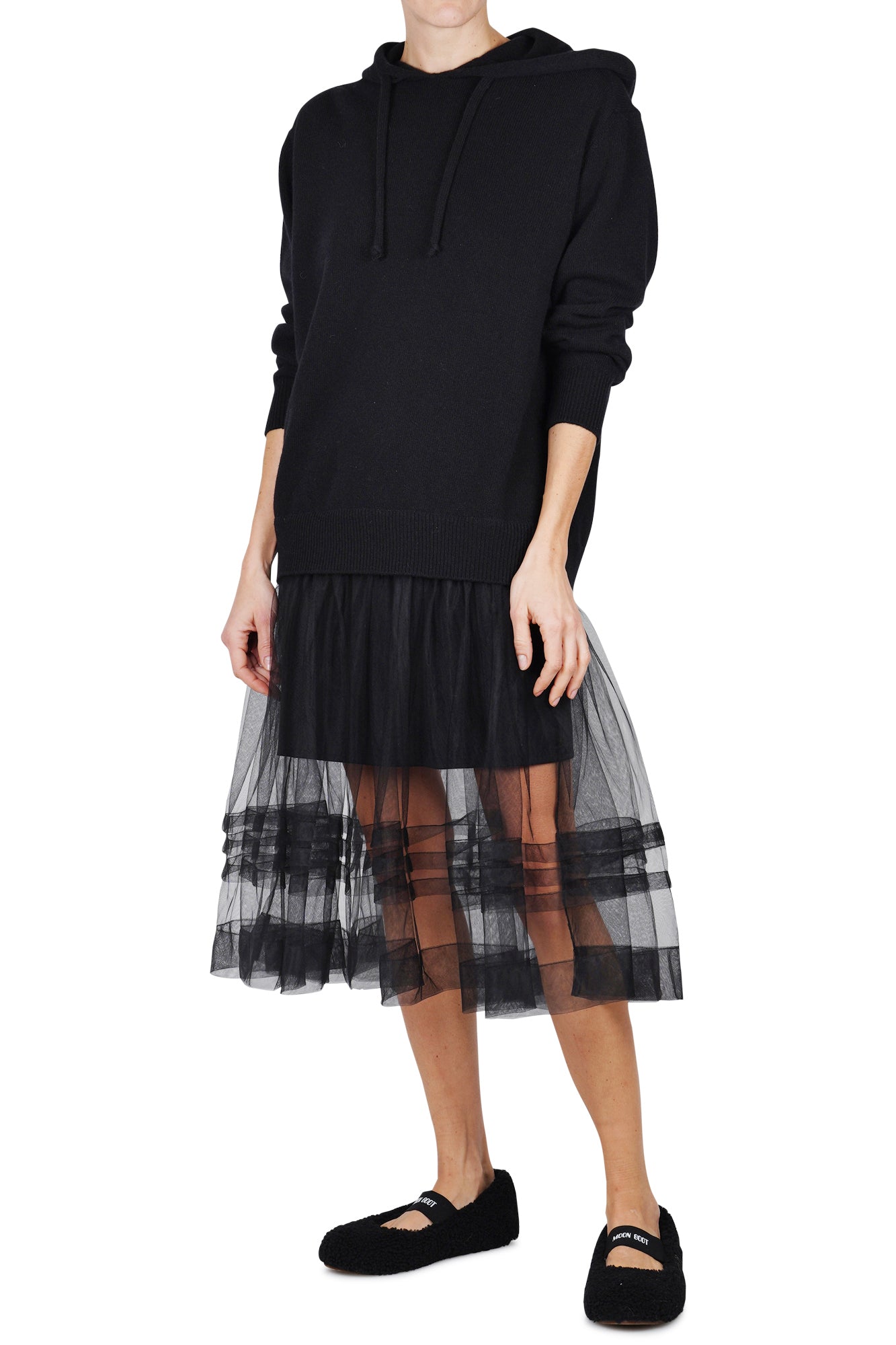 Dettaglio gonna in tulle attaccata al fondo della felpa.