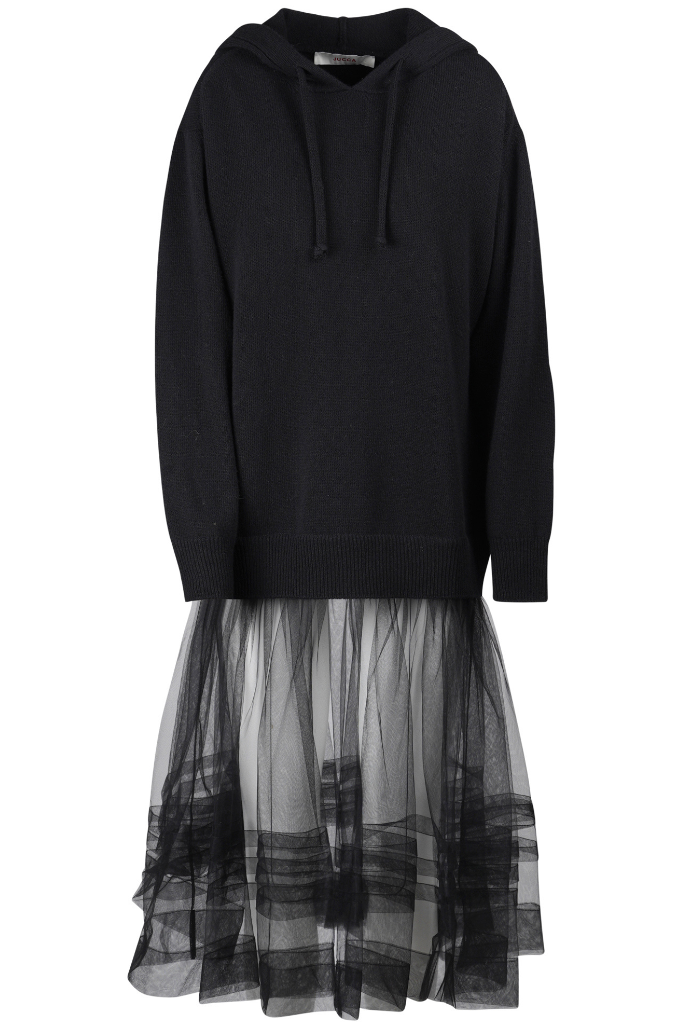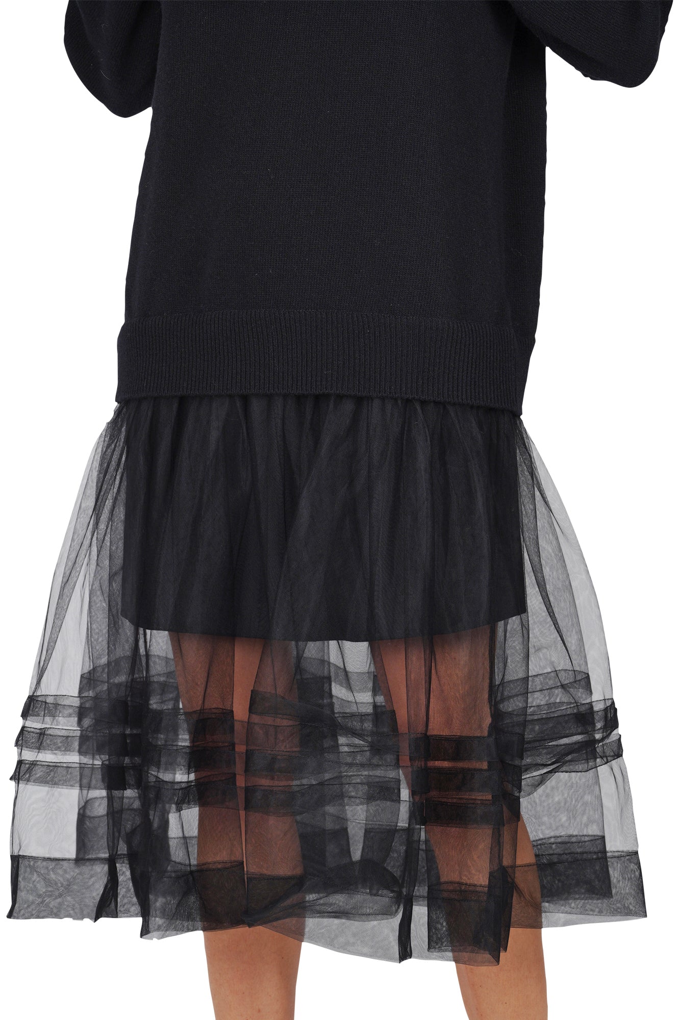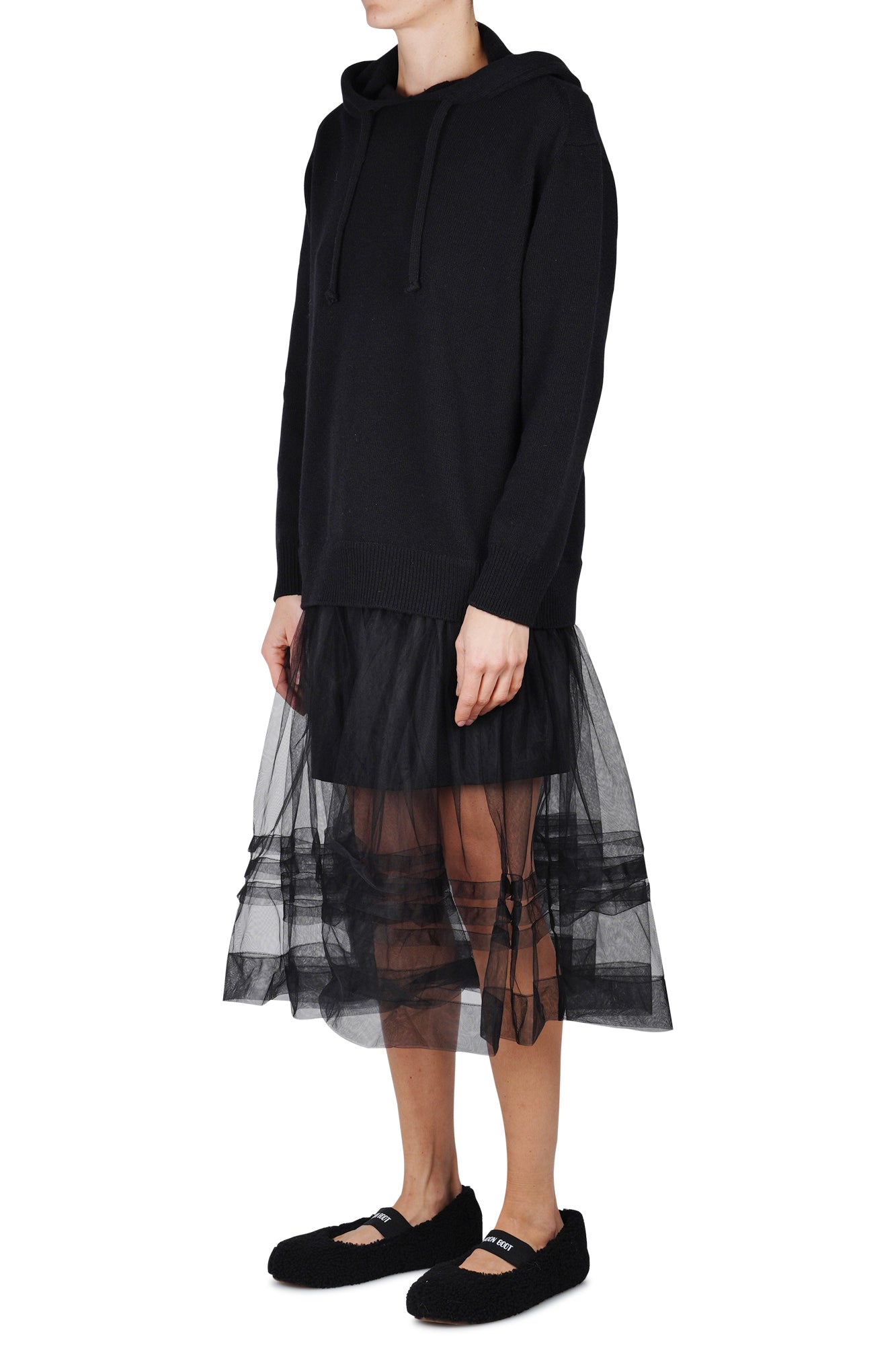 Dettaglio gonna in tulle attaccata al fondo della felpa.