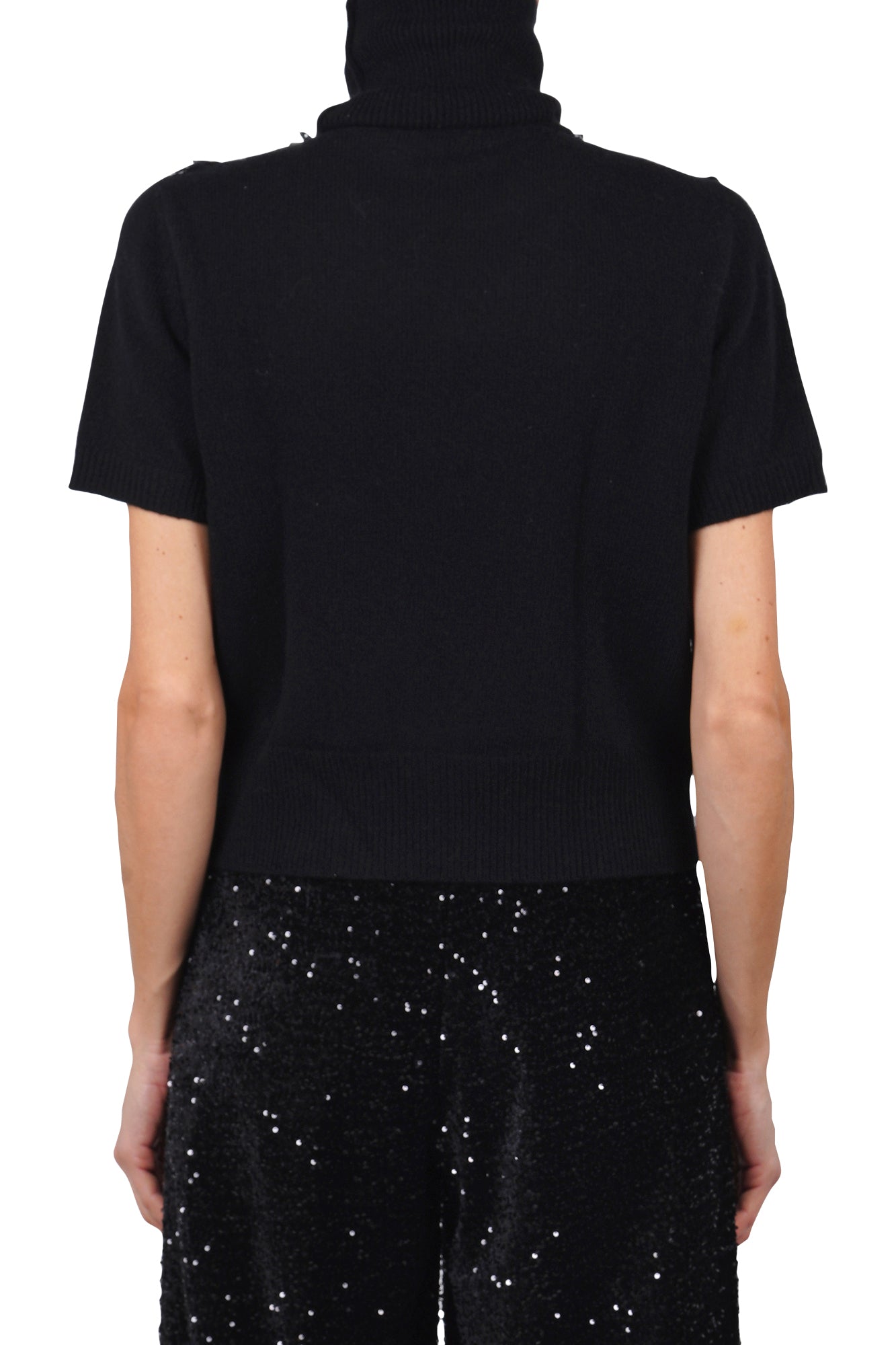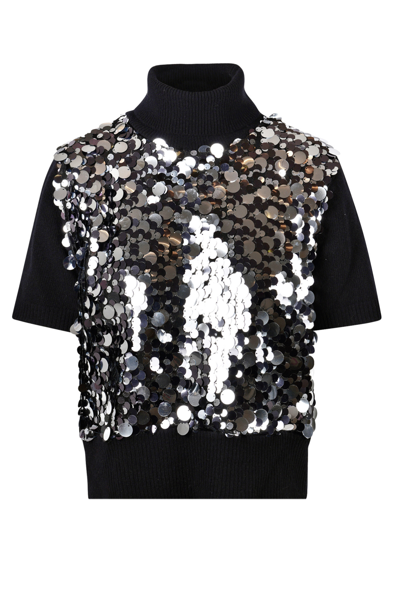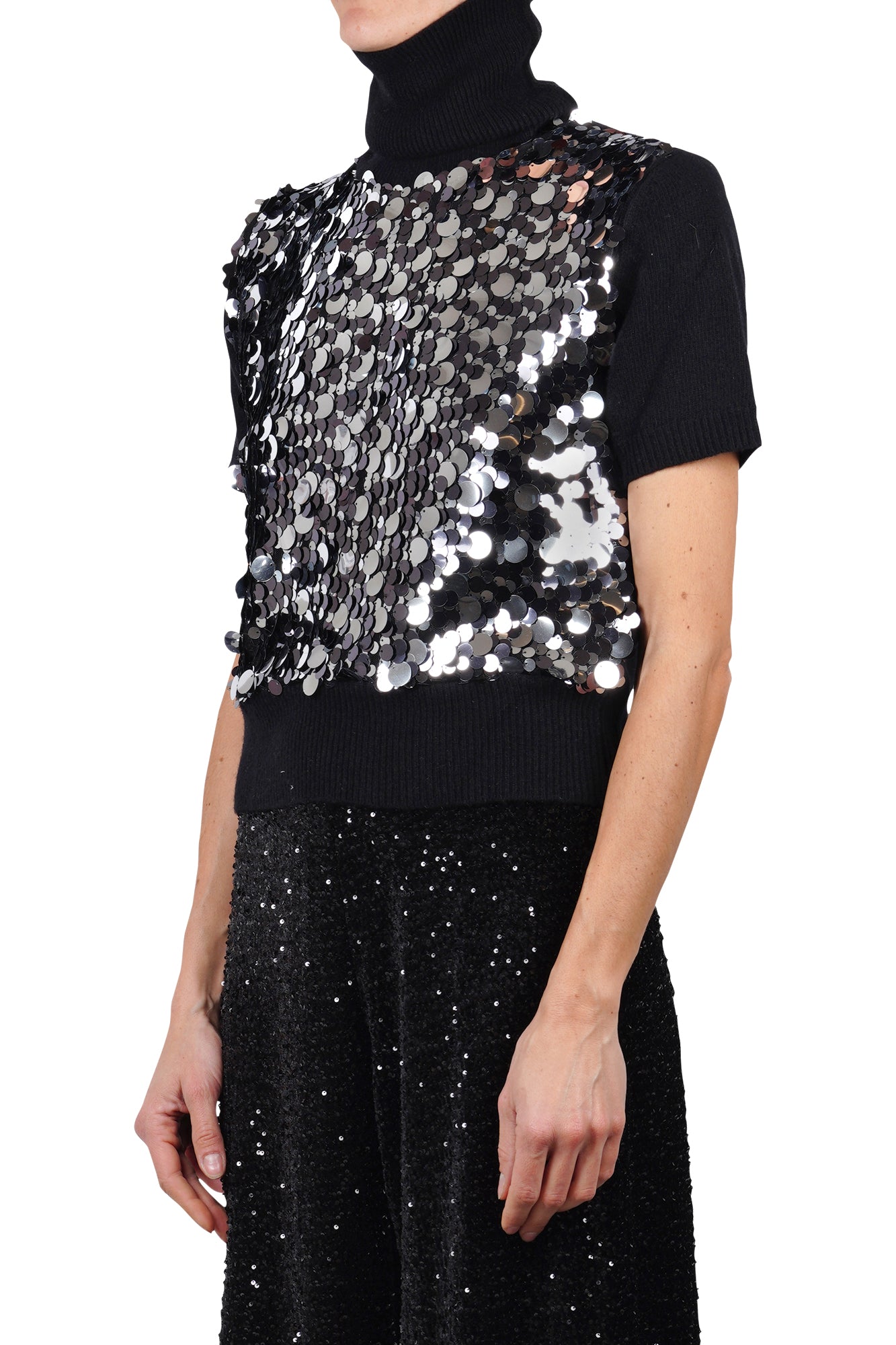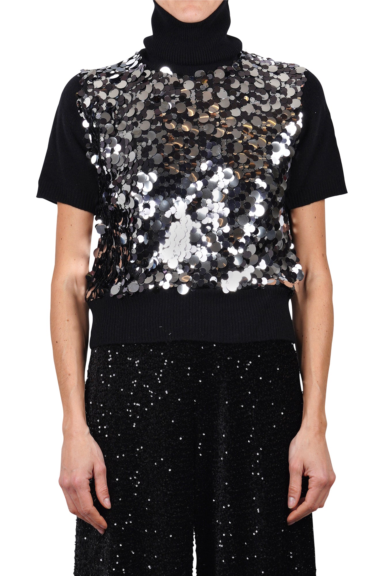 Dolcevita in maglia con paillettes. Maniche corte. Pannello frontale interamente ricoperto da grandi paillettes rotonde. Collo, polsini e fondo in maglia a costine. Composizione: 100% Lana vergine. Vestibilità: regolare. Made in Italy. La modella indossa una taglia M ed è alta 175 cm. Un capo audace e scintillante, perfetto per elevare i tuoi look da sera.