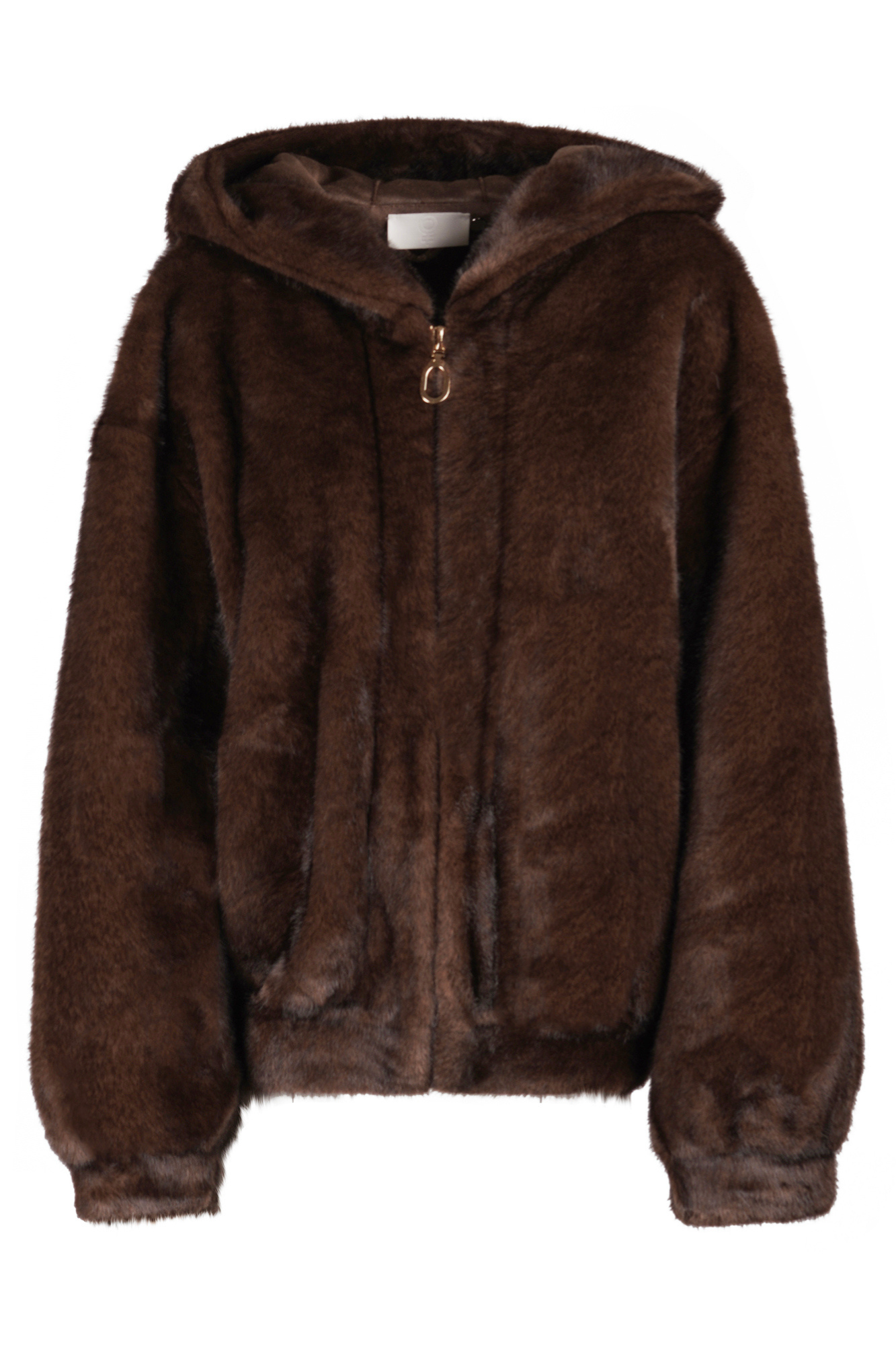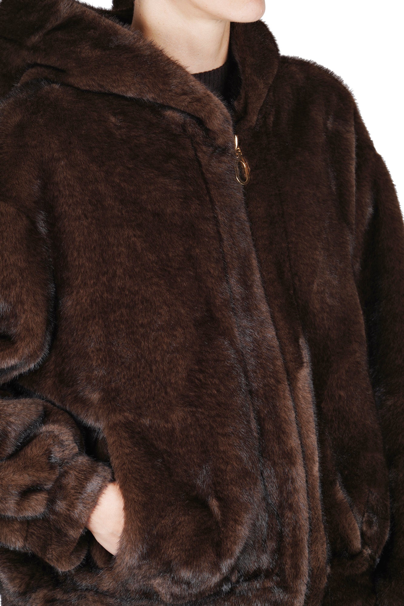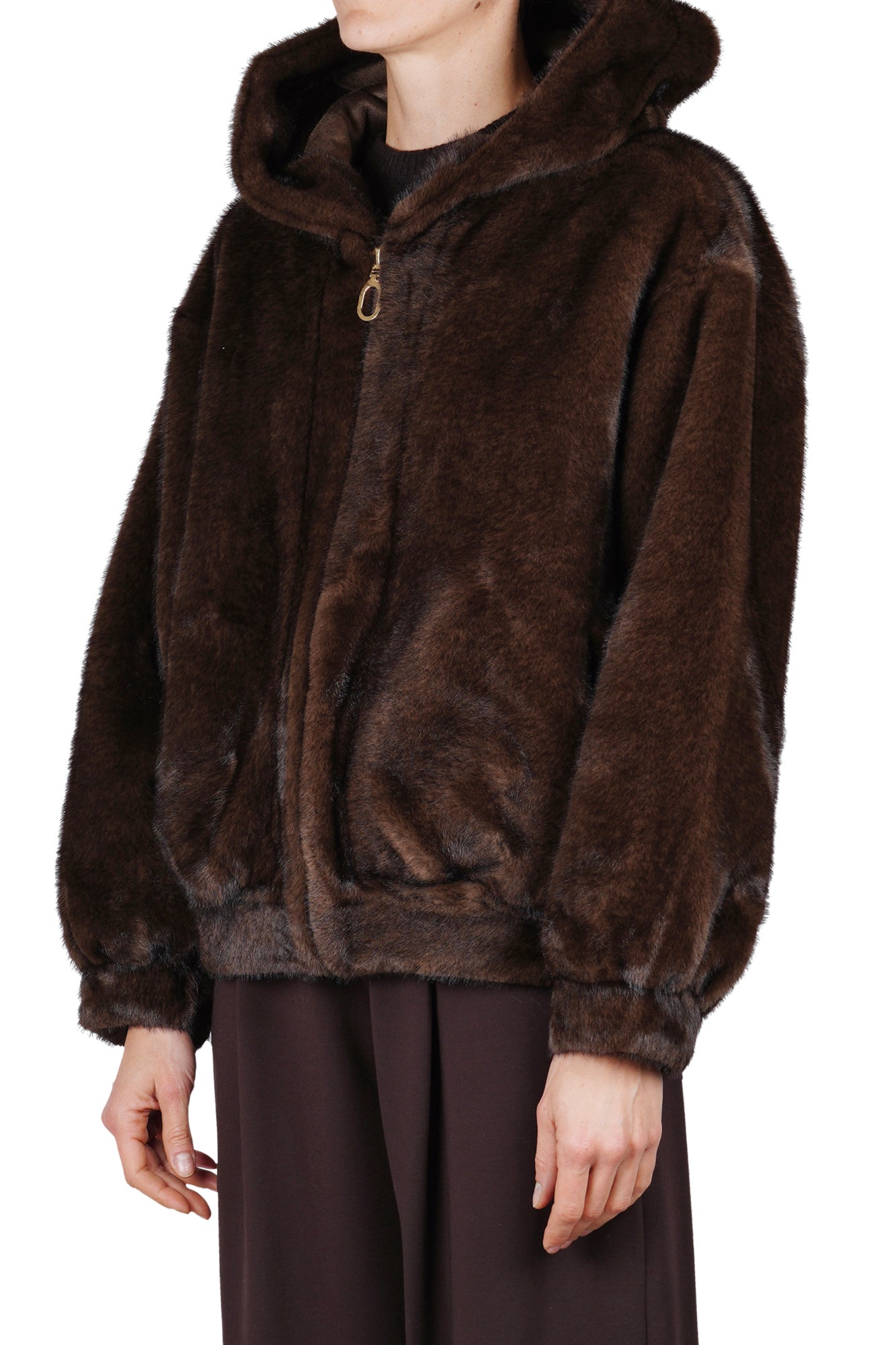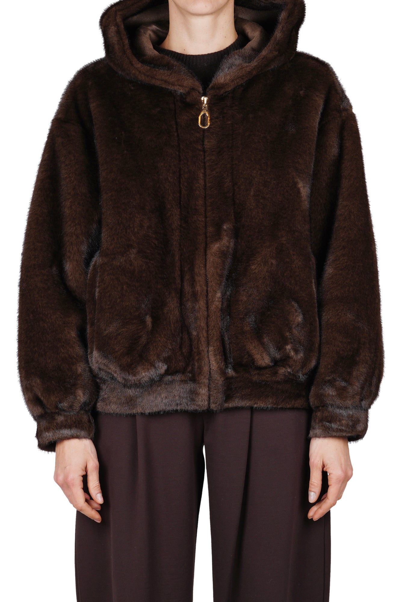 Giacca in ecopelliccia con cappuccio. Chiusura frontale con zip color oro e tiretto ad anello. Maniche lunghe e ampie con polsini elasticizzati. Fondo capo elasticizzato in stile bomber. Tasche laterali a fessura. Composizione tessuto: 100% poliestere. Vestibilità: ampia. La modella indossa una taglia unica ed è alta 175 cm. Il capo perfetto per un look caldo e di tendenza.
