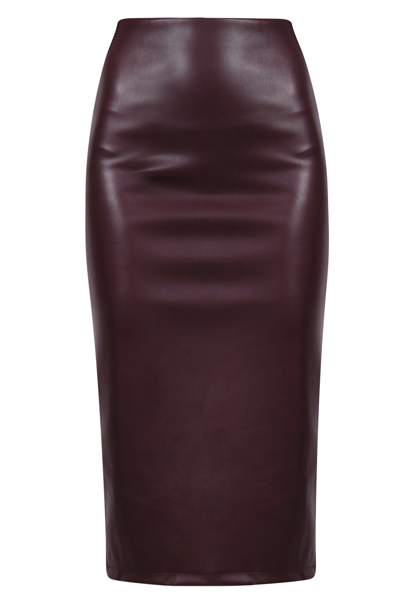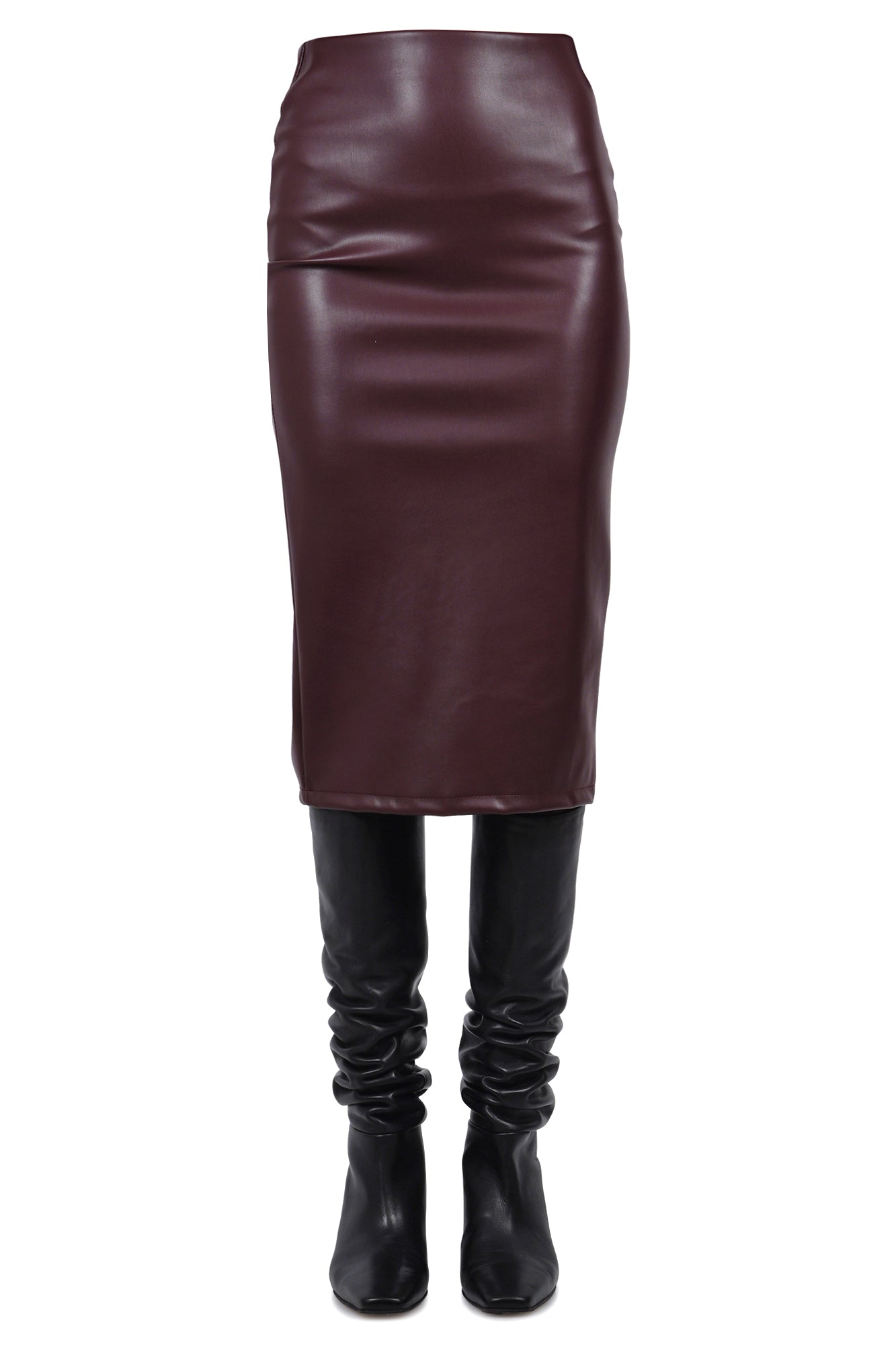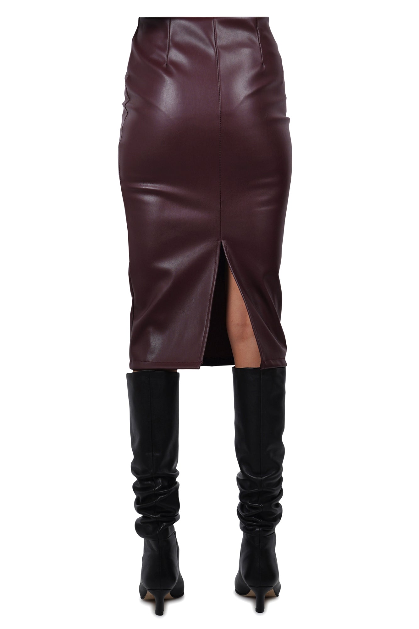 Gonna longuette in ecopelle. Modello a tubino a vita alta. Realizzata in ecopelle con finitura opaca. Spacco centrale sul retro. Composizione tessuto: 100% poliestere. Vestibilità: regolare. Made in Italy. La modella indossa una taglia S ed è alta 175 cm. Perfetta per un look sofisticato e di tendenza, ideale da abbinare a stivali alti o décolleté.