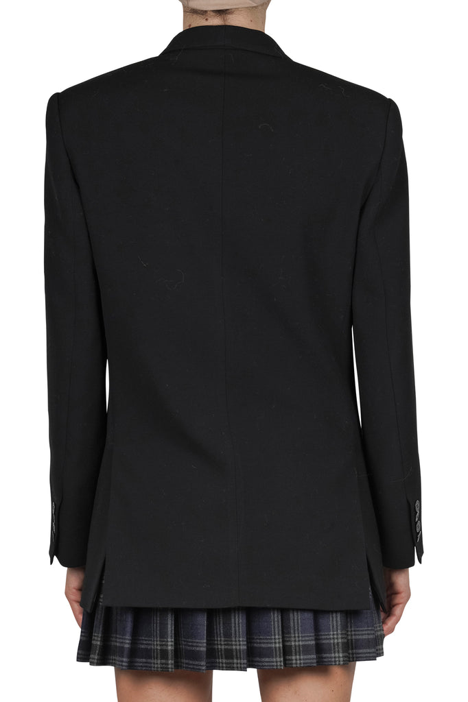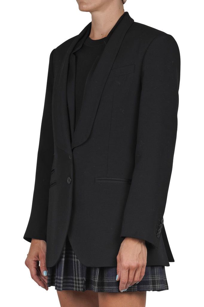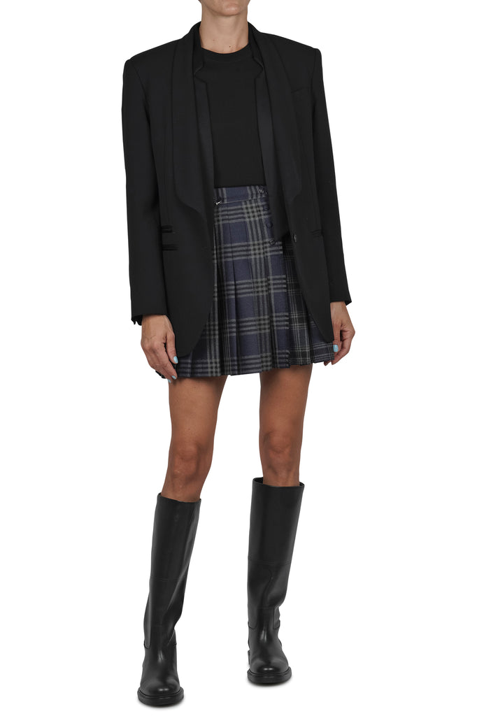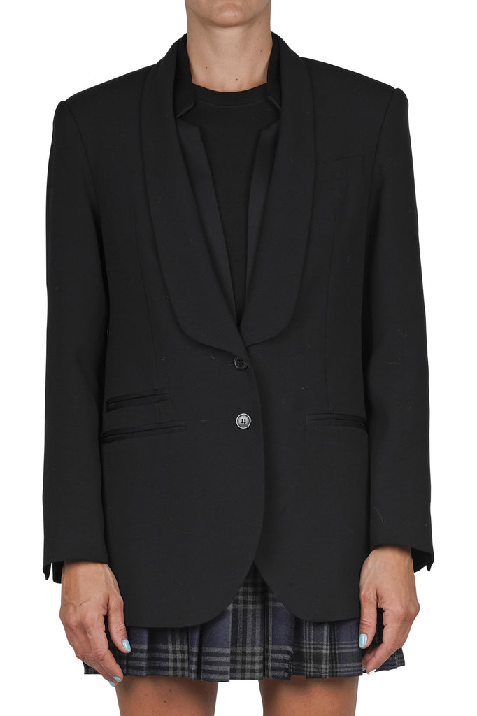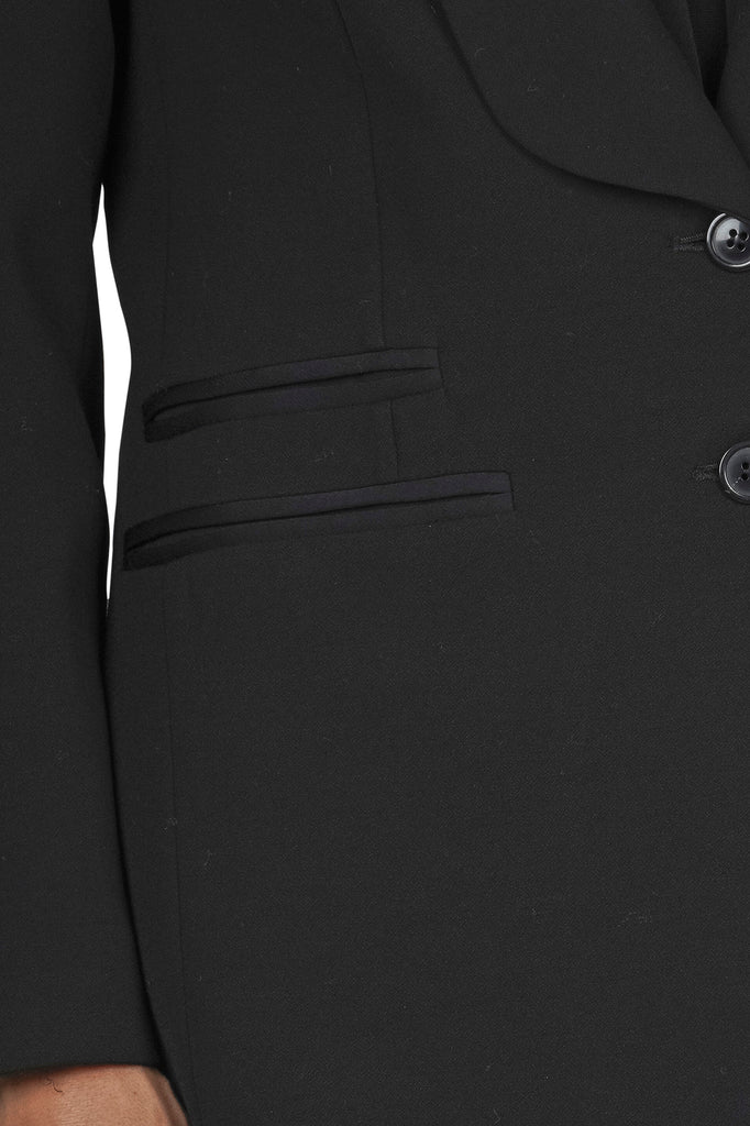 Tasche frontali a filetto con profili in raso.Due spacchi laterali al fondo.