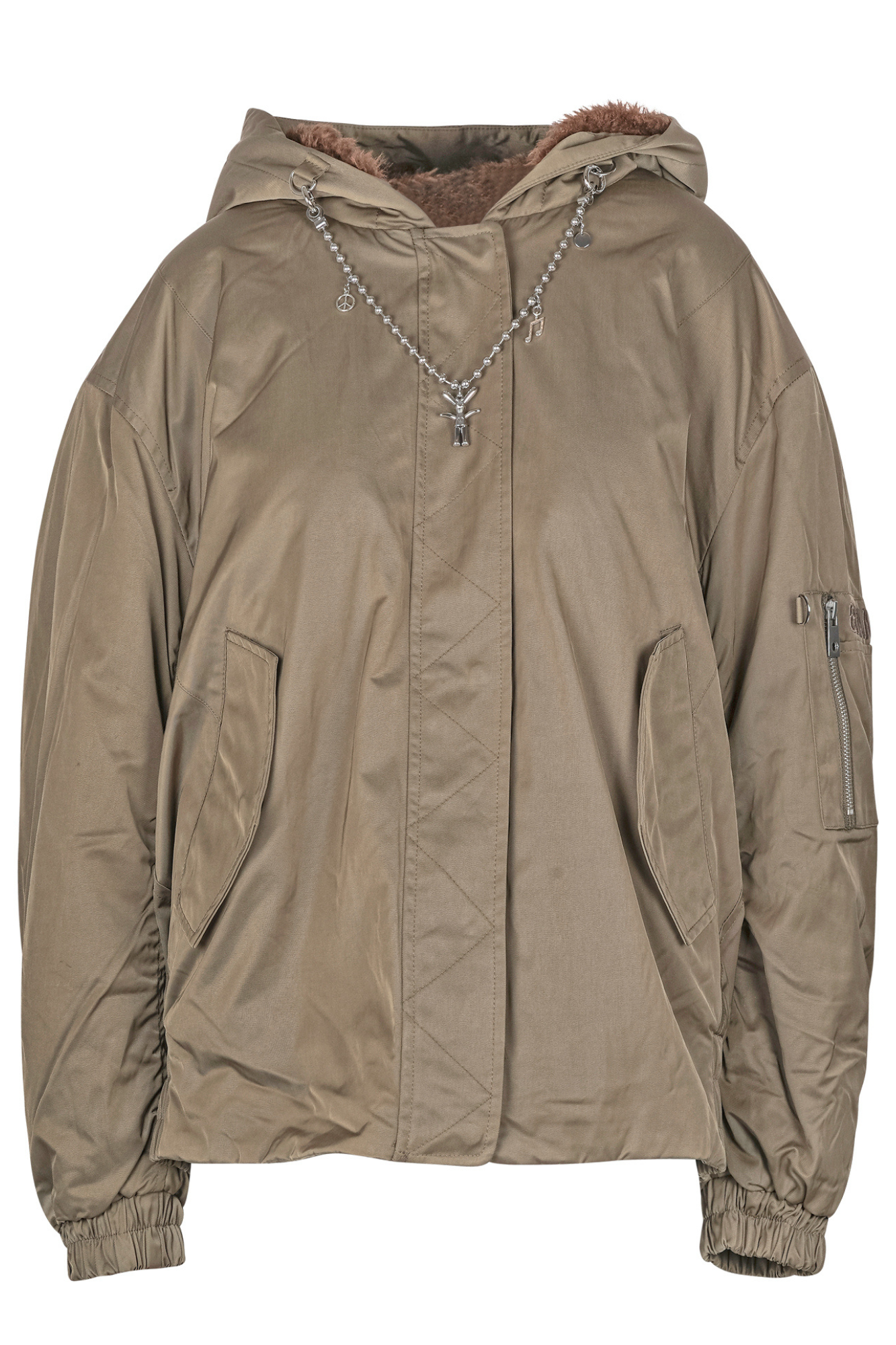 Giacca con ecopelliccia. Cappuccio con ecopelliccia interna. Dettaglio catenina attaccata al cappuccio. Spalle scivolate. Maniche lunghe. Polsini con banda elastica. Chiusura frontale nascosta con bottoni a pressione e zip. Due tasche frontali con patta a punta e chiusura con bottone a pressione. Fondo sul retro con banda elastica. Fodera in eco pelliccia. Composizione tessuto: 65% poliestere, 35% cotone. Composizione fodera: 100% poliammidica Composizione ecopelliccia: 100% poliestere. Imbottitura pudding: 100% poliestere. Vestibilità: ampia. La modella indossa una 2XS ed è alta 175cm. Amiamo questa giacca super rock e confortevole.