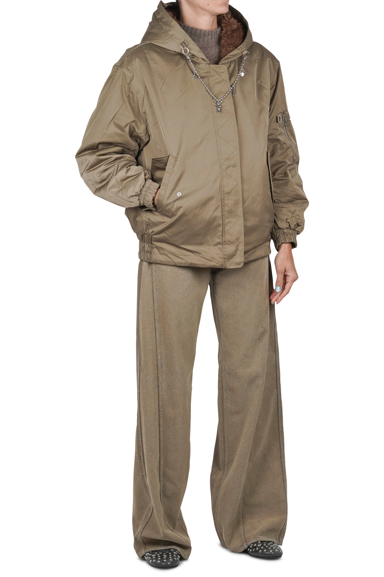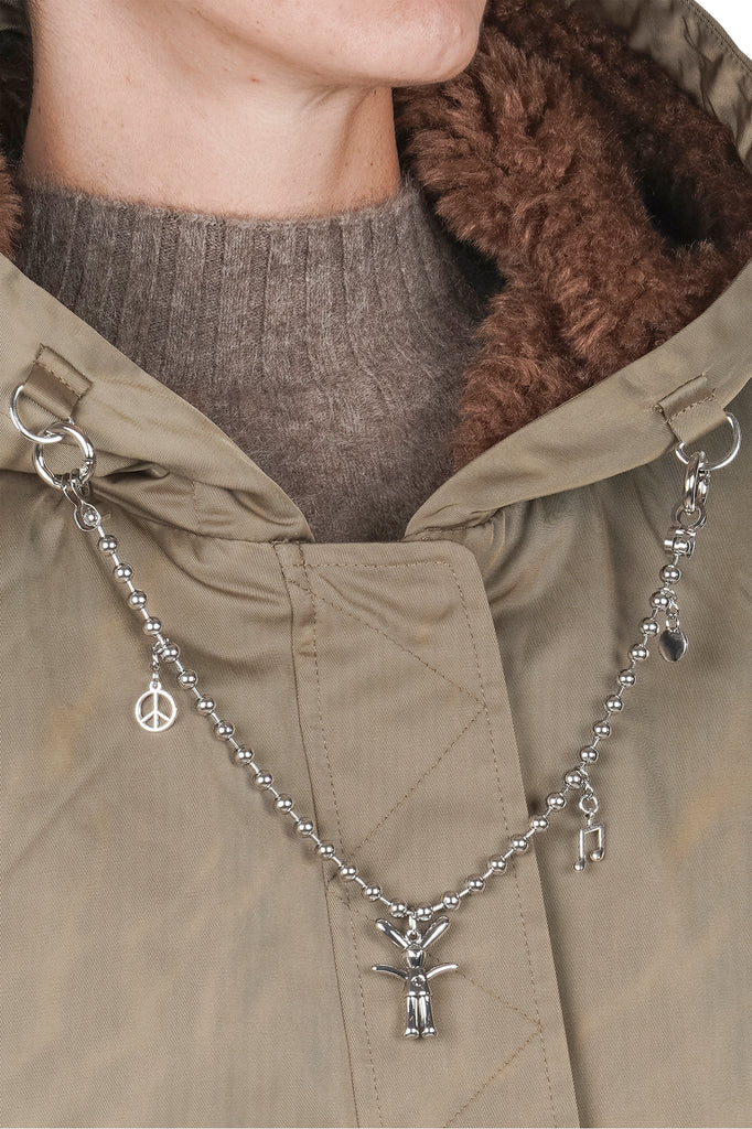 • Dettagli eleganti: la catenina attaccata al cappuccio e le spalle scivolate conferiscono un tocco di stile unico.