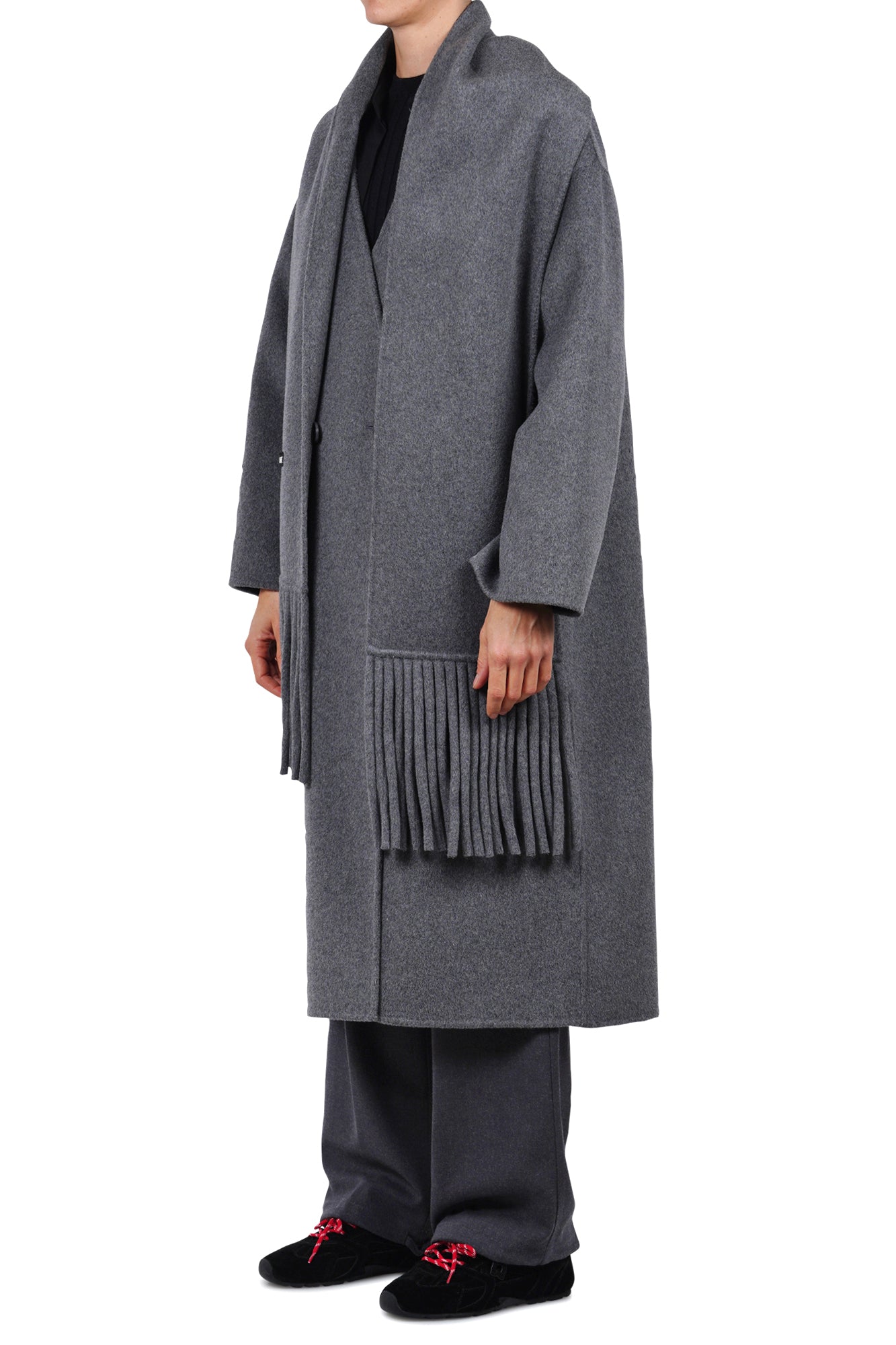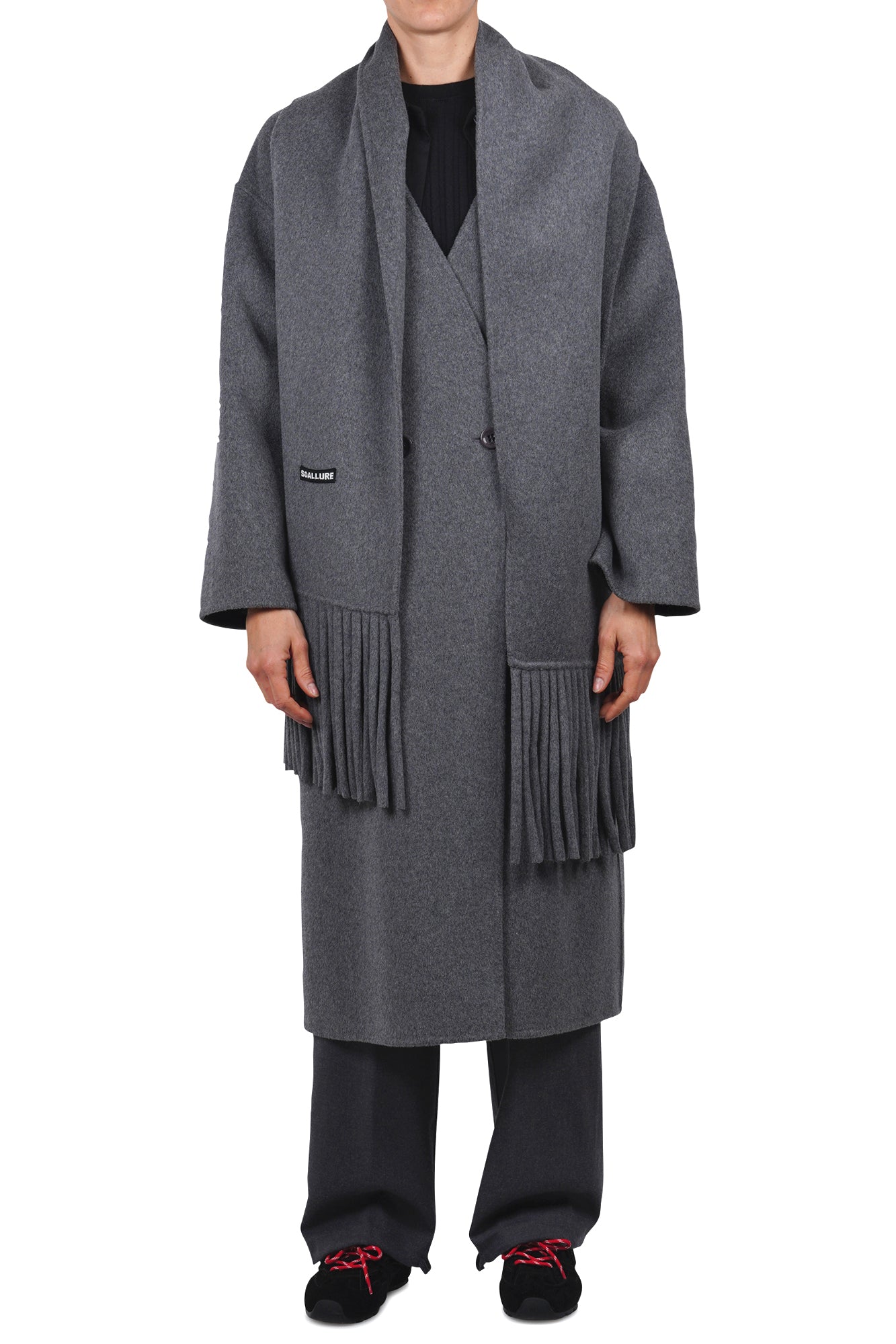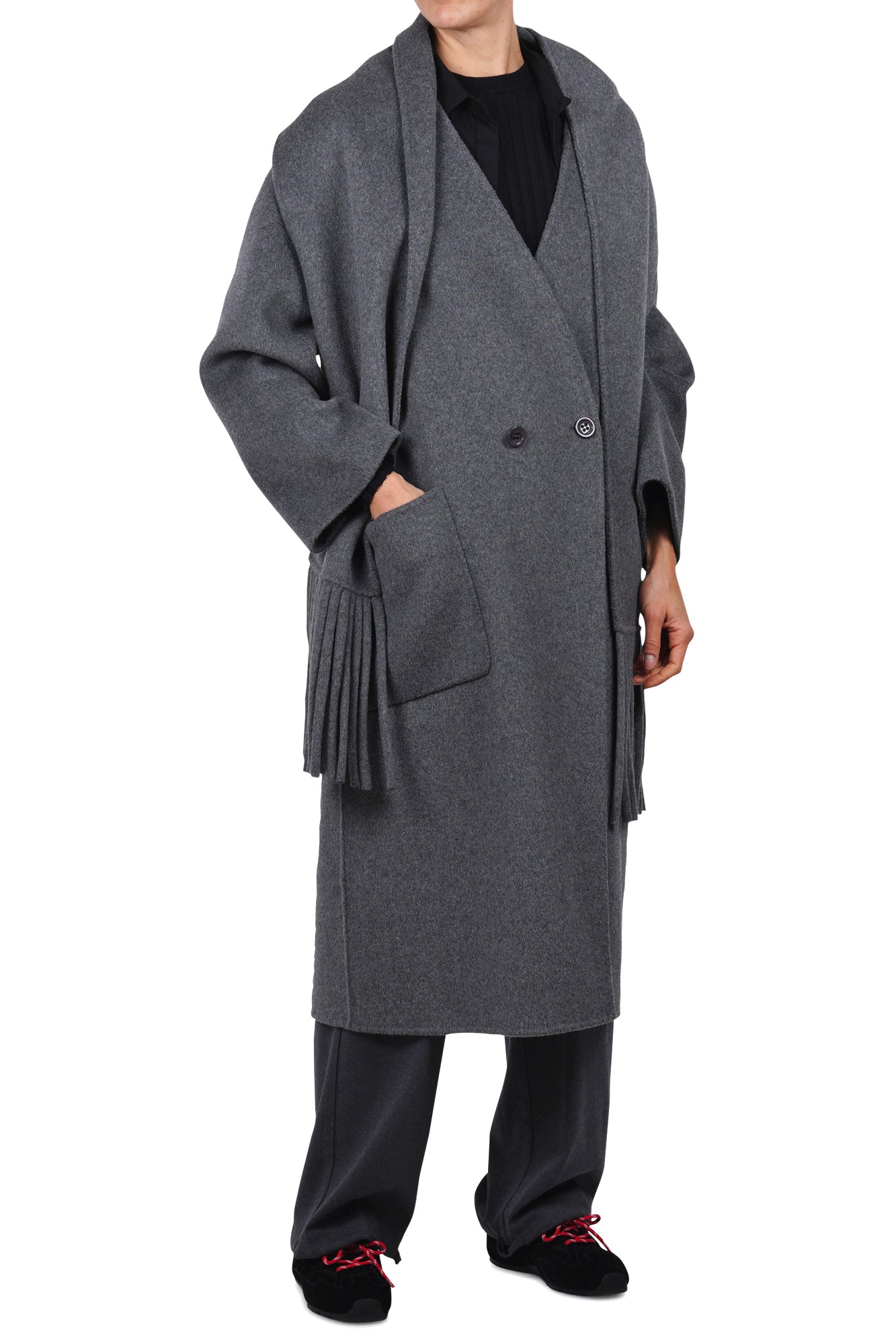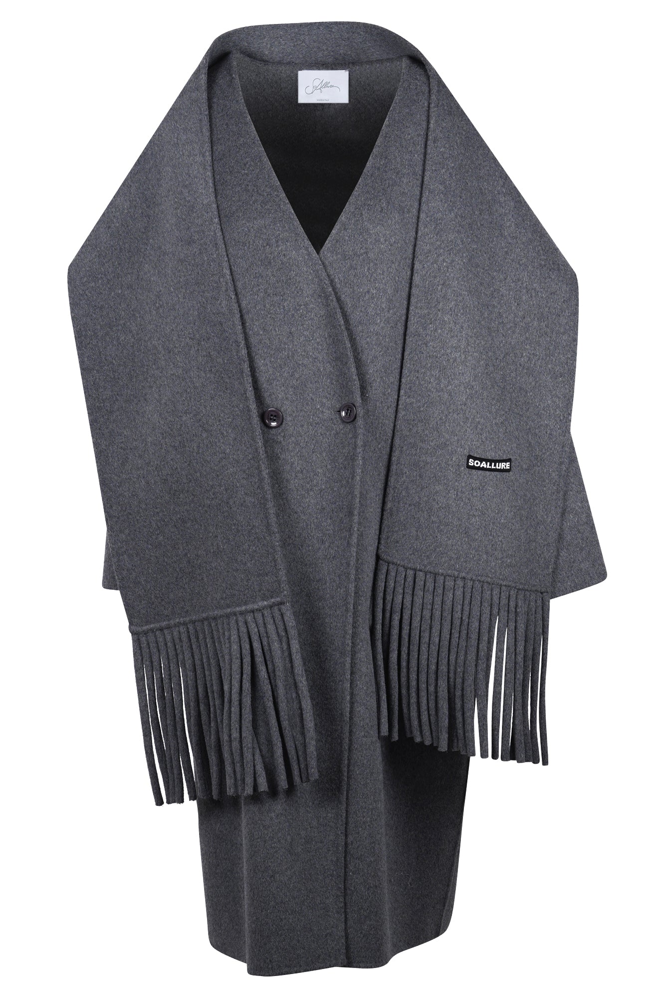 - Dettagli raffinati: dalla chiusura doppiopetto ai dettagli delle frange sulla sciarpa, ogni elemento è curato per un look sofisticato.