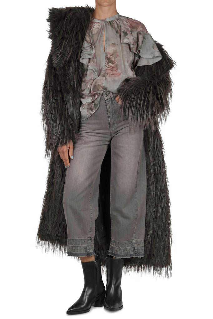 Chiusura frontale con bottone e zip nascosta.