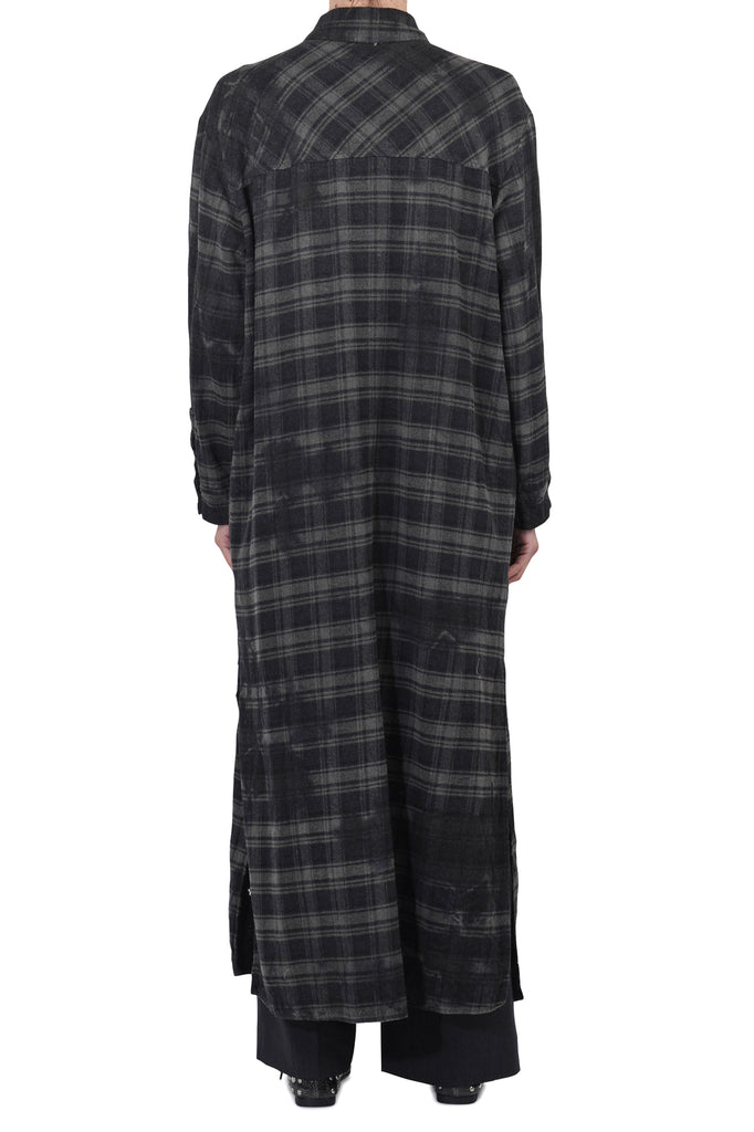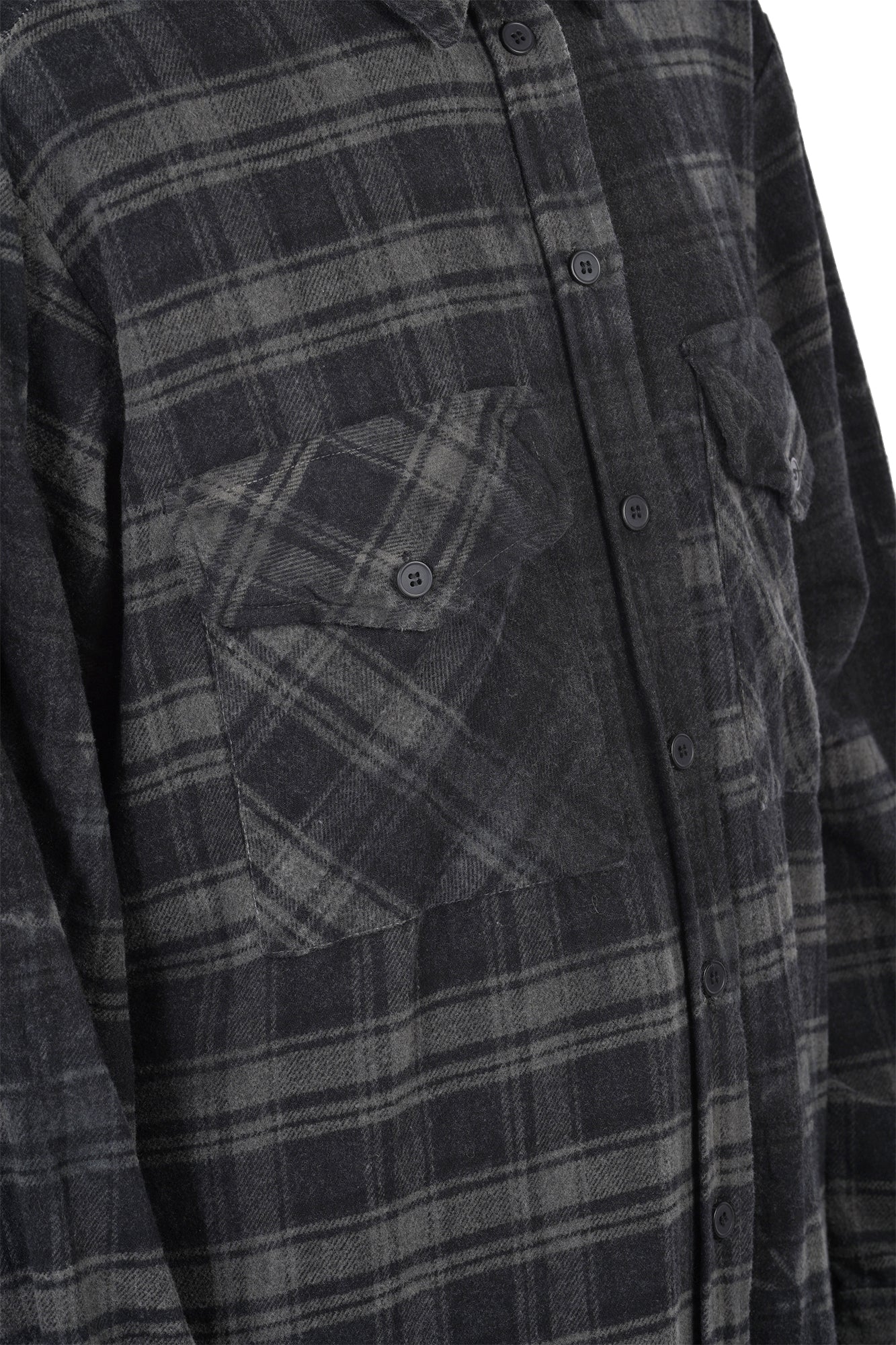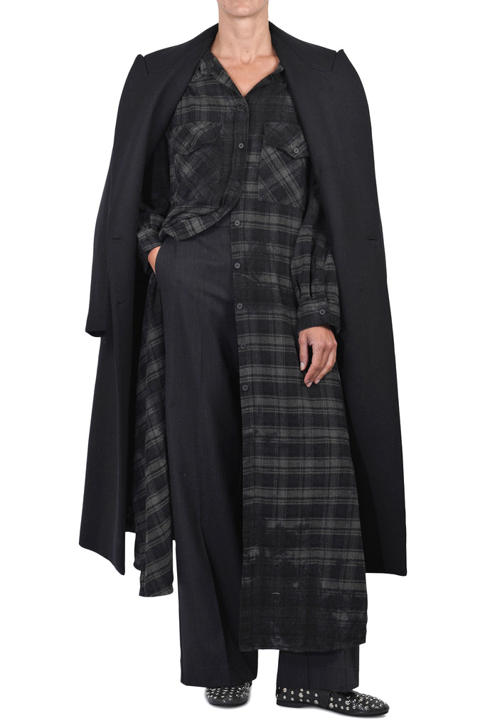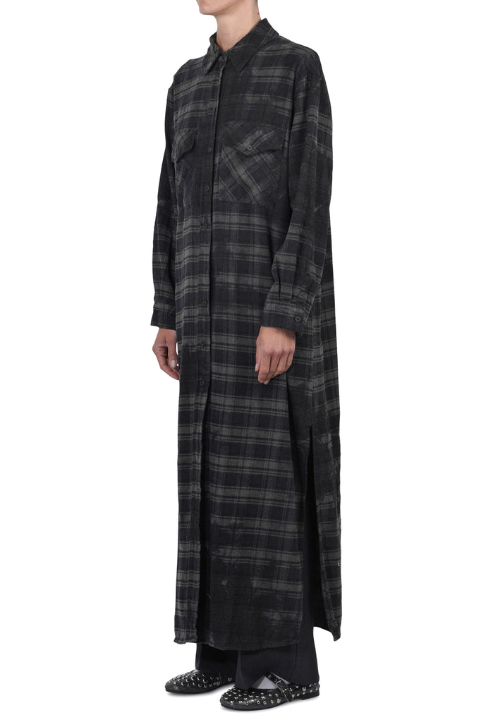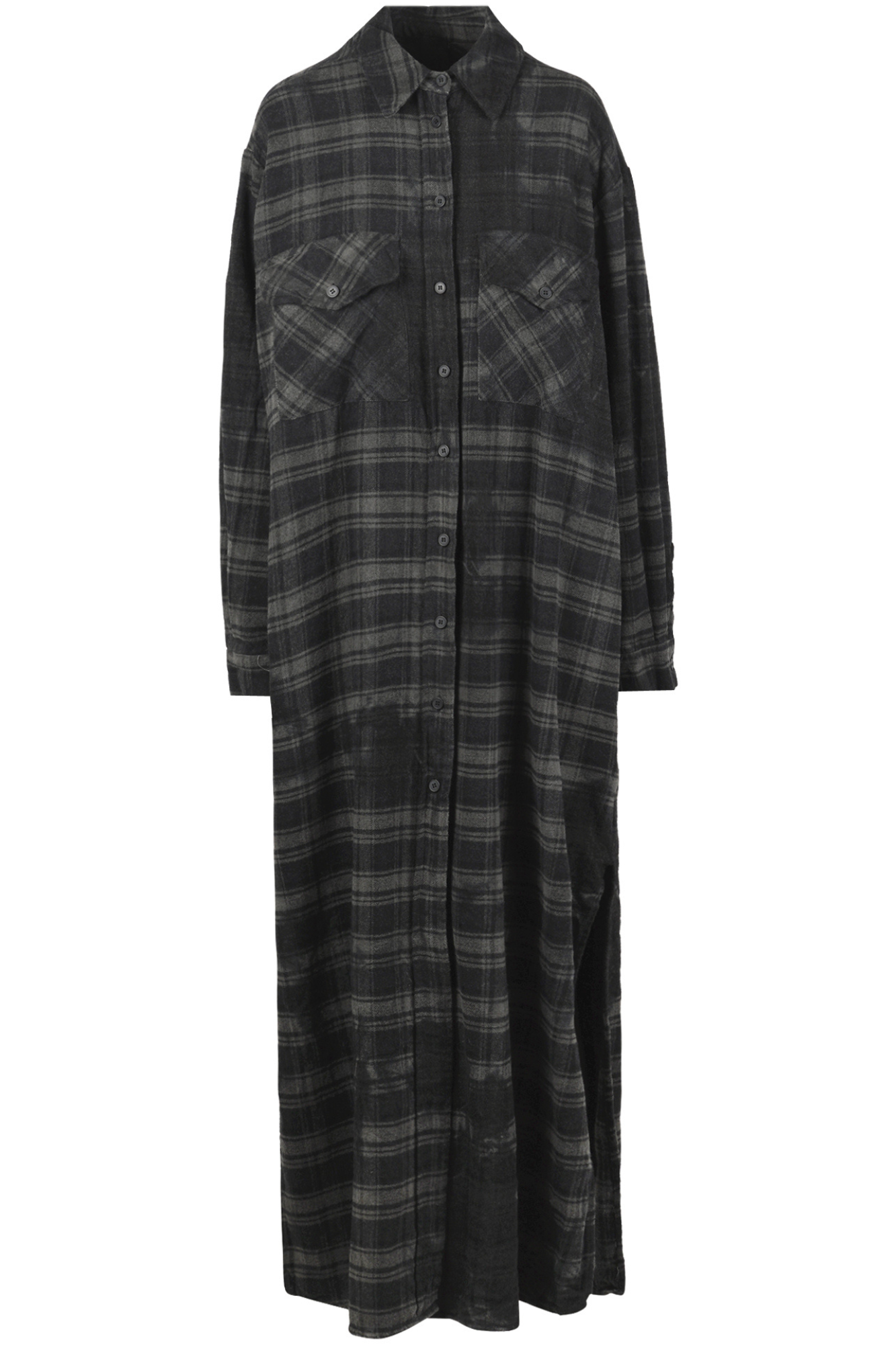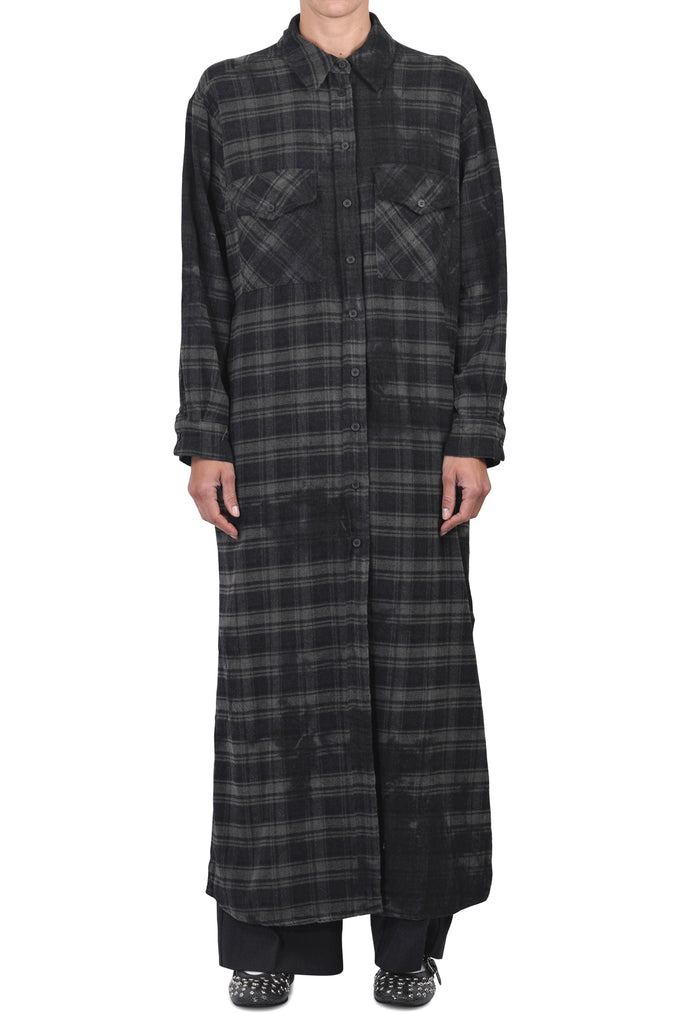 Chemisier in flanella check. Colletto a punta. Manica lunga con polsino e bottone. Tasche sul petto con bottone. Tasche laterali inserite in cucitura. Abbottonatura centrale. Spacchi laterali. Composizione tessuto: 70% cotone, 25% poliestere, 5% altre fibre. Vestibilità: ampia. Made in Italy. La modella indossa la taglia S ed è alta 175 cm. Ci piace la grinta di questo abito abbinato ad un paio di anfibi.