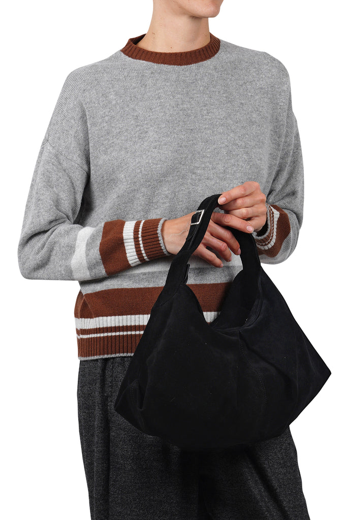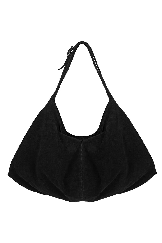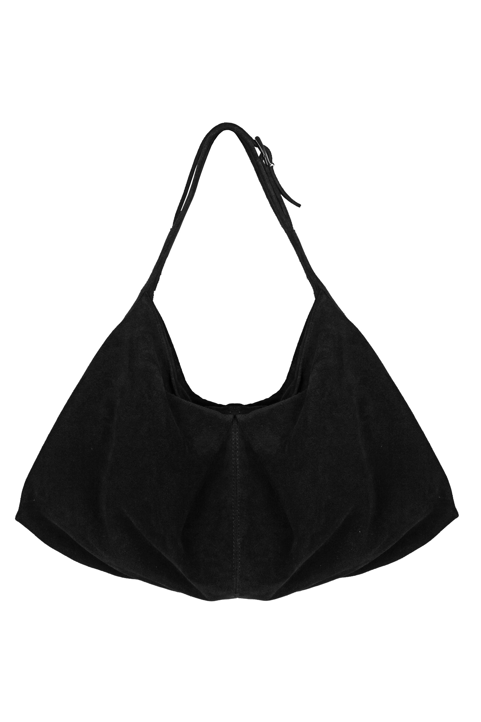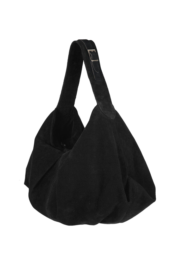 Borsa Fazzoletto piccola in camoscio. Realizzata in morbida pelle scamosciata. Design destrutturato e avvolgente. Chiusura principale con cerniera. Manico singolo ampio per portabilità a spalla. Dettaglio fibbia metallica sul manico. Interno foderato in tessuto. Tasca interna piatta con cerniera. Altezza: 23 cm. Lunghezza: 44 cm. Profondità: 16 cm. Composizione: 100% pelle scamosciata. Made in Italy. La borsa perfetta per aggiungere un tocco di morbidezza e stile boho-chic a qualsiasi look.